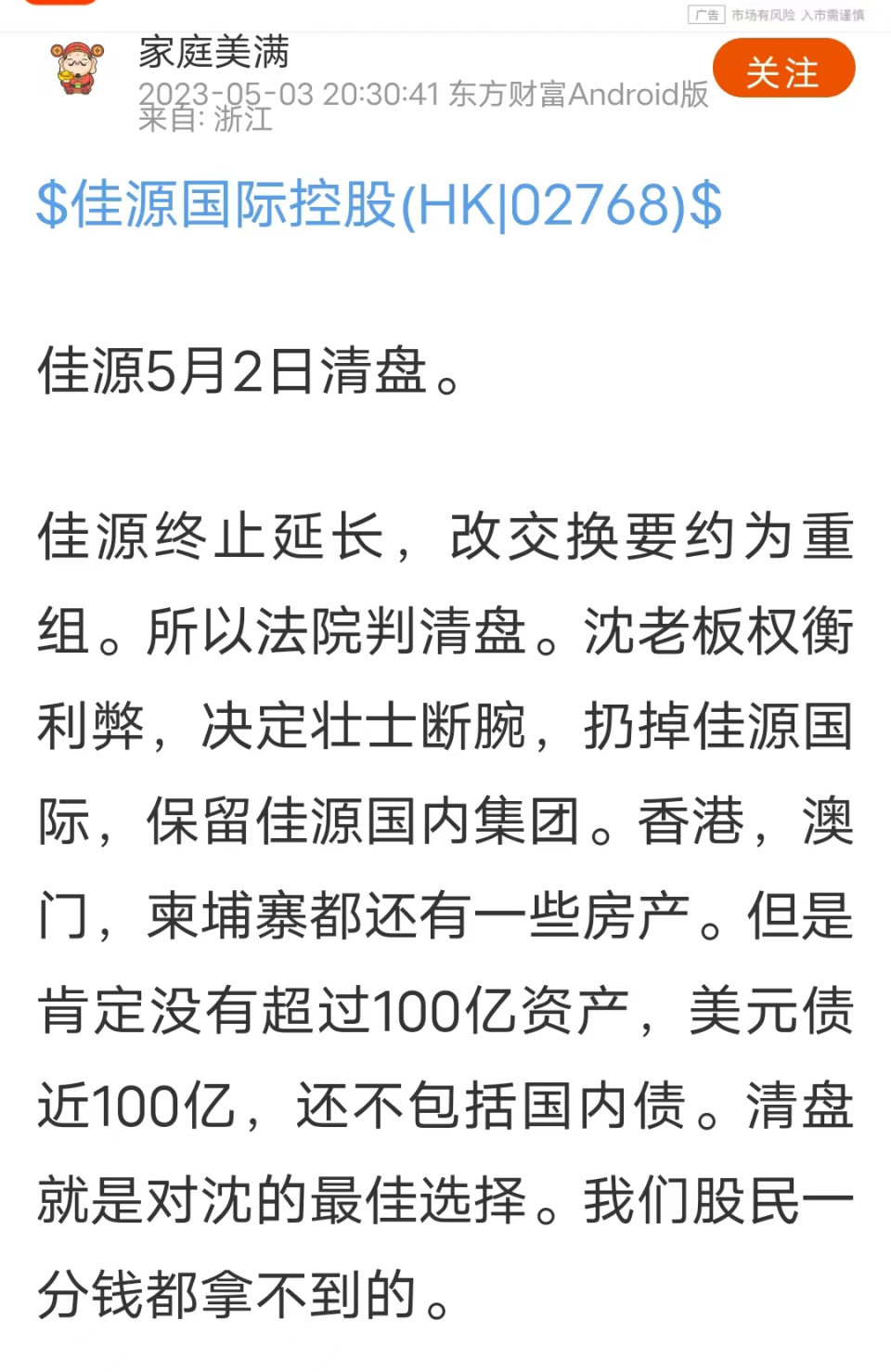 泉源:深蓝财经 作者:杨波 第一家被逼迫清盘的上市房企,来了! 本轮房企债务危急以来,恒大、融创、嘉世国际(阳光城)、格式年、佳源国际等上市房企先后被呈请“清盘”。 然而,万万没想到的是,第一个被正式裁定清盘的上市房企,居然是它。 1 上市房企被“清盘” 5月2日,上市房企佳源国际(HK.02768)传来坏消息。香港法院颁布“清盘令”,公司需清盘,以便归还逾期的1450万美元(折合约1.13亿港元)债务。 据《乐居财经》报道,对于突如其来的裁定,佳源国际方面也“一脸懵”。由于佳源国际此前的重组方案已经有80%的债权人“同意”,但没想到法院会直接判令“清盘”。 据悉,这笔债务客岁到期后,佳源国际不停与债权人探究,渴望妥善办理。但是债权人渴望尽快拿到钱,于是客岁9月向法院提出清盘呈请。 进入法院步伐后,佳源国际方面多次申请清盘呈请聆讯延期。从本年3月1日,延期到3月6日,末了延期到5月2日。 然后5月2日直接裁定“清盘”。由于法官以为,公司没有“作出富足积极来证实不清盘是正当公道的”;别的,固然80%的债权人同意重组,但是重组筹划不具体,“只是一个想法而已”。 事已至此,佳源国际另有上诉或申请延期实行的机遇。 但是,“清盘令”一经颁出,根本上很难扭转格局了。除非企业先把这笔钱还了。否则,清盘会进入实际实行阶段,暂时清盘人会接受公司,处理资产,用于归还债务。 这也就意味着上市公司“玩完了”。 2023年第一家被逼迫清盘的上市房企,至此诞生。 2 “时间换空间”梦碎 佳源国际究竟有没有在躺平,乃至是摆烂? 佳源国际最早爆出活动性困难是客岁3月份。其时,佳源国际发行的定融产物出实际质性违约,金额约5000万元。5月18日,佳源国际股价“闪崩”,跌幅高出41%,被迫告急停牌。5月27日复牌后,股价再跌39%。 以后,佳源国际开始积极自救。 起首是筹划甩卖45亿股佳源服务股权,其时谈的买家是金科。金科都自身不保了,很快这笔买卖业务无疾而终。反面,佳源国际卖掉了盐城的在建商住综合体项目,回笼资金约8.79亿元。然后与中国信达互助,资助佳源国际盘活存量资产、优化资源设置、改善活动性等。 以后,根据公开资料,佳源国际就没有太多“积极”出售资产的动作了。由于“积极”出售,意味着大幅度折价,意味着割肉。 疼啊! 客岁8月26日,佳源国际管理层与投资人开了一场座谈会。会上,佳源国际老板沈天晴动情地说“我面临各人,感到心田悲凉”。他还说,“渴望跟投资人一起,用时间换空间”,“佳源会对峙对各人负责态度,做到不躺平”,“渴望投资人给佳源机遇”。 然而,这只是精美的愿望罢了。 佳源国际期盼的“时间换空间”,迟迟等不来。资料体现,本年第一季度,佳源国际的条约贩卖金额约12.89亿元,客岁同期为45.2亿元,同比降落71.48%。 佳源国际先后3次延期清盘呈请聆讯,大概是渴望借助楼市的回暖,实现正现金流,从而化解债务危急。 如今,佳源国际迟迟没有发布2022年年报数据。缘故起因是“公司多少紧张员工(特殊是财务陈诉单元者)近来辞任”,以及子公司更换核数师。 这种账,简直不好做。 3 沈老板“弃卒保帅”? 佳源国际究竟有没有力气还款? 究竟上,在佳源国际2020年度中期业绩会,沈天晴曾亲身透露,整个团体的地产板块,约六成的地产业务在他个人的公司名下。其时还答应,“乐意将这些资产,将来渐渐注入到上市公司”。 根据此前的一份资料体现,佳源团体旗下的申城团体、杭城团体、安徽团体、都城团体及文旅团体五个地产团体业务均未进入上市公司板块。 以是,沈天晴假如乐意救“佳源国际”,应该是有本领的。 究竟,另有很多资产,在他个人的控制之下。 但是,面临深陷泥潭的上市公司,他乐意断送个人长处,救济上市公司吗? 有股民在股吧分析指出,“沈老板权衡利弊,决定壮士断腕,抛弃佳源国际,保存佳源国内团体”,“清盘就是对沈的最佳选择”,但是股民就惨了,一分钱都拿不到。 据《风财讯》援引投行人士的观点以为,“非必不得已法院很少下令清盘”,一旦颁布,纵然停业公司大概只是房企的某个境外主体、或是规模有限的债权人,也无法忽视清盘与驱逐对公司品牌、信誉和境内项目康健开展造成的负面影响。 如今看来,沈老板大概率要“弃卒保帅”了! 4 危急连续,警惕啊 到了本年,很多“暴雷”房企渴望的“时间换空间”的空想,大概要碎掉了。 由于这大概是个“伪命题”。 据中指研究院数据体现,1-3月,TOP100房企贩卖总额为17589.5亿元,同比增长8.2%,是2022年以来初次实现增长。然而,房企之间分化严肃加剧,有过或传出过债务危急的民营房企,贩卖额险些悉数下滑。比如: 融创中国,同比下滑59%; 旭辉团体,同比下滑26%; 雅居乐,同比下滑20%; 新城控股,同比下滑30%; 世茂团体,同比下滑33%; 中南置地,同比下滑25%; ... 头部的保利、中海、华润、招商、绿城、龙湖、华发、建发等房企贩卖额大幅度增长,行业会集度进一步增强。 但有过或传出过债务危急的民营房企的房子,就没人买了。 那么,暴雷的房企发展到如今,好像就陷入了一个“死循环”。债务违约→导致购房者担心→导致贩卖不力→进一步导致还款困难,然后继承暴雷? 在这种格局之下,迟迟拿不到钱,又看到贩卖回暖的债权人,起首崩不住了。 资源市场也很难淡定了。 比如“新力控股”成为本年第一个被港交所退市的上市房