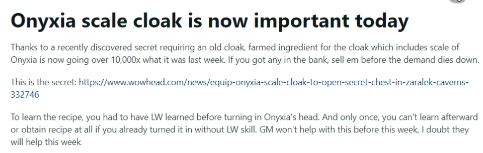 《魔兽天下》更新10.1之后,一件香草年代的装备近来被炒起来,就是“奥妮克希亚鳞片披风”。 提及这件披风,应是不少金团玩家的深刻影象。它由黑龙MM的皮制成,用来防护奈法利安开场的吐息,BWL金团总有忘记换上它而被罚款的家伙。 披风再次发热,是由于在新版本的查拉雷克洞窟(坐标28.8、47.5)发现了一个被暗影烈焰围绕的箱子,只有穿着这件披风才气通过。开箱子可得到一个叫做“炽燃的暗影烈焰余烬”的玩具,它将施法者包裹在暗影烈焰中,连续10分钟,比力有视觉效果。 舆图位置: 玩具效果: 奥妮克希亚鳞片披风是60年代的装备,许多人都扬弃了。它必要奥妮克希亚的皮,以及300点经典制皮技能。以是当彩蛋被发现后,商机就来了,一些未绑定的斗篷成了拍卖区的抢手货,具体因服务器而异,有人说他们服卖到了2万金,供不应求,有人说不到9令媛,披风滞销救救贩子。 此话题也在国外的Reddit论坛连续升温,玩家Little_Leafling说在他们服,披风已经断货了,他刚以10万金的代价试投了一件,没想到真的卖出去了,如今的市场价大概在4万金左右。另一玩家Nijrem说他近来卖了一件2.5万金的,销路很好,于是又赶工了两件,代价涨到了4万。 总之,时机有限,有存货的朋侪赶紧脱手了。 |