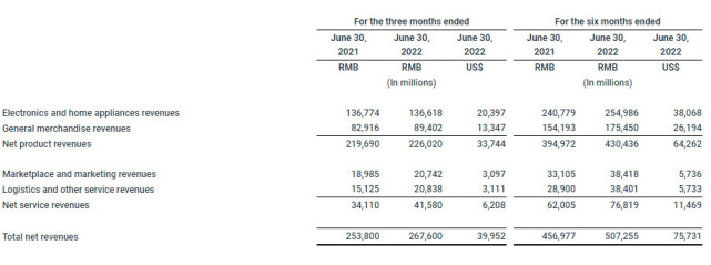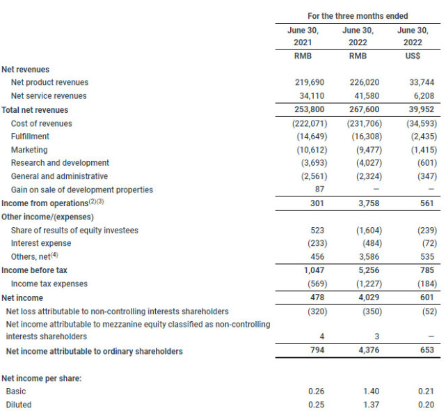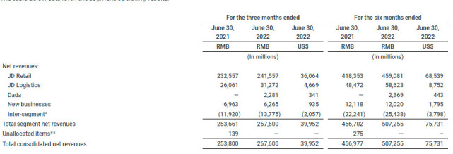 腾讯科技讯 8月23日消息,京东周二盘前发布了该公司停止2022年6月30日的第二季度未经审计财报。财报表现,京东第二季度净营收为2676亿元(约合400亿美元),同比增长5.4%;归属京东平常股股东的净利润为43.8亿元(约合7亿美元),较客岁同期的7.9亿元增长454%。 划重点: Array 一、营收与净利润双超预期 1.净营收同比增长5.4% 京东第二季度净营收为2676亿元(约合400亿美元),较客岁同期的2538亿元增长5.4%。京东第二季度净营收超出市场预期。汤森路透的观察表现,市场分析师此前均匀预计,京东第二季度净营收为384.7亿元。 在京东第二季度的营收当中,来自服务业务的净营收为416亿元(约合62亿美元),同比增长21.9%;来自产物的营收为2260亿元(约合337.4亿美元),同比增长2.9%。 2.净利润同比增长454% 第二季度归属京东平常股的净利润为44亿元(约合7亿美元),相比之下客岁同期的净利润为7.9亿元。不按照美国通用管帐准则,第二季度归属京东平常股的净利润为65亿元(约合10亿美元),相比之下客岁同期的净利润为46亿元。 京东第二季度每股美国存托凭据摊薄收益为2.74元(约合0.41美元),相比之下客岁同期每股美国存托凭据摊薄收益为0.50元。不按照美国通用管帐准则,京东第二季度每股美国存托凭据摊薄收益为4.06元(约合0.61美元),超出华尔街分析师预计的0.40美元,相比之下客岁同期每股美国存托凭据摊薄收益为2.90元。 3.现金流和运营资源 停止2022年6月30日,京东持有的现金和现金等价物、限定性现金、以及短期投资总额为2068亿元(约合309亿美元),停止2021年12月31日为1913亿元。 京东第二季度用于业务活动的净现金为336.7亿元(约合50.3亿美元),相比之下客岁同期为288.9亿元;自由现金流为300.0亿元(约合44.8亿美元),相比之下客岁同期为295.2亿元。 4.年活泼用户数量增长 在停止2022年6月30日的12个月中,京东年活泼客户总数到达5.808亿,较停止2021年6月30日的5.319亿人增长9.2%。 5.高管点评 “京东依附极具韧性的商业模式,行业领先的供应链本领和高效的运营,在布满寻衅的外部情况中一连交付了妥当的季度业绩,”京东团体首席实行官徐雷体现,“我们很高兴地看到京东一向秉持的极致用户体验,和对天下各地社区和企业的倾力支持,转化成为我们日益强化的用户心智、不停提升的用户粘性和一连扩大的用户规模,特殊表现在焦点零售业务。我们将一连通过供应链底子办法,高效服务互助同伴、用户和社会,而且对峙创新以服务中国的恒久发展。” 京东团体首席财政官许冉体现:“我们很高兴在布满寻衅的时期实现了逾越行业程度的营收增长,以及康健的红利本领和现金流。我们对财政规律和运营服从的器重,使我们可以大概以股票回购的情势以及在本季度发放的特殊现金红利往返报股东。我们将继续专注于创造丰厚的股东回报,同时保持对恒久投资的答应。” 二、财政总结 1.服务业务营收高速增长 京东第二季度净营收为2676亿元(约合400亿美元),较客岁同期的2538亿元增长5.4%,超出华尔街分析师预计的384.7亿美元。京东第二季度净营收同比增长受以下因素影响: 第二,京东第二季度净产物营收为2260亿元(约合337.4亿美元),较客岁同期的2197亿元增长2.9%。此中,京东第二季度来自电子产物和家电业务的营收为1366亿元(约合204亿美元),相比之下客岁同期为1368亿元;来自日用百货业务的营收为894亿元(约合133亿美元),相比之下客岁同期为829亿元。 第二,京东净服务营收为416亿元(约合62亿美元),较客岁同期的341亿元增长21.9%。此中,市场和营销营收为207亿元(约合31.0亿美元),相比之下客岁同期为190亿元;物流和其他服务营收为208亿元(约合31.1亿美元),相比之下客岁同期为151亿元。 按照业务分别,京东零售第二季度营收为2416亿元(约合361亿美元),较客岁同期的2326亿元增长3.9%;京东物流第二季度营收为313亿元(约合47亿美元),相比之下客岁同期为261亿元;达达第二季度营收为22.8亿元(约合3.41亿美元);新业务第二季度营收为62.7亿元(约合9.4亿美元),相比之下客岁同期为69.6亿元;部门内部收入为-138亿元(约合20.6亿美元),相比之下客岁同期为-119亿元。京东部门内部收入紧张包罗来自京东物流向京东零售提供的供应链办理方案及物流服务、达达向京东零售及京东物流提供的按需交付及零售服务,以及京东物业向京东物流提供的物业租赁服务的收入。 2.红利大幅增长 京东第二季度业务利润为38亿元(约合6亿美元),相比之下客岁同期为3亿元;不按照美国通用管帐准则,京东第二季度业务利润为58亿元(约合9亿美元),较客岁同期的26亿元增长120%。 按照业务分别,京东零售第二季度业务利润为81.7亿元(约合12.2亿美元),相比之下客岁同期为59.9亿元;京东物流第二季度业务利润为3600万元(约合500万美元),相比之下客岁同期业务亏损3.57亿元;达达第二季度业务亏损为4.24亿元(约合6300万美元)。京东自2022年2月28日起归并了达达,并将达达的财政数据作为一个新的独立部门举行陈诉。新业务第二季度业务亏损为20.3亿元(约合3.03亿美元),相比之下客岁同期业务亏损为30.2亿元。 第二季度归属京东平常股的净利润为44亿元(约合7亿美元),相比之下客岁同期的净利润为7.9亿元。不按照美国通用管帐准则,第二季度归属京东平常股的净利润为65亿元(约合10亿美元),相比之下客岁同期的净利润为46亿元。 京东第二季度每股美国存托凭据摊薄收益为2.7