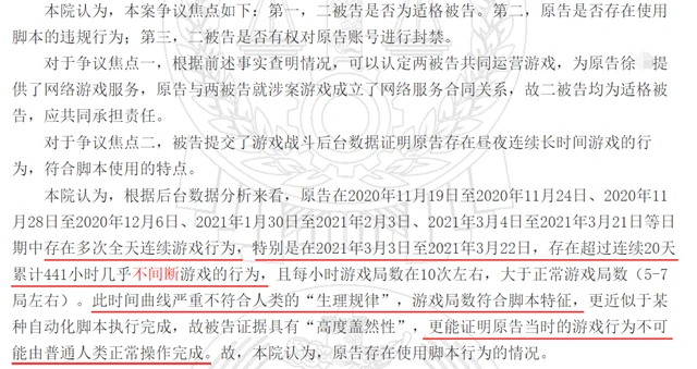 ![]() 今世快报讯(记者 刘遥)一名玩家账号被永世封禁,他找客服解封,被对方以利用脚本作弊为由拒绝。于是,他将网游运营商告上法院。裁判文书网公开的讯断书表现,运营商向法院提交了背景数据,证实该玩家存在多次全天连续游戏活动,最浮夸的是,他曾连续20天玩了441小时。一审、二审法院均以为,该玩家的活动不大概由平凡人类正常操纵完成,严肃不符合人类的“生理规律”,终极驳回了他要求解封的诉请。 △ 受访者供图 体系检测玩家作弊,账号被永封 2015年3月,徐某注册了网络游戏《坦克天下》账号,一玩就是数年。 2021年3月31日,徐某登录游戏时,发现本身的账号被永世封停。他想找客服申请解封,对方称内部数据表现,他利用过作弊性子的外挂步调及相干辅助性子的外挂步调,妨碍游戏公平性,以是无法予以解封。客服还表现,体系查抄不存在误封。 徐某以为本身没有作弊,于是将趣游期间(北京)科技有限公司(以下简称趣游公司)、北京天下星辉科技有限责任公司(以下简称星辉公司)诉至北京互联网法院,要求解封本身的账号。 背景数据表现,他20天玩了441小时 徐某在庭审时表现,他是《坦克天下》的老实玩家,在该账户投入了多年的时间,耗费了1万元购买假造物品,假造物品应属于原告的个人财产,游戏公司无权单方面克制。徐某以为,趣游公司、星辉公司作为该款游戏的运营商,与玩家之间创建网络游戏服务条约关系,封停账号的活动严肃陵犯了他的财产权益。 趣游公司、星辉公司则辩称,徐某大量利用脚本,从而得到对局后的夸奖,这对其他正常玩家来说的不公平。别的,由于《坦克天下》对于玩家的重要吸引力在于“对战”,若游戏内存在大量利用脚本的玩家,会严肃粉碎游戏的团体环境,根本上造成游戏无法正常运营,陵犯公司和全部正常玩家的长处。两家游戏公司以为,接纳“永世封禁”的步调具有公道性,他们在接纳步调前已经发布公告,告知玩家(利用脚本作弊会接纳封号步调),徐某应当知晓。 △ 裁判文书网截图 趣游公司、星辉公司向法庭提交了徐某的游戏市场作为证据,表现其存在多次连续长时间且不中断对局的游戏活动,不大概由人类完成。最浮夸的是,背景数据表现,徐某在2021年3月3日至2021年3月22日,存在连续20天累计441小时险些不中断游戏的活动。 法院:他的游戏不大概由平凡人类正常操纵完成 法院以为,徐某存在连续20天累计441小时险些不中断游戏的活动,且每小时游戏局数在10次左右,大于正常游戏局数(5-7局左右)。此时间曲线严肃不符合人类的“生理规律”,游戏局数符合脚本特性,更近似于某种自动化脚本实行完成。因此,法院以为趣游公司、星辉公司提供的证据具有“高度盖然性”,更能证实徐某当时的游戏活动不大概由平凡人类正常操纵完成,其存在利用脚本活动的环境。两家游戏公司依据协议约定对徐某账户举行封禁具有毕竟和条约依据,并非对徐某游戏账号权益的陵犯。 2022年3月25日,北京互联网法院驳回了徐某的诉求。徐某不平提出上诉。克日,北京市第四中级人民法院二审判断,驳回上诉,维持原判。 一名玩《坦克天下》12年的老玩家告诉今世快报记者,“这是一款对战游戏,玩一局10分钟左右。正常玩的话,精力很告急,要时候盯着画面,随时注意对手的动向。从前上大学时,我每天玩个几小时,就会以为很累。现在,我隔几天玩个两三局,大概半小时左右就玩不动了。像徐某如许连续20天,均匀每天玩20多个小时的环境,正凡人怎么大概吃得消。” 该玩家告诉记者,《坦克天下》的脚本作弊标题很常见,险些每局游戏都能遇到用脚本的。作弊玩家利用脚本可以轻松获取游戏币,但脚本呆板的自动操纵,会在很洪流平上影响每局游戏的胜败,给其他玩家带来极差的游戏体验。 (编辑 蒋文嘉) |