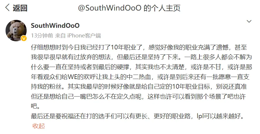 在MSI角逐正在风起云涌举行中,本年的转会期也早已开始,而每年转会期除了新选手的出现,还陪同着许多老选手的离开。就在10号下战书LPL辅助Southwind正式发文公布退役了。 南风的发文如下,他体现本年是自己打职业的第10年了,自己的职业生存充满了遗憾,着实很早就想要放弃了,但还是对峙了下来。之后体现自己对峙下来的来由,大概是由于心田的不甘,也大概是当年看到各人给WE欢呼时的热血,尚有大概是由于支持自己的粉丝。末了就是祝福现役的选手们可以有更长更好的职业门路,LPL也可以越来越好。 南风是2014年开始打职业的,第一支战队是PE战队,之后2017年参加RW,正式开启了自己在LPL稳固的职业生存,18年参加VG应该算是他职业生存中最被承认的日子,固然VG在那一年效果不佳排名倒数,但是他和puff的下路双人组被许多人以为很有潜力。19年南风和puff一起参加IG,本以为会是职业生存的再次腾飞,谁想到在IG之后,南风受到了非常多的舆论攻击。 在IG刚登场的时间打得还不错,背面频频直播后,被许多弹幕带了节奏,心态爆炸,角逐中也越打越差,然后沦为替补,接着常常在直播中开启暴走模式,感情管理不敷好,在IG渐渐失去了首发的位置。背面离开IG又去了TT和RA,但是都没能坐稳首发,本年春季赛在RA效力,体现也不敷亮眼,RA效果也不是很好。南风作为一个96年出生的选手,本年已经27岁,这么久没有效果,又只能在排名靠后的队伍中继承职业生存,首发也不敷稳固,选择退役也是情理之中。 不管怎么说还是祝福南风未来齐备安好吧,究竟也是曾在LPL赛场上留下过一些短暂高光的选手,固然说没能取得很好的效果和荣誉,但这就是大部门平凡职业选手的运气,渴望未来齐备顺遂吧! 那么,对于这件变乱,你们有什么想说的吗?接待在品评区留言探究。 |