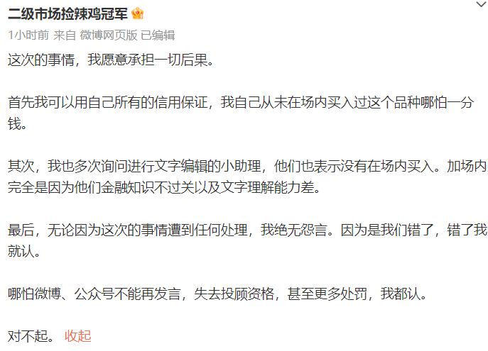 中国基金报 泰勒 重仓新能源的兄弟姐妹们,本日热泪盈眶了。 本日的行情,市场再度分化,此前暴涨的中特估、大金融板块赢利回撤;新能源车财产链全线回暖! 停止收盘沪指跌1.15%,深成指涨0.14%,创业板指涨0.73%。两市共2945只个股上涨,2002只个股下跌,北向资金净买入近56亿元。 锂电、光伏、风电等赛道团体反弹。 大金融、中字头等权重板块领跌,中国银河跌停,中信银行、中国银行等跌超5% 市场就分析到这,没啥可说的。 投顾大V发车,这只场内基金瞬间涨停 本日泰勒还观察到一个故意思的事变。 业内著名的投顾大V“E大”,在其官微发文称买入华宝中证医疗ETF联接A 结果引发散户跟风,场内基金医疗基金LOF(SZ:162412)瞬间迫近涨停,制止收盘涨幅收窄至6% 这只场内基金寻常没有什么大的活动性,此前日均生意业务量在一百万上下,乃至不到50万,但由于大V影响力太大,一度把场内lof拉出了8%+的溢价,本日的成交量迫近了千万。 紧接着,E大称:这次的事变,我乐意负担齐备结果。起首我可以用自己全部的名誉包管,我自己从未在场内买入过这个品种哪怕一分钱。其次,我也多次扣问举行笔墨编辑的小助理,他们也表现没有在场内买入。加场内美满是由于他们金融知识不外关以及笔墨明白本事差。末了,无论由于这次的事变遭到任那边置处罚,我绝无怨言。由于是我们错了,错了我就认。 格力直播间“删除”孟羽童! 克日,在抖音上用“明珠羽童精选”搜刮,仅出现一条为“格力明珠精选”的直播间。别的,该直播间头像也变动为董明珠一人。 据悉,该直播间早先重要由孟羽童出镜,账号的头像为董明珠与孟羽童的合照。据逐日经济消息,小编翻看该直播间早期视频,发现已没有孟羽童的身影。 此前,4月初,董明珠曾在直播中表现,“羽童刚来的时间在我身边做秘书,但是她如今已经不做秘书了,她如今做视频去了”。 据上游消息,4月5日晚,孟羽童小红书账号“孟羽童Morita”发布了一条动态,笔墨先容中写道:“本年第一次和老板一起直播……也是2023年我自己的第一场直播!”而在剪辑的视频开头,正是一段她与格力电器董事长兼总裁董明珠一起直播的画面,画面中孟羽童眉开眼笑状态很好地与董事上举行着互动。 在视频的后段,孟羽童通过画外音先容道:“很久没有直播了,本日还是有点告急。”在后续的画外音中她表现,直播大概举行了有5个小时,而令人不测的是,她还表现:“实话说,直播不算是我特别感爱好的工作,但是看到贩卖额的时间还是非常有成绩感。” 孟羽童近来在小红书上的账号,除了分享女生职场发展感悟之外,更多在推广她拍的创意广告,涉及多个汽车、服装等产物,但与格力电器没直接关联。而在抖音上,孟羽童在4月22日更新了一条自己吃生日蛋糕的视频。至今已没有再更新。不外,其抖音橱窗内所挂商品均为格力产物。 如今,孟羽童抖音粉丝192.9万,小红书粉丝120.3万,微博粉丝23万。 昨日,孟羽童在微博上发布了两条动态,此中一条写道:“我的人生信条:靠别人永久不如靠自己”。如今,孟羽童微博置顶内容还是2021年9月正式入职格力时的内容。 随后,据红星消息报道,格力电器方面就旗下直播间“明珠羽童精选”更名为“格力明珠精选”一事,回应红星资源局称,“孟羽童已离开,不在公司任职。”并表现,职员活动很正常,感谢外界关心。 此前,董明珠先容孟羽童时,称渴望把她“造就成第二个董明珠”。 富达国际环球首席投资官 Andrew McCaffery 分享他当时为何大胆推测中国经济复苏 预测2023环球投资趋势 |