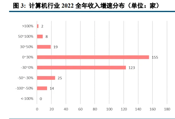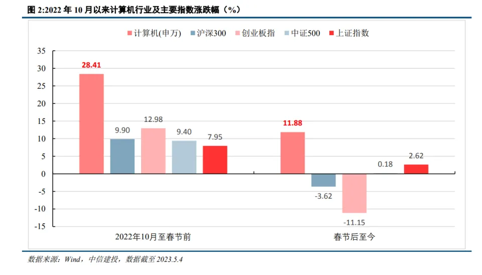 (陈诉出品方:中信建投证券) 一、行业回顾1.1 市场行情回顾 信创、数据要素、AI 轮番驱动,盘算机板块显着跑赢大盘。2022 年 10 月美对华芯片出口管制、二十大提 出“统筹安全与发展”,信创节奏预期动员盘算机板块行情,10 月尾伴随着《天下一体化政务大数据体系建立 指南》等数据要素市场政策连续推出,信创+数据要素共同动员盘算机板块春节前上涨行情。春节后,微软数十 亿美金投资 openAI,ChatGPT、GPT-4 等大模子连续发布,国内大厂纷纷跟进,算法、算力、数据、应用等 AI 干系板块领涨市场,动员盘算机板块显着跑赢大盘。 2022 年 10 月至春节前,告急指数均出现反弹,此中盘算机板块大幅上涨 28.41%,显着跑赢其他告急指数。 春节后,在 AI 大模子的推动下,盘算机板块继续上涨,4 月以来略有回调,但团体涨幅仍有 11.88%,相对其他 告急指数仍保持较大的相对收益。制止 5 月 4 日,盘算机(申万)显着跑赢大盘,年初以来涨幅达 25.81%,位 列申万一级行业第 3 位。 1.2 行业及子板块业绩回顾 2022 年行业营收增速有所放缓,毛利率下滑以及研发投入增长导致利润同比下滑。制止 2023 年 4 月 30 日, 申万盘算机行业总计 348 家上市企业,剔除 B 股上市公司共计 346 家(下同)。2022 年整年合计实现业务收入 11674.21 亿元,同比增长 1.18%,增速中位数为 0.8%;实现归母净利润 307.92 亿元,同比降落 44.57%,增速中 位数为-13.9%;实现扣非净利润 198.69 亿元,同比降落 50.35%,增速中位数为-6.2%。从费用率环境来看,2022 年行业贩卖费用率、研发费用率同比略有上升,财政费用率略有降落。2022 年整年行业团体贩卖费用率为 7.66%, 同比上升 0.38 个百分点;2022 年整年行业团体研发费用率为 9.25%,同比上升 0.82 个百分点。2022 年受多地 散发疫情影响,部分项目四序度未能完成验收确认收入,导致行业团体利润端体现不佳,毛利率相较 2021 年同 期降落 0.62 个百分点。 行业团体营收同比根本持平,一季度毛利率同比小幅提升,非经常性项目损益较大,归母净利润团体实现 较大幅度增长。一季度行业费用率同比提升显着,团体扣非净利润出现亏损,同比下滑显着。2023 年一季度 346 家公司合计实现业务收入 2329.02 亿元,同比降落 1.27%,增速中位数为 6.6%;实现归母净利润 48.94 亿元,同 比上升 62.83%,增速中位数为 22.7%;实现扣非净利润-8.17 亿元,增速中位数为 22.0%。从费用率环境来看, 2023 年一季度行业贩卖费用率、研发费用率同比略有上升,财政费用率略有降落,归母净利润提升告急来自于 毛利率提升及非谋划性损益提升,包罗当局补贴、投资收益等,扣除非经常项目损益后的净利润降落,告急原 因系行业团体贩卖、研发费用率的提升。2023 年一季度行业团体贩卖费用率分别为 8.81%,同比上升 0.81 个百 分点;2023 年一季度行业团体研发费用率为 11.09%,同比上升 1.07 个百分点。 2022 年疫情影响较大,仅过半数企业实现收入增长。从收入增速布局来看,剔除 B 股的 346 家上市公司中 184 家公司 2022 年整年收入实现同比正增长,占比力 2022 年三季度有所下滑。此中,超 8 成公司整年收入增 速处于-30~30%区间。对于多数盘算机公司而言,收入确认与验收根本会集在第四序度,2022 年四序度疫情有 所发作,导致大量验收确认工作无法正常推进,影响行业内公司整年财政体现。 疫情影响渐渐消退,超六成公司一季度实现收入增长。从收入增速布局来看,剔除 B 股公司,346 家上市 公司中 216 家公司 2023 第一季度收入实现同比正增长,相较 2022 年整年实现同比正增长的 184 家有显着提升。 此中,超 7 成公司前三季度收入增速处于-30~50%区间,10 家公司 2023 年一季度收入实现翻倍增长,告急缘故起因 为客岁一季度收入基数较低,或近一年内发生了独立上市、投资并购等事故。对于多数盘算机公司而言,收入 存在较为显着的季候效应,收入确认与验收根本会集在第三、四序度,第一季度收入在整年中占比相对偏小, 颠簸也较大。一季度随着疫情影响渐渐消退,生产生存节奏规复正常,多数盘算机公司订单环境体现良好,部 分 2022 年四序度受局部疫情影响导致的项目验收、实验延后,使得本应 2022 年四序度确认收入的项目延期至 本年一季度或二季度,也为部分公司贡献了 2023 一季度的收入增长。团体来看,盘算机行业 2023 年第一季度 收入略有提升,随着经济复苏进一步推进,招投标项目加快推进并进入实验阶段,2023 年整年盘算机公司收入 环境有望实现稳步增长。 2022 年疫情影响下多数企业利润出现下滑,超两成企业由盈转亏。从利润环境来看,2022 年盘算机行业中 仅 17 家企业利润实现扭亏,120 家企业亏损,此中盈转亏企业 77 家,续亏企业 43 家,行业内公司受疫情影响 较为显着,部分项目延期至 2023 年上半年确认收入及利润。 一季度利润端基数偏小导致颠簸较大,盈转亏及扭亏企业占比根本相当。从利润环境来看,2023 年第一季度盘算机行业中亏损企业 162 家,33 家企业盈转亏,34 家企业扭亏。思量到盘算机行业大多数公司收入端存在 季候效应,同时本钱端为各季度平摊,因此一季度利润端亏损企业占比力高属正常征象。全行业 2023 年一季度 实现归母净利润增速 62.83%,增速中位数 22.7%,体现行业当前处于良好发展趋势,随着下半年收入确认高峰 期到临,预计整年行业利润有望实现触底回升。 2022 年行业龙头业绩稳固性更强,23 年 Q1 疫情缓解经济复苏中小