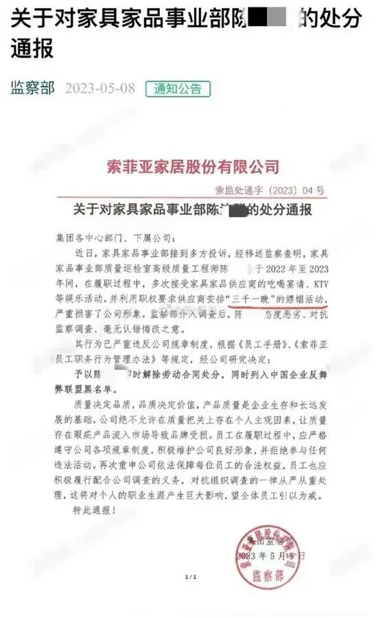 克日,一则内容为“索菲亚家具股份有限公司关于对家具家居古迹部陈某的处分转达”的图片引发网络关注。 根据上述处分转达可以看出,这位涉事的家具古迹部质量巡检室高级质量工程师,在2022年——2023年期间的履职过程中,不但多次担当供应商的吃喝宴请,以及KTV等娱乐运动,还使用职权,要求供应商安排“三千一晚”的嫖娼运动,而在事发后也没有改过之意。 据上游消息,一位在索菲亚担当高层职务的内部人士证明确这份转达的真实性,并表现:“这个属于公司内部转达不对外发布,内容是查实了他的违规举动后的内部处罚。在家居行业,许多公司都有类似的红线,员工不得越界。而转达就是渴望将如许的蛀虫整理出去的同时做一个警示。” 据相识,在索菲亚监察部收到举报并举行观察时,陈某对抗索菲亚公司监察观察。观察竣事后,索菲亚公司根据公司管理办法和员工守则,予以该员工排除劳动条约处分,同时列入中国企业反舞弊同盟黑名单。 另据南都·湾财社报道,索菲亚的工作职员确认此事属实,干系负责人透露陈某从其他公司跳槽至索菲亚家居不久,公司对此类事故秉持一查到底,绝不姑息的态度。 资料表现,索菲亚是一家紧张从事定制衣柜、橱柜、木门等产物的公司,因此就涉及到木料等原质料的供应标题。如今,索菲亚旗下品牌紧张有4种,分别是大众市场的“米兰纳”、中高端市的“索菲亚”,以及以高精人群为目标的“司米”和“华鹤”。 据极目消息,在业内,索菲亚有着一个“2万元发迹”的故事。2003年,39岁的江淦钧依附手里的末了两万元创业,创建了宁基公司,也就是索菲亚的前身。由于定制家居业务受到追捧,江淦钧将公司的主业务务变革成了定制衣柜,将公司更名为“索菲亚”,并在2011年乐成登岸A股市场。 财报表现,2023年第一季度,索菲亚实现营收18.05亿元,同比降落9.7%,而归母净利润也在同比降落8.86%后,仅存1.04亿元。 停止10日收盘,索菲亚报17.92元/股,涨0.39%,市值为163.5亿元。(泉源:上游消息、极目消息、公开信息;整理:李云鹏) 编辑:方凤娇 |