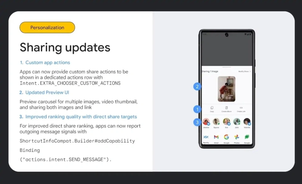 IT之家 5 月 11 日消息,谷歌本日破晓召开的 I / O 2023 开发者大会上,并没有淹灭太多的时间先容安卓 14 体系的新功能 / 新特性,不外在后续的集会环节还是分享了不少新内容。 IT之家援引国外科技媒体 9to5Google 报道,梳理安卓 14 体系新功能 / 新特性如下: Ultra HDR当前安卓版本已支持 HDR 视频,而在安卓 14 中将会进一步增强 HDR 照相,引入 Ultra HDR 格式,向后兼容 JPEG。 启用 Ultra HDR 格式拍摄的照片会以 10-bit 高动态范围举行存储,由于须要硬件支持,上线初期仅限于安卓旗舰机型。 谷歌渴望 Ultra HDR 格式能成为体系内置相机应用、第三方相机应用的默认格式。Google Photos 将支持 Ultra HDR 格式的欣赏、备份、编辑、分享和下载。 谷歌安卓团队已经和高通等公司互助,优化硬件,在别的装备形态上也支持 Ultra HDR。 隐私和安全在安全和隐私方面,可以仅授予应用步伐部门 / 选择媒体访问权限,而权限提示将要求开发职员表明何时以及为何与第三方公司共享位置数据。 安卓 14 的新特性是投屏中支持分享部门屏幕,允许用户选择分享单应用大概全屏。 Health Connect 现在通过 Google Play 体系更新内置到 Android 中,而不是 Play 市肆中的应用步伐。 Material You + 操持在操持方面,安卓 14 引入了全新的优劣主题(Monochrome)。 安卓 14 还进步了 Dynamic Color 的色彩保真度,可以大概天生更广泛的颜色,从而变得更加美丽。 Materials You 也引入了高对比模式和中对比度模式。 基于内容的动态颜色允许按钮和其他组件顺应屏幕上表现的图像。比方,根据当前歌曲的唱片集画面更改颜色的“正在播放”页面。 安卓 14 更新了分享界面,可以由开发者自界说表格选项。 |
