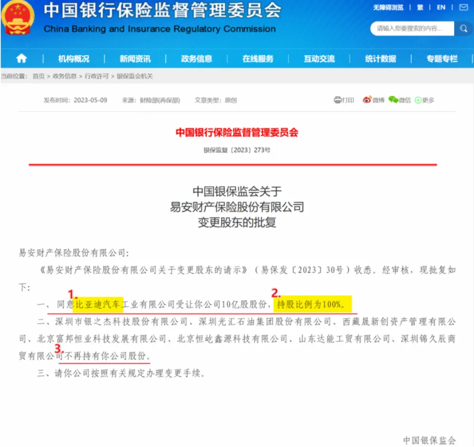 比亚迪用36亿元买了一家保险公司震惊业界。 5月9日,据中国银保监会公告可知,比亚迪全资收购易安财险100%的股份,天眼查信息披露,比亚迪收购价约为36亿元。易安财险原来的各股东清白手中股票,不再持有任何股份,自此比亚迪成为保险行业内第一例民营股东独资的中资险企。 2020年被接受的易安财险,耗时三年末于找到新东家。但斥巨资收购易安财险的比亚迪却迎来了股价下跌,5月9日收盘,比亚迪收盘价250.11元,跌幅为1.54%。和年内股价高点288.82元(2月9日)相比,跌幅13.4%,和2022年358.76元的高点相比,跌幅达30.3%,市值蒸发超3000亿元。 市场的担心感情来自于,易安财险2022年7月15日,因资不抵债进入休业重整步伐,背负了巨额债务,比亚迪并购易安财险,势须要吃下这些债务;别的比亚迪和保险业务跨度太大,而且保险公司和4S店是博弈关系,将来比亚迪或有左右手互博的风险。比亚迪为何甘冒云云大风险也要并购易安财险? 第五家单一股东险企市场关注的重点之一是比亚迪100%持股易安财险,也就是说易安财险如今已经过多股东变成了比亚迪单一股东。 这个信息点之以是备受关注,是由于2018年原保监会下发《保险公司股权管理办法》,对中资险企的股东资质和持股比例,举行明白要求。此中对单一股东的持股比例不能凌驾险企注册资源的三分之一,也就说,单一股东最多只能持有险企股份的33.33%,迩来的例子就是祥瑞汽车入股合众财险,其持股的上限就是33.33%。李书福也想全资持股成为单一股东,但未获答应。 BT财经相识到,制止2023年4月31日,国内有资质的财险公司共计89家,此中有13家为外资险企,其他76家险企中只有4家险企为单一股东100%持股,这4家分别为华泰财险、中银保险、阳光农业、中远海自保,从单一股东中国银行和中国远洋海运团体就知道单一股东的力气强劲和配景强盛。 即便云云,须要特别夸大的是,这4家入股时间都是在2018年之前,2018年以后没有任何一家险企是单一股东全资。由此可见,不是祥瑞不想单一持股,而是相干部分未能批复,以至于单一股东独资的财险牌照相称稀缺。 保险行业人士分析称,比亚迪可以大概获批独资易安财险,大概与股权管理办法的第八十八条有关。查询保险公司股权管理办法相干条文,第八十八条内容原文是“经中国保监会答应,加入保险公司风险处理的,大概由指定机构承接股权的,不受本办法关于股东资质、持股比例、入股资金等规定的限定。” “比亚迪加入易安财险的风险处理,这或是比亚迪能通过羁系部分答应的缘故原由。”该业内人士夸大,如今比亚迪独资易安财险,是行业的第一例,大概会为厥后浩繁休业的保险公司提供鉴戒和参考。 36亿的牌照值不值?相较于一些观点以为易安财险是个包袱,有业内人士持差别意见:“易安财险规模较小,汗青包袱不重,确实是精良资产。” 毕竟确实云云,据公开资料体现,易安财险固然名气不大,创建时间也不算长,但却是国内四家获批设立的专业互联网保险公司之一,2016年2月创建于深圳。和一样寻常保险公司前期亏损很久差别,易安财险在创建的第一年就实现了157.2万元的红利,2017年净利润则提升至711万,成为浩繁保险公司中的发展榜样。 创建刻红利也让易安财险布局过于激进,并紧跟网贷P2P平台开展相干保险业务,但不幸的是,易安财险押宝失败,网贷P2P平台相继爆雷,易安财险“出道即顶峰”,2018年净亏损1.99亿元,2019年连续亏损1.67亿元,而2020年一季度再度亏损2.62亿元,这也是易安财险末了一次业绩披露,制止2022年3月31日,易安财险资产总计3.34亿元,负债合计4.62亿元,股东(或全部者)权益合计-1.27亿元,账面资产小于负债,已经进入资不抵债的田地。 资不抵债是毕竟,但净资产仅为-1.27亿元,这对营收凌驾4000亿元的比亚迪险些是九牛一毛。 2020年7月易安财险被银保监会直接接受,同期被接受的另有中原人寿、天安财险、天安人寿等5家财险公司。原来接受限期为一年,到期后又延伸接受一年,直至本年已是第三年。2022年7月向北京金融法院提交休业重整申请。随后为推进重整工作开展,易安财险公开招募重整战略投资者。 2023年2月24日,易安财险公告,北京金融法院作出(2022)京破1号之一《民事裁定书》,裁定答应易安财险重整操持,并制止重整步伐。易安财险将依法推进重整操持的实行工作。天眼查也于本年年初披露:“比亚迪拟以36亿元收购易安财险股权。” 易安财险如今资不抵债被迫卖身,但在创建之初增长迅猛,2016年创建第一年保费收入就达2.2亿元,2017年达8.45亿元,同比增长284%,2018年保费收入达12.94亿元,增幅为53%。作为互联网保险企业,相比传统保险公司以渠道倾斜方式触网,互联网保险公司在技能范畴的专业上风更为显着,在斲丧者斲丧风俗由线下徐徐向线上厘革的本日,这一上风将使互联网保险公司方便创建直接面对客户的营销渠道,同时可以高质量地与淘宝、携程品级三方相助,在数字化方面,比传统保险公司具备自然上风。固然最让比亚迪看重的还是第五家单一股东持股,被业内以为“36亿买个优质牌照也超值。” 这并不是比亚迪初次试水保险行业,早在2022年3月比亚迪保险经纪有限公司获深圳市市场监督管理局答应创建,收购易安财险,或是王传福在下一盘大棋。 新能源车险是将来险企主战场很显然,比亚迪收购易安财险的终极目的会进军车险,只是从易安财险如今的谋划
