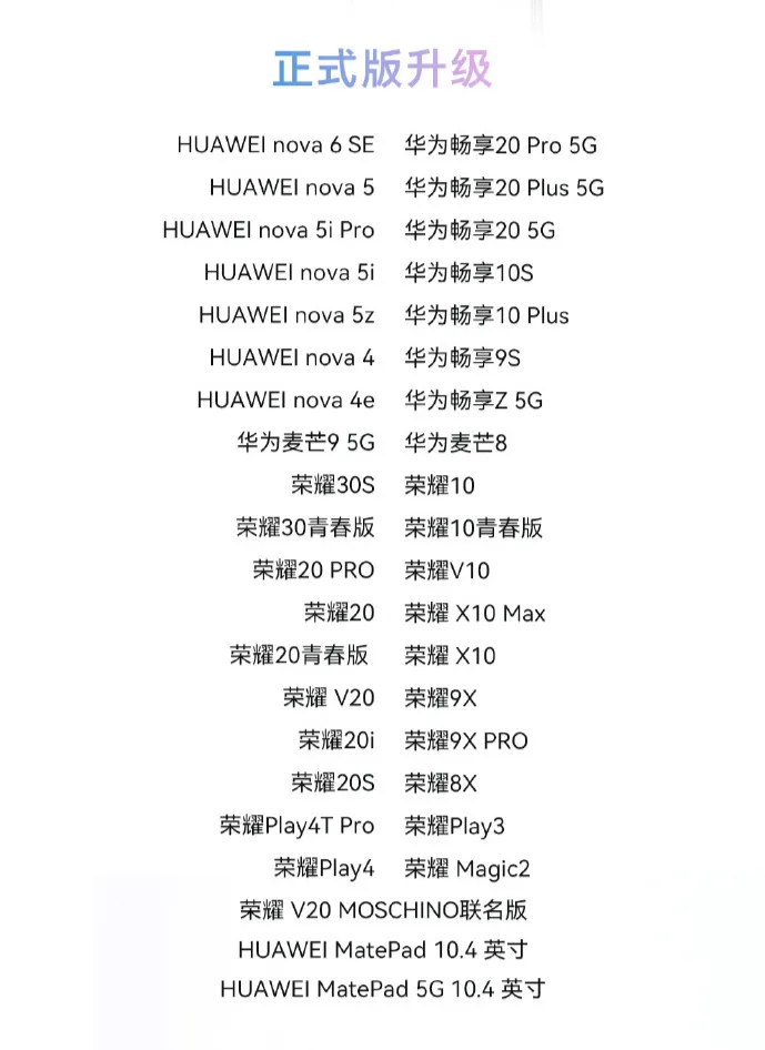 提及来华为鸿蒙体系在升级更新方面对老机型还是比力照顾的,好比华为鸿蒙3.0体系升级更新支持近百款机型,包罗华为mate10,华为P20等等老机型都支持鸿蒙3.0体系升级更新。 除了华为老机型之外另有多款光彩老机型也支持鸿蒙3.0体系升级,好比光彩9X,光彩X10,光彩20等等光彩老机型。 如今隔断华为鸿蒙3.0体系推出已经有一段时间了,各人的手机都有升级更新到鸿蒙3.0体系了吗? HarmonyOS官方也是公布了鸿蒙3.0体系最新升级更新渴望,根据HarmonyOS官方发文表现39款装备启动鸿蒙3.0体系正式版升级更新。 这次开启鸿蒙3.0体系正式版升级的机型比力多达39款,包罗华为nova6 SE,华为nova5,华为畅享20 5G等等华为手机。 也支持光彩9X,光彩X10,光彩20,光彩8X等等浩繁光彩老机型,详细升级支持机型如下,各人看看你的手机是不是可以升级鸿蒙3.0体系正式版了: 鸿蒙3.0体系在万能卡片,智能文件夹,超等终端,智能桌面结构等等多个方面举行了优化升级。 |