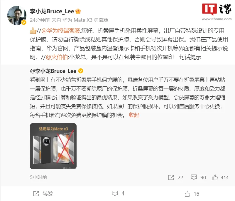 IT之家 5 月 13 日消息,本日华为终端 BG CTO 李小龙在微博上体现,“恳请各位用户千万不要在折叠屏幕上再粘贴一层掩护膜,也千万不要撕除原厂的掩护膜。” 李小龙体现,“网上有不少贩卖折叠屏手机掩护膜的,但折叠屏幕的每一层的材质、厚度和受力都是颠末经心盘算和验证得出的最优结果,假如改变了受力模子,会使屏幕的寿命大幅紧缩,而且大概丧失免费保修资格。假如原厂的掩护膜粉碎,可以到售后服务中心更换,每台手机都有两次免费更换掩护膜的时机。” 华为终端客服称,“折叠屏手机接纳柔性屏幕,出厂自带特殊计划的专用掩护膜,请勿自行撕除或粘贴其他掩护膜,否则会导致屏幕出保。我们在产物使用指南、华为官网、产物包装盒内温馨提示卡和手机初次开机等界面都有干系提示分析。” 本年 3 月,华为 Mate X3 折叠屏手机发布,后摄接纳“寰宇舷窗”计划,整机重量 239g,机身接纳羽砂玻璃工艺;配备双旋水滴铰链和较薄 Type-C 器件,睁开形态下机身厚度 5.3mm,支持 IPX8 级抗水;接纳 6.4 英寸 2504x1080 分辨率昆仑玻璃外屏和 7.85 英寸 2496x2224 分辨率抗冲柔性内屏,426PPI,均支持 1440Hz PWM 调光,内屏支持 LTPS,外屏支持 LTPO;内置 4800mAh 电池,支持 66W 快充、50W 无线充电;后摄配备 5000 万像素主摄(IT之家注:传感器为索尼 IMX766)+1300 万像素超广角镜头(索尼 IMX688)+1200 万像素 5 倍潜望式长焦镜头(索尼 IMX688),搭载超感知 XMAGE 影像。 |