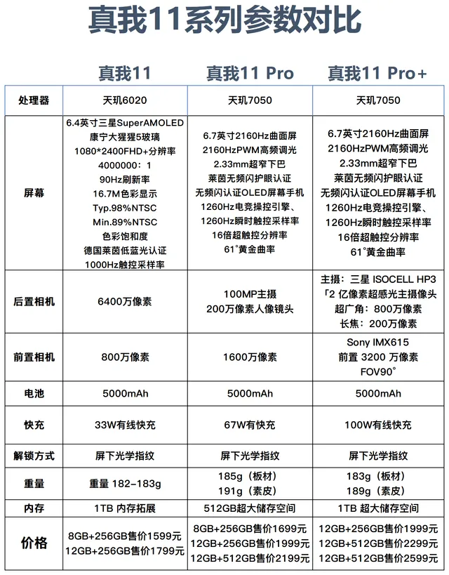 在5月10日,@realme真我手机 准期发布了预热已久的包罗尺度版、Pro版和Pro+版的三款真我11系列新机。根据此前官方发布的预热信息和发布会上的先容来看,可以说此中Pro+版可谓是同档机型中影像性能天花板的存在。那么,三款机型除了代价具体都有哪些差别?小同伴们该怎么选呢?下边就来看看三机有何差别吧。 外貌方面 着实在外貌方面,三款机型的外貌计划根本同等,不外,除了超大的后照相像模块计划之外,在Pro版和Pro+版上还到场了素皮计划,根据如今市售的机型来看,在千元档也能买到素皮版机型照旧相当值得拥有的。 真我11的三围分别为159.82*72.87mm*夏日燃橙7.98mm(星迹黑7.93mm);真我11 Pro系列拥有三款配色,此中两款为素皮后壳材质,别的一款为复合板材后壳,两款机型的边框均为PC材质,这两款机型的三围均是161.6*73.9*8.2/8.7mm,真我11 Pro的重量分别为185克和191克,真我11 Pro+重量分别为183克和189克,故意思的是,定位更高的机型反而更轻了一点点。 屏幕方面 真我11接纳的是三星Super AMOLED面对面屏,屏幕尺寸为6.4英寸支持90Hz高刷,接纳了第五代康宁大猩猩玻璃,具有更强的抗摔性和抗划伤性,为用户带来了远超同价位产物的屏幕体验。 真我11 Pro和真我11 Pro+的屏幕类似,接纳6.7英寸1080P曲屏,支持阳光屏和20000级主动亮度级别,得到无频闪和低蓝光两项莱茵护眼认证,打造护眼天花板。别的,该屏还支持10亿色、120Hz高刷以及2160Hz PWM调光,可谓护眼和颜值拉满。真我11则是6.43英寸90Hz三星AMOLED直屏。 性能方面 真我11 Pro和Pro+版搭载同款处理惩罚器,都为联发科天玑7050,安兔兔跑分57W左右,参考高通的处理惩罚器,该处理惩罚器根本相当于骁龙778G;真我11则搭载的是天玑6020。 续航和快充方面 真我11系列全系内置5000mAh电池,此中,Pro+版支持100W快充,Pro版则支持的是67W快充,真我11是33W快充。 影像方面 后置影像方面则是三款机型最大的区别: 真我11 Pro前置1600万像素摄像头,后置1亿像素(OIS光学防抖、F1.75)+200万微距双摄组合,最高支持2倍单镜变焦功能。 真我11 Pro+前置3200万像素摄像头,后置2亿主摄(三星HP3、OIS 光学防抖、F1.69、7P)+800万超广角+200万微距三摄组合,支持4倍无损变焦和玉轮模式。 真我11则前置800万像素摄像头,后置6400万像素主摄+200万像素人像的双摄组合。 其他方面 真我11 Pro两款机型均支持杜比全景声双扬声器和WiFi6。此中Pro+版内置X轴线性马达,而且支持360度多功能NFC,不外遗憾的是与GT Neo5 SE相比少了红外接口;别的,真我11是转子马达,只支持单扬声器、wifi5以及3.5mm单独耳机孔和内存卡槽,而Pro版则是X轴线性马达、wifi6。 根据对比,总体可以看出,三款机型的差别照旧比力大的,但是三款机型在各自覆盖的价位段照旧相当有力气的。特殊是寻求影像体验和大存储的小同伴,真我11 Pro+绝对是一款值得保举的机型,该机的影像体现相当精彩,可以说到达了同档机型的天花板的存在。 |