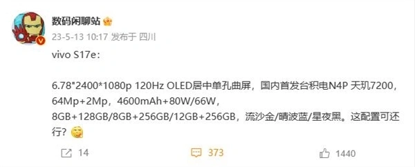 快科技5月13日消息,据爆料,vivo S17e上架官方商城,售价2499元。 据博主“数码闲聊站”透露,vivo S17e配备6.78英寸OLED居中单孔曲屏,分辨率为2400 x 1080,支持120Hz。 同时,新机首发天玑7200处置惩罚器,台积电第二代4nm工艺,CPU为2个2.8GHz Cortex-A715, 6个2.0GHz Cortex-A510,GPU为Mali-G610 MC4。 别的,vivo S17e存储规格为8GB+128GB、8GB+256GB、12GB+256GB,内置4600mAh电池,支持80W/66W快充。 此前,一款型号为v2285a的手机于4月27日通过了国家3C质量认证,搭载联发科7200处置惩罚器,疑似vivo S17e。 |