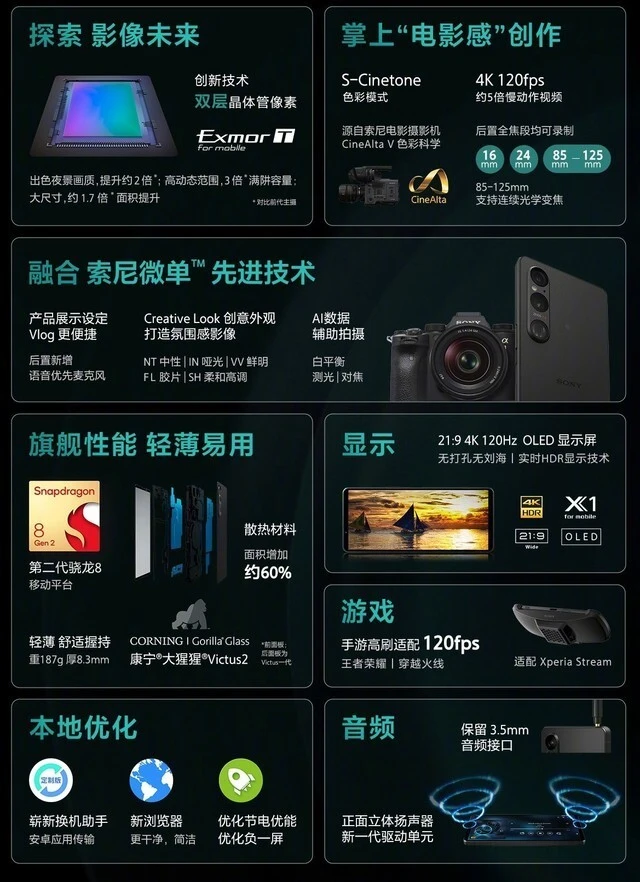 索尼官方日前公布,其最新款手机Xperia 1 V已开始预售,5月31日正式开卖,售价8999元起。 这款手机接纳高通骁龙8 Gen 2处理处罚器,6.5英寸21:9 4K无打孔屏幕,并支持实时HDR技能、等效10bit和BT.2020色彩尺度。该机还搭载IMX888主摄、12MP的IMX563超广角镜头和12MP的85-125mm IMX650 F2.3-2.6长焦镜头,以及23mm IMX663 F2.0前置摄像头。同时,Xperia 1 V新增了60%石墨烯散热质料面积,内置5000mAh电池,支持33W PD3.0快充、Qi无线充电和IP65/68防尘防水。这款手机重187g,尺寸为164.68 x 70.89 x 8.54mm。除此之外,Xperia 1 V还带来了与ZV-E1雷同的S-Cinetone色彩风格滤镜,无需后期调色,可以直出影戏感视频。 (8178964) |