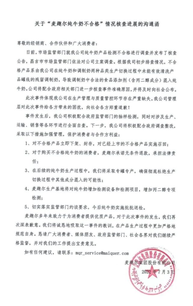 麦趣尔纯牛奶检出丙二醇变乱有了观察效果。新疆昌吉州昌吉市市场羁系局8月22日发布的行政处罚书表现,麦趣尔团体股份有限公司(简称“麦趣尔”)在生产麦趣尔纯牛奶、纯牛奶的前处置惩罚环节中,将原奶导入存储罐过程中超范围使用食品添加剂。因上述违法举动,麦趣尔被该局罚款约7315.1万元,相当于赔掉近两年净利润。 值得关注的是,针对纯牛奶中检出丙二醇,麦趣尔此前给出的说法是“调制奶罐线残留混入”,否认在纯牛奶中违规添加,与此次羁系部分观察效果存在收支。麦趣尔此前是否故意向公众遮盖真相?8月23日,麦趣尔方面回应新京报记者称,纯牛奶中检出丙二醇的缘故原由以观察效果为准。规复生产后,渠道对于公司纯牛奶产物格量尚未提出疑虑,但市场须要徐徐规复。 企业官方旗舰店表现的产物图片 新京报记者 张明璇 摄 违法添加丙二醇被罚约7315.1万元 麦趣尔纯牛奶检出丙二醇变乱可追溯到本年6月。6月27日,昌吉市市场监视管理局收到国家食品安全抽检信息体系平台推送浙江省丽水市庆元县市场羁系局查验陈诉,查验结论为麦趣尔2批次纯牛奶含有食品添加剂丙二醇,为不合格食品。6月28日,昌吉市市场羁系局对麦趣尔存案观察。 据国家市场羁系总局7月3日《市场羁系总局要求新疆市场羁系局严查麦趣尔纯牛奶检出丙二醇标题》转达,“经开端观察分析,麦趣尔纯牛奶中检出丙二醇为企业在生产过程中超范围使用食品添加剂香精所致”。丙二醇是答应使用的食品添加剂,但不得在纯牛奶中使用。 据昌吉市市场羁系局8月22日公布的观察效果,麦趣尔在生产麦趣尔纯牛奶、纯牛奶的前处置惩罚环节中,将原奶导入存储罐过程中超范围使用食品添加剂。该食品添加剂的因素为“INS 1520丙二醇97.3%、食品用香料2.2%、水0.5%”。观察期间,新疆维吾尔自治区市场羁系局对麦趣尔生产的纯牛奶构造抽检,在麦趣尔纯牛奶(200ml/盒)及纯牛奶(200ml/盒)产物中检出丙二醇,查验结论为不合格。 据麦趣尔8月22日晚公告,以上不合格纯牛奶产物货值金额共计5225071.48元,贩卖金额为4924542.68元,剩余不合格纯牛奶产物8413件。案发期间,麦趣尔退赔金额4564387.80元,剩余金额360154.88元。 曾声称丙二醇系罐线残留混入 值得留意的是,麦趣尔此前对于纯牛奶中检出丙二醇的说法,与此次市场羁系部分观察效果存在收支。 7月3日,麦趣尔乳业官方微信公众号发布关于“纯牛奶不合格”情况核查盼望沟通函称,根据开端排查情况,产物不合格缘故原由是公司在纯牛奶和调制奶两种品类生产切换过程中未能有用洗濯产物罐线的残留调制奶,导致调制奶中正当的食品添加剂(含丙二醇因素)混入纯牛奶。此中还称,在后续纯牛奶生产过程中采取专罐专产,确保杜绝生产切换过程中其他因素混入的大概性。 7月3日麦趣尔就不合格纯牛奶发布的阐明。 企业声明截图 不外根据昌吉市市场羁系局上述观察效果,麦趣尔是在生产麦趣尔纯牛奶、纯牛奶的前处置惩罚环节中,将原奶导入存储罐过程中超范围使用食品添加剂,并未提及罐线残留混入标题。麦趣尔此前是否对公众故意遮盖真相? 对此,麦趣尔方面8月23日回应新京报记者称,纯牛奶中检出丙二醇的缘故原由以观察效果为准。规复生产后,渠道对于公司纯牛奶产物格量尚未提出疑虑,但市场须要徐徐规复。 一次违法赔掉近两年净利润 只管观察告一段落,但丙二醇变乱给麦趣尔带来的影响远未竣事。 公开资料表现,麦趣尔团体股份有限公司创建于2002年,核心业务包罗乳成品制造和烘焙连锁。制止2021年底,麦趣尔共有228家烘焙门店,试图通过宁波烘焙工厂、北京烘焙工厂结构,实现江浙沪、京津冀市场的快速突破。在乳成品方面,麦趣尔以“天山牧场”作为战略性品牌,主攻天下性流畅渠道。 财报表现,麦趣尔2020年、2021年净利润分别为5275.08万元、1845.75万元,此次罚款相当于其一次性赔掉近两年净利润。 据麦趣尔本年7月发布的业绩预告,受丙二醇变乱影响,预计2022年上半年亏损1.3亿元-1.95亿元。由于纯牛奶业务约占团体业务收入约50%,此事项将对其纯牛奶产物的生产与贩卖造成负面影响及大概产生的相干费用尚不确定,进而大概影响公司第三季度和整年的策划业绩,公司股票大概存在触及其他风险警示风险。别的,麦趣尔原定于8月23日披露的2022年半年报,也因尚未体例完成而向厚交所申请延期披露。 麦趣尔在8月22日公告中称,罚款将对公司损益产生肯定影响。公司于2022年7月3日制止纯牛奶生产,现全部整改完毕,相干停产已竣事,徐徐规复纯牛奶生产,查验合格后上市贩卖。公司本次收到行政处罚决定书的事项,不属于巨大违法欺压退市的情况。 另据天眼查App信息,麦趣尔克日新增开庭公告,原告为自然人徐某,案由为产物责任纠纷,相干案件将于9月16日在江苏省江宁经济技能开辟区人民法院开庭。麦趣尔控股股东新疆麦趣尔团体有限责任公司(简称“麦趣尔团体”)本年6月被最高人民法院列为失信被实验人,该公司及其法定代表人李玉瑚被限定高斲丧。现在,麦趣尔团体被实验总金额约为6.66亿元;终本案件实验标的总金额约为7050.586万元,未推行比例为3.9%。 新京报首席记者 / 郭铁 编辑 / 李严 张明璇 校对 / 柳宝庆 |
