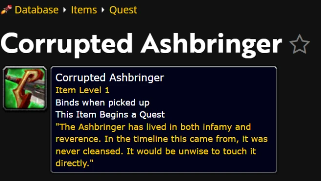 魔兽天下10.1.5版本wowhead的数据库中发现了一件名叫【堕落的灰烬使者】的物品,而且表现“拾取后绑定”“此物品开启一个使命”。但是之前暴雪说过,写了绝版的事就肯定是绝版,其他都是换皮回归。但鉴于之前特意提到堕落的灰烬使者不会回归,那就是将来肯定会回归,究竟暴雪喜好打脸。 在这个【堕落的灰烬使者】物品中,尚有一行黄字对其举行分析: “灰烬使者不绝生存在羞辱和崇敬之中。在这把武器来自的时间线上,它从未被净化过。直接打仗它是不明智的。” |