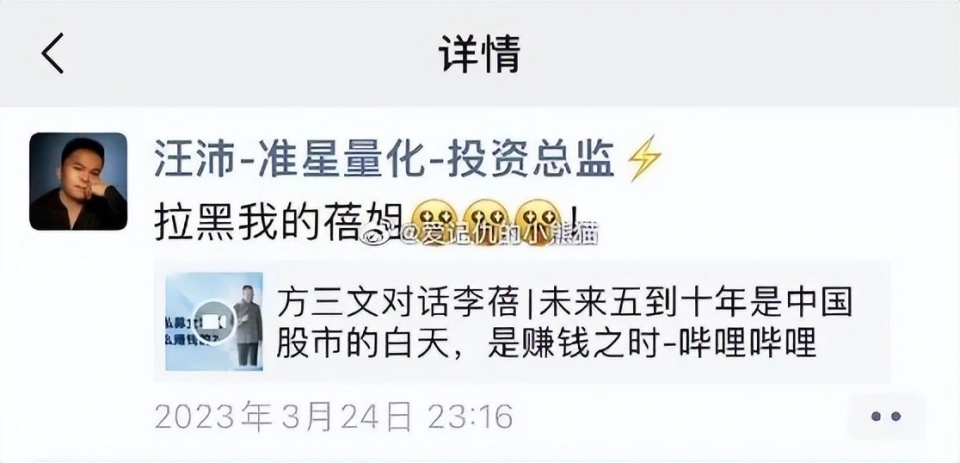 汪沛称中量投资产就兼职的由头有所发难,现在不但第一笔业绩报酬还没发放完毕,第二年高达3000多万元的业绩报酬也没有发放,乃至中量投资产还申请劳动仲裁,要求本身赔付5000多万元。除了和“前东家”开撕,汪沛迩来彻底火出了金融圈,缘故因由是晒腹肌照被李蓓拉黑。 文 | 金融八卦女作者:月月 · · · 迩来八妹似乎瓜田里上蹿下跳的猹,到处吃瓜……这不,金融圈又有大瓜了! 本年3月的时间,私募圈里一家中等规模的私募——中量投资产,和自家的基金司理汪沛撕起来了。 中量投资产说:汪沛在别的机构做兼职,违背劳动条约,被开除了。汪沛反驳:我和你名为劳动关系,实为“互助”关系(心田os:你管不着我)。 双方各执一词,撕的金融圈人尽皆知。直到迩来,这个互撕瓜又有了续集。 据上海证券报报道称,克日,汪沛告诉记者,已收到中量投资产的劳动仲裁申请书。可见,汪沛与中量投资产的纠纷尚未息争,乃至愈发剑拔弩张。 1. / 被李蓓拉黑的“腹肌大佬”讨薪 根本工资2360元,年度绩效3000万…… / 先来简单来回首一下前情概要。 3月2日,中量投资产发布了一则解聘公告:因汪沛涉嫌在第三方机构兼职、违背劳动条约等题目,中量投资产排除与其的劳动条约,同时汪沛也不再担当相应的投资司理。 但汪沛差异意中量投资产的说法,他表现,中量投资产与其名为劳动关系,实为“互助”或“通道”关系。 在继续媒体采访时,汪沛是这么说的: “我之前不停在做自营,2021年想创建本身的私募,但是当时协会规定基金司理具备1年以上的投资管理业绩才可以大概创办私募,因此我找到从前招商证券的向导董江文商量此事。董江文当时已创办了中量投资产,终极我决定入职中量投资产,先积累一年期业绩。” 八妹算看明确了,双方吵来吵去,分歧实在就两点: 1.汪沛到底是不是中量投资产的员工? 2.他到底做没做兼职? 但这个题目如今谁说了都不算,只能等末了劳动仲裁的靴子落地。迩来媒体报道称,汪沛已收到中量投资产的劳动仲裁申请书,表现开庭时间是5月。 但除了双方battle,这件事尚有一个值得关注的点,就是汪沛作为私募基金司理的薪酬环境。 据汪沛先容,在中量投资产任职期间,其所负责的战略以及投研团队均是自负盈亏,独立运作,与中量投资产签署的劳动条约也仅是权宜之计,条约约定的月根本工资仅2360元。 汪沛称中量投资产就兼职的由头有所发难,现在不但第一笔业绩报酬还没发放完毕,第二年高达3000多万元的业绩报酬也没有发放,乃至中量投资产还申请劳动仲裁,要求本身赔付5000多万元。 和“前东家”开撕后不久,汪沛彻底火出了金融圈,但缘故因由让人有点啼笑皆非。 3月尾,半夏投资的老板,也是私募圈著名的“私募魔女”李蓓,在一个行业交换的微信群里发了一张本身和别人的谈天记载,对方给李蓓发了一张本身的腹肌照。 更令人惊讶的是,私募大佬的腹肌照还不是单发的,而是群发的。 李蓓的谈天记载表现,“我之前就跟汪总说过,对他一点爱好都没有,盼望他不要总打搅我,然后依然收到了群发半裸照。” 你品,你细致品。 被李蓓拉黑后,汪沛还在朋侪圈挖苦:“拉黑我的蓓姐!” 还表现听说本身被黑了,索性自个儿再起个名字:宏观大女主与微观小弟弟。 听说,汪沛还通过视频公开展示过腹肌,他的说法是:展示实盘业绩: 要说汪沛也是有真才实学的,公开资料表现,汪沛结业于北京大学信息科学技能学院,在知识分子家庭长大,父亲是出书社总编,母亲是大学传授。他从小就对盘算机、数学感爱好,在北大读书期间,先后在微软亚洲研究院、IBM中国研究院、穆迪和中金公司练习。 2017年创建准星量化,专注国内与外洋市场高频做市业务,并将焦点战略推广至A股。2020-2022年劳绩年化收益率82.36%,最大回撤-7.2%,夏普率5.3,自营资金规模近3亿的实盘业绩。 在某些媒体的表述中,汪沛被称为“量化圈着名大佬”。迩来,他还作为高朋加入了人大专场的一场有关量化私募的线上分享。 但咱也是真的不明确,为啥印象中本该沉稳靠谱、踏实内敛的私募大佬,现实中这么执着于给人秀腹肌…… 2. / 旱的旱死、涝的涝死, 基金司理的薪酬结构有多奇葩? / 在吃瓜群众眼里,金融圈年薪百万才是常态,以是汪沛和中量投资产撕起来后,揭开了私募薪酬结构的奇葩一角:怎么基金司理的根本工资才两千出头? 各人都知道,基金司理就是操盘一支基金的灵魂人物,有句话叫“买基金就是买基金司理”。但无论是私募照旧公募,一样平常基金司理的薪酬结构告急照旧分为两块:根本工资和奖金收入。 关于根本工资,其着实雇用网站上搜一下就能望见大抵的薪酬范围,但由于公司的规模差异,以是薪酬范围跨度很大。 以北京地区为例,比力低的下限大概也就15k-25k,但“明星公募基金司理”的薪酬标价能到300k-350k,照旧30薪。 用一句话形容,那真是旱的旱死、涝的涝死…… 但像汪沛如许根本工资才2360的私募基金司理估计也是个例。为了相识真真相况,八妹还采访了一位在上海某量化私募工作的朋侪,据他透露,基金司理的底薪一样平常不太多(但照旧比金融民工高多了),但好的年份,光提成每年最少就是万万起步。 这就扳连到了薪酬的另一部分,也是基金司理工资的重头戏:年末奖。 现在较为广泛的说法是,公募的基金司理一样平常是从基金管理费里提成15%,私募的基金司理除了管理费提成外,
