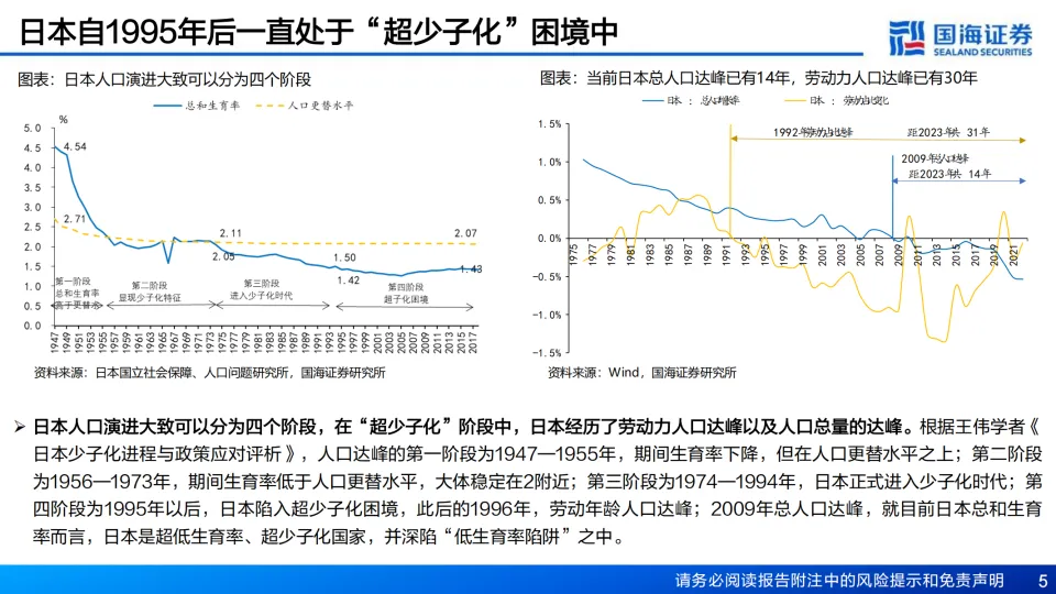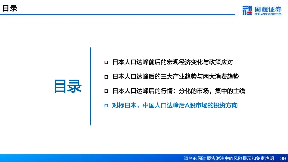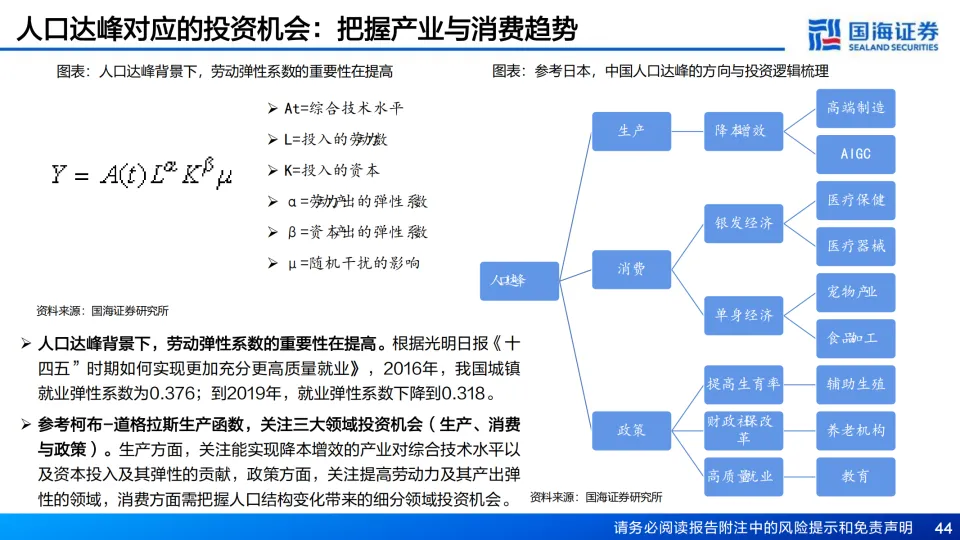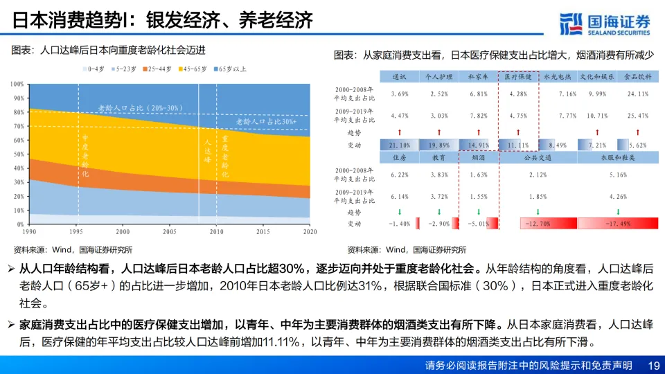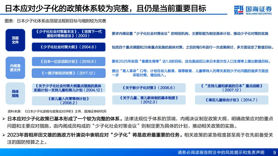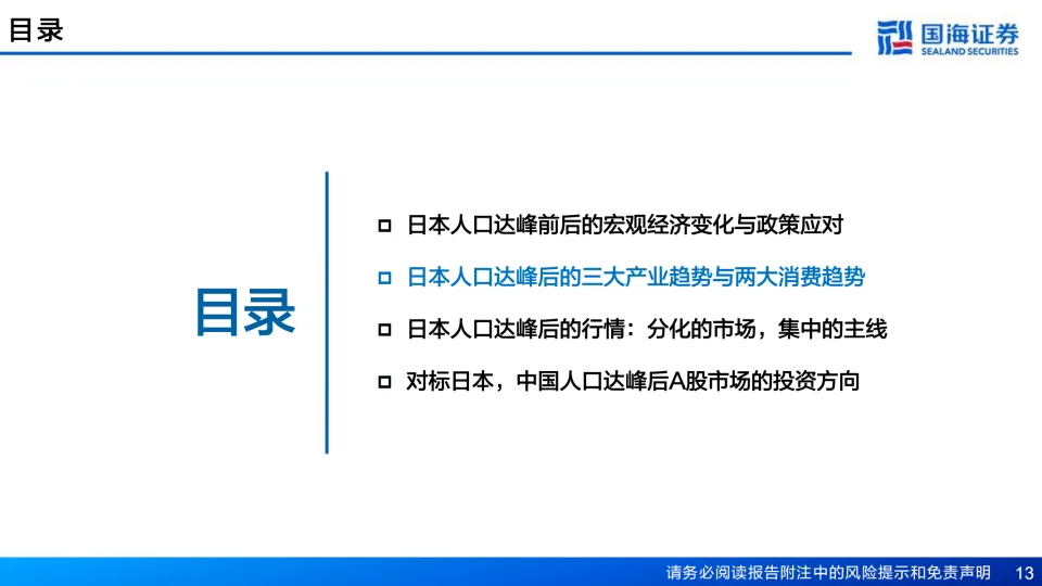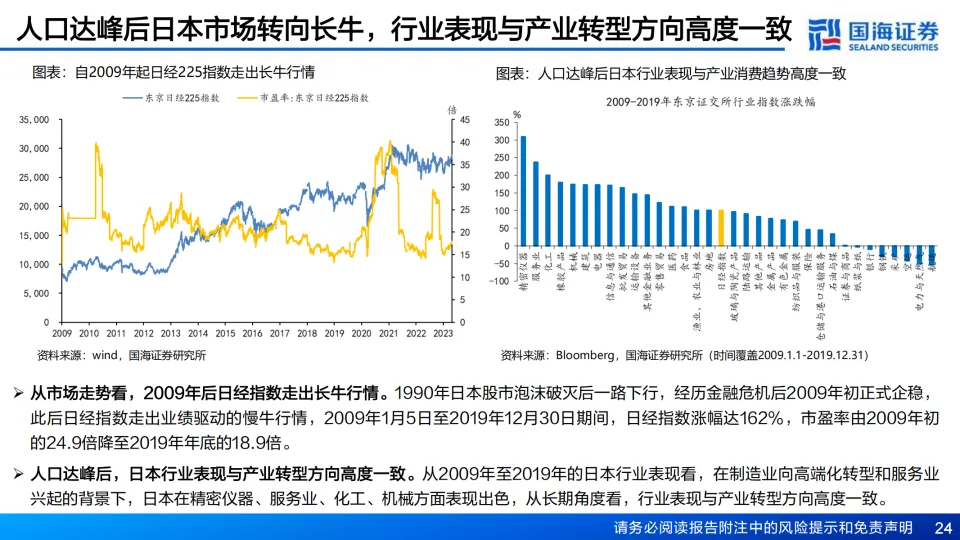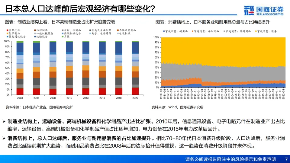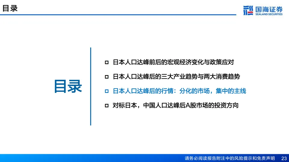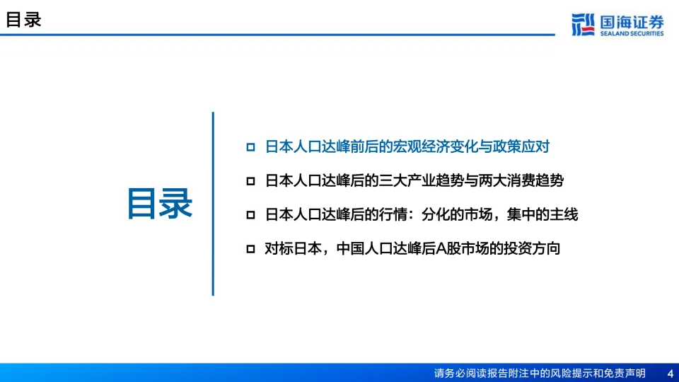 (陈诉出品方/作者:国海证券,胡国鹏,陈婉妤) 核心观点:日本生齿在“超少子化”阶段中履历了劳动力生齿达峰以及生齿总量的达峰,对于宏观经济的影响重要在于公共投资和地产投资的回落,制造业和 斲丧出现出结构性变革。停止2023年,日本总生齿达峰(2009年)已有14年,劳动力生齿占比达峰(1992年)已有31年,在这期间,日本面对 的重要社会题目在于少子老龄化与社保付出的结构,并在这两方向上出台了大量应对政策。日本投资回落的同时,制造业结构上,运输装备、高端 呆板装备和化学成品产出占比扩张。斲丧结构上,服务业与耐用品斲丧的占比加快提升。 日本生齿达峰后的生产端中,高端制造产业保持了扩张趋势,此中工业呆板人与半导体装备环球上风凸显,汽车产业出口渐渐凌驾内销,值得留意的是汽车内销结构上微型车销量提升。斲丧端中银发经济和只身经济的趋势对应了医疗及照顾护士、加工食品、宠物斲丧,便利店等贩卖额的抬升。生齿达峰后日经指数走出了业绩驱动的慢牛,结构性行情明显,行业主线与产业及斲丧趋势高度划一。在制造业高端化转型和服务业鼓起的配景下,日本股票市场中细密仪器、服务业、化工、呆板等行业体现亮眼。个股层面看涨幅较高的个股会合在科技制造和斲丧两大范畴,具体包罗半导体装备、IT、呆板、汽车以及斲丧中的制药和医疗保健。 中国生齿达峰对经济与社会的打击大概率会弱于日本。参考两国生齿达峰时点的各项数据来看,一方面我国政府杠杆率和社保付出的负担明显低于日本,在投资拉动经济增长的动能上限定较轻,另一方面,我国经济增长中枢、住民储备率、老龄化水平以及家庭结构皆优于日本,依然存在较大斲丧潜力。长周期视角来看,中国生齿达峰可以对应三大投资时机,一是生产端降本增效带来的产业趋势,二是斲丧端的“银发经济”与“只身经济”,三是应对生齿达峰的政策红利范畴。产业上,人工智能、工业呆板人等科技以及高端制造的发展将动员中国技能水平和资源投入弹性的提升。斲丧方面,疫情影响下部门都会已出现“类第四斲丧期间特性”,长期而言斲丧趋势将上向文娱、个护斲丧以及医疗保健等新斲丧赛道倾斜。为应对生齿达峰,国内政策将连续在进步生养率、促进高质量就业等方向发力,受益行业如辅助生殖、养老机构等有望迎来投资时机。 日本生齿达峰前后的宏观经济变革与政策应对日本自1995年后不绝处于“超少子化”逆境中 日本生齿演进大抵可以分为四个阶段,在“超少子化”阶段中,日本履历了劳动力生齿达峰以及生齿总量的达峰。根据王伟学者《 日本少子化进程与政策应对评析》,生齿达峰的第一阶段为1947—1955年,期间生养率降落,但在生齿更替水平之上;第二阶段 为1956—1973年,期间生养率低于生齿更替水平,大要稳固在2附近;第三阶段为1974—1994年,日本正式进入少子化期间;第 四阶段为1995年以后,日本陷入超少子化逆境,今后的1996年,劳动年事生齿达峰;2009年总生齿达峰,就现在日本总和生养 率而言,日本是超低生养率、超少子化国家,并深陷“低生养率陷阱”之中。 日本总生齿达峰前后宏观经济有哪些变革? 生齿总量达峰前后增长与通胀中枢并无显着趋势性变革。自1992年劳动年事生齿占比达峰后,日本经济增长中枢始终保持在1%左 右,通胀中枢保持在0.5%,增长与物价围绕中枢出现周期性颠簸。 结构上,公共、地产投资领先总生齿达峰下滑态势显着。劳动年事生齿达峰至总生齿达峰阶段,参考日本GDP分项的稳定价,公 共投资和私家住宅投资总额和增速在1996-2000年期间下行趋势显着,2008年后趋于安稳,而私家和政府斲丧、企业装备投资以 及净出口在1996年后仍以稳固中枢连续提升。 生齿达峰的重要社会影响:少子老龄化与社保付出缺口 随着生齿少子老龄化的不停加剧,在日本劳动力生齿中高龄劳动力生齿所占的比例不停上升。2019年,从65岁以上各年事段劳动 力生齿占比情况来看,65—69岁为48.4%,70—74岁为32.2%,75岁以上为10.3%。同时,高龄劳动者的就业率也在增多。 2019年,60—64岁、65—69岁、70—74岁年事段的就业率比2009年分别增长了13.3pct、12.2pct、10.4pct。 社会保障费是日本财务付出中最大的项目,日渐加剧的少子老龄化导致社会保障付出增长,国民负担加重。据田香兰《日本社会保 障与税收一体化改革回首及成效分析》,预计到2025年,日本年金、医疗、照顾护士等社会保障费将急剧增长,社会保障给付将到达 150万亿日元(占GDP的25%)。 日本应对少子化的政策体系较为完备,且还是当前告急目的 日本应对少子化政策已根本形成了一个较为完备的体系。法律法规位于体系的顶端,内阁决定订定政策大纲,明白政策应对的重点 题目和重要应对步调。由内阁成员构成的“少子化社会对策集会”则订定更为具体的筹划,推动相干政策的实行。 2023年宰衡岸田文雄的施政方针演说中表明应对“少子化”将是政府最告急的使命。相干政策的告急水平乃至高于在先前备受关 注的国防预算之上。 进步生养率的重点围绕五方面举行 根据《日本少子化进程与政策应对评析》王伟总结,进步生养率政策重点会合在5个方面,分别是经济救济、扩充婴幼儿保育服务 、推动工作方式改革、促进工作与生存相调和与为年轻人完婚生子创造条件。当前岸田政府提出的应对少子化三大步调,同