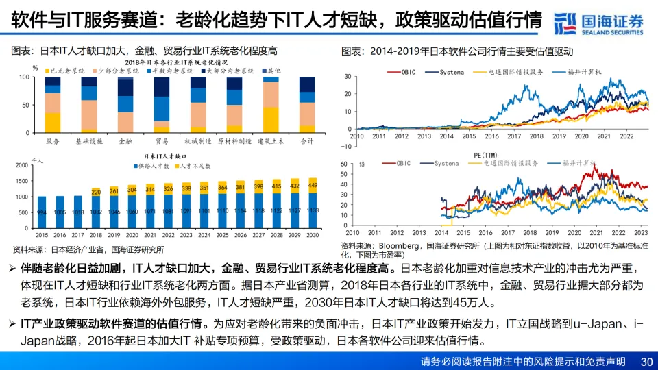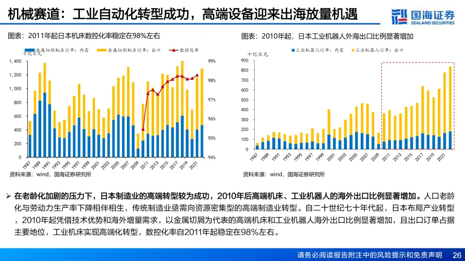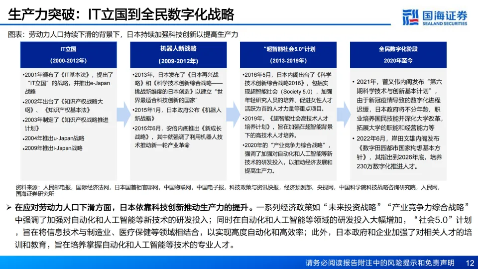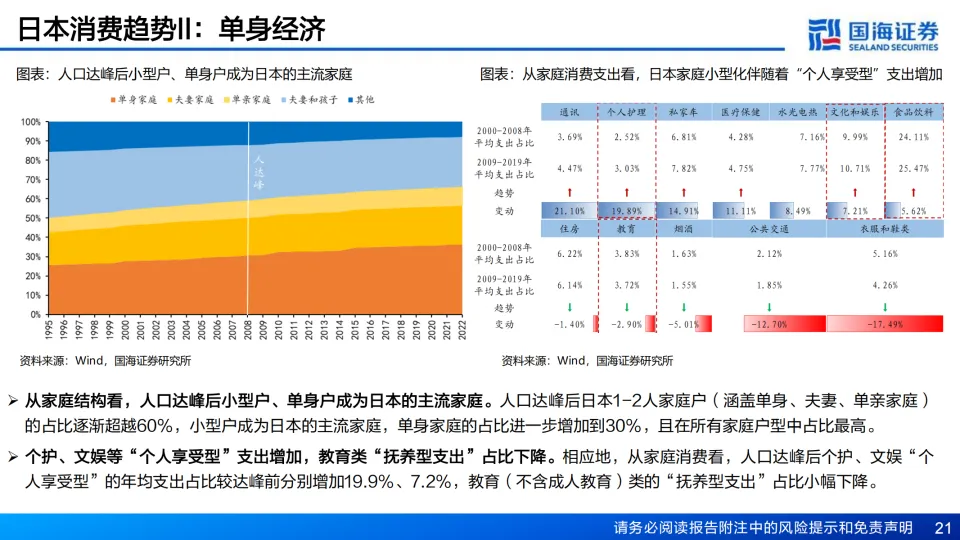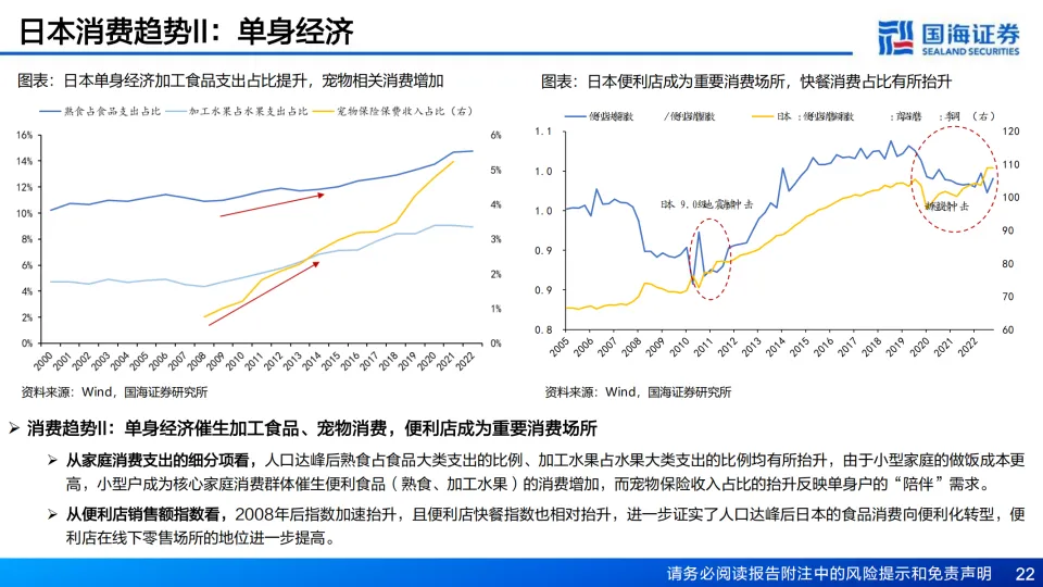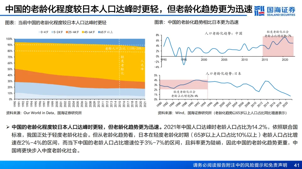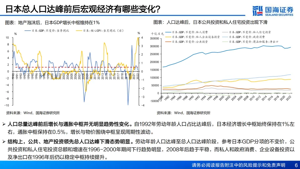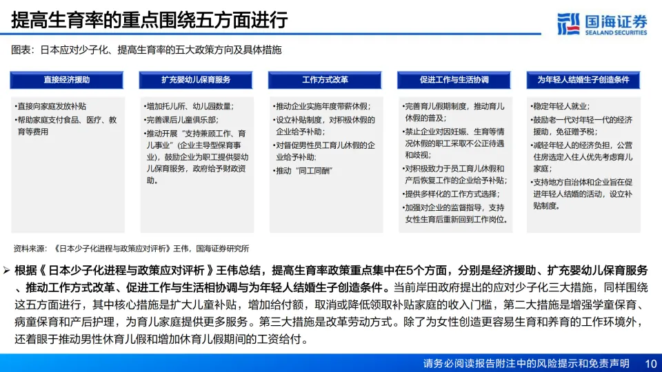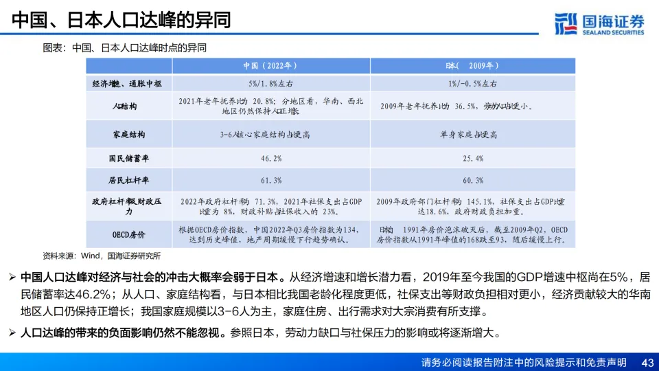 (陈诉出品方/作者:国海证券,胡国鹏,陈婉妤) 核心观点:日本生齿在“超少子化”阶段中履历了劳动力生齿达峰以及生齿总量的达峰,对于宏观经济的影响重要在于公共投资和地产投资的回落,制造业和 斲丧出现出结构性变革。停止2023年,日本总生齿达峰(2009年)已有14年,劳动力生齿占比达峰(1992年)已有31年,在这期间,日本面对 的重要社会题目在于少子老龄化与社保付出的结构,并在这两方向上出台了大量应对政策。日本投资回落的同时,制造业结构上,运输装备、高端 呆板装备和化学成品产出占比扩张。斲丧结构上,服务业与耐用品斲丧的占比加快提升。 日本生齿达峰后的生产端中,高端制造产业保持了扩张趋势,此中工业呆板人与半导体装备环球上风凸显,汽车产业出口渐渐凌驾内销,值得留意的是汽车内销结构上微型车销量提升。斲丧端中银发经济和只身经济的趋势对应了医疗及照顾护士、加工食品、宠物斲丧,便利店等贩卖额的抬升。生齿达峰后日经指数走出了业绩驱动的慢牛,结构性行情明显,行业主线与产业及斲丧趋势高度划一。在制造业高端化转型和服务业鼓起的配景下,日本股票市场中细密仪器、服务业、化工、呆板等行业体现亮眼。个股层面看涨幅较高的个股会合在科技制造和斲丧两大范畴,具体包罗半导体装备、IT、呆板、汽车以及斲丧中的制药和医疗保健。 中国生齿达峰对经济与社会的打击大概率会弱于日本。参考两国生齿达峰时点的各项数据来看,一方面我国政府杠杆率和社保付出的负担明显低于日本,在投资拉动经济增长的动能上限定较轻,另一方面,我国经济增长中枢、住民储备率、老龄化水平以及家庭结构皆优于日本,依然存在较大斲丧潜力。长周期视角来看,中国生齿达峰可以对应三大投资时机,一是生产端降本增效带来的产业趋势,二是斲丧端的“银发经济”与“只身经济”,三是应对生齿达峰的政策红利范畴。产业上,人工智能、工业呆板人等科技以及高端制造的发展将动员中国技能水平和资源投入弹性的提升。斲丧方面,疫情影响下部门都会已出现“类第四斲丧期间特性”,长期而言斲丧趋势将上向文娱、个护斲丧以及医疗保健等新斲丧赛道倾斜。为应对生齿达峰,国内政策将连续在进步生养率、促进高质量就业等方向发力,受益行业如辅助生殖、养老机构等有望迎来投资时机。 日本生齿达峰前后的宏观经济变革与政策应对日本自1995年后不绝处于“超少子化”逆境中 日本生齿演进大抵可以分为四个阶段,在“超少子化”阶段中,日本履历了劳动力生齿达峰以及生齿总量的达峰。根据王伟学者《 日本少子化进程与政策应对评析》,生齿达峰的第一阶段为1947—1955年,期间生养率降落,但在生齿更替水平之上;第二阶段 为1956—1973年,期间生养率低于生齿更替水平,大要稳固在2附近;第三阶段为1974—1994年,日本正式进入少子化期间;第 四阶段为1995年以后,日本陷入超少子化逆境,今后的1996年,劳动年事生齿达峰;2009年总生齿达峰,就现在日本总和生养 率而言,日本是超低生养率、超少子化国家,并深陷“低生养率陷阱”之中。 日本总生齿达峰前后宏观经济有哪些变革? 生齿总量达峰前后增长与通胀中枢并无显着趋势性变革。自1992年劳动年事生齿占比达峰后,日本经济增长中枢始终保持在1%左 右,通胀中枢保持在0.5%,增长与物价围绕中枢出现周期性颠簸。 结构上,公共、地产投资领先总生齿达峰下滑态势显着。劳动年事生齿达峰至总生齿达峰阶段,参考日本GDP分项的稳定价,公 共投资和私家住宅投资总额和增速在1996-2000年期间下行趋势显着,2008年后趋于安稳,而私家和政府斲丧、企业装备投资以 及净出口在1996年后仍以稳固中枢连续提升。 生齿达峰的重要社会影响:少子老龄化与社保付出缺口 随着生齿少子老龄化的不停加剧,在日本劳动力生齿中高龄劳动力生齿所占的比例不停上升。2019年,从65岁以上各年事段劳动 力生齿占比情况来看,65—69岁为48.4%,70—74岁为32.2%,75岁以上为10.3%。同时,高龄劳动者的就业率也在增多。 2019年,60—64岁、65—69岁、70—74岁年事段的就业率比2009年分别增长了13.3pct、12.2pct、10.4pct。 社会保障费是日本财务付出中最大的项目,日渐加剧的少子老龄化导致社会保障付出增长,国民负担加重。据田香兰《日本社会保 障与税收一体化改革回首及成效分析》,预计到2025年,日本年金、医疗、照顾护士等社会保障费将急剧增长,社会保障给付将到达 150万亿日元(占GDP的25%)。 日本应对少子化的政策体系较为完备,且还是当前告急目的 日本应对少子化政策已根本形成了一个较为完备的体系。法律法规位于体系的顶端,内阁决定订定政策大纲,明白政策应对的重点 题目和重要应对步调。由内阁成员构成的“少子化社会对策集会”则订定更为具体的筹划,推动相干政策的实行。 2023年宰衡岸田文雄的施政方针演说中表明应对“少子化”将是政府最告急的使命。相干政策的告急水平乃至高于在先前备受关 注的国防预算之上。 进步生养率的重点围绕五方面举行 根据《日本少子化进程与政策应对评析》王伟总结,进步生养率政策重点会合在5个方面,分别是经济救济、扩充婴幼儿保育服务 、推动工作方式改革、促进工作与生存相调和与为年轻人完婚生子创造条件。当前岸田政府提出的应对少子化三大步调,同