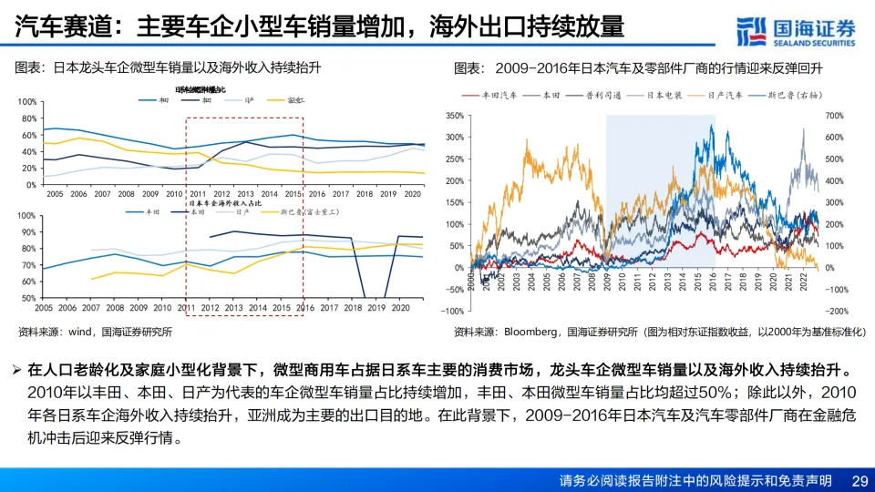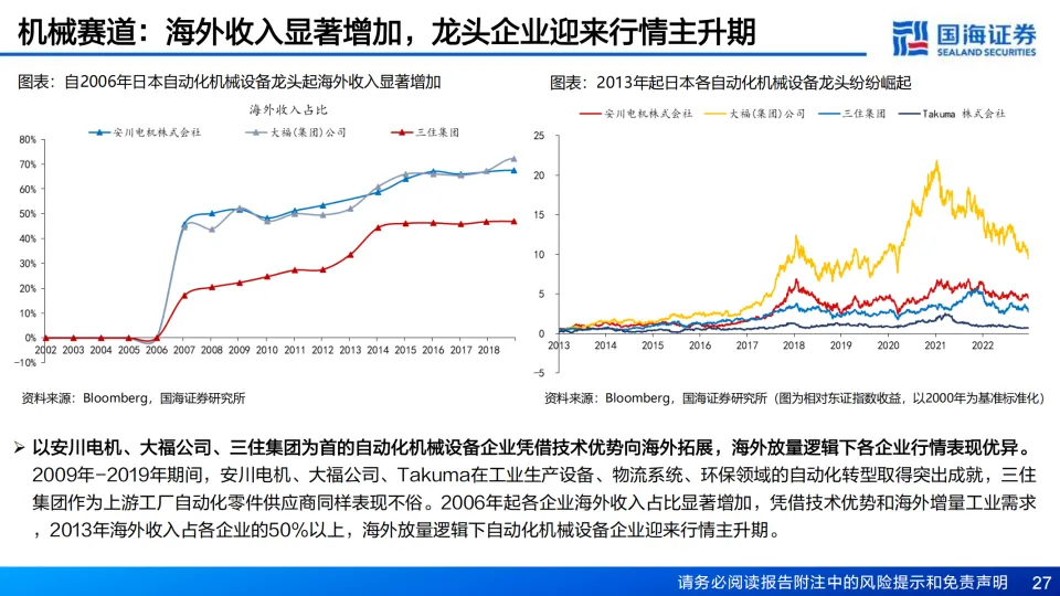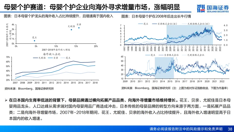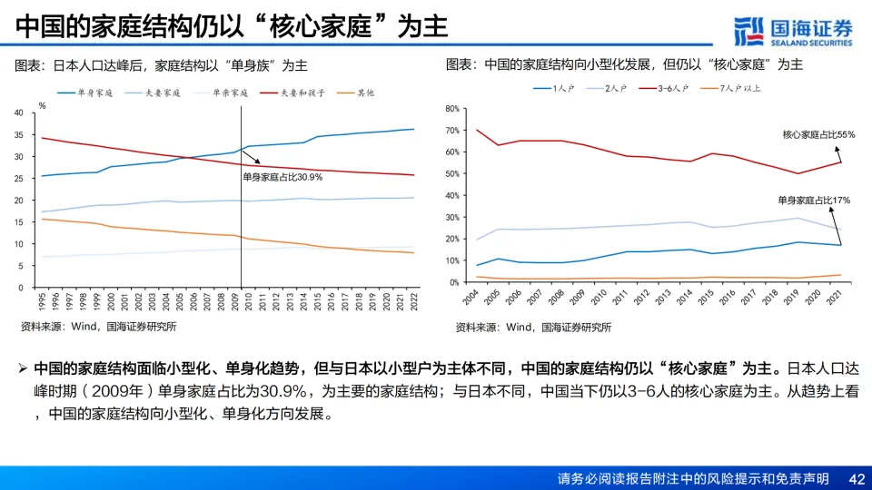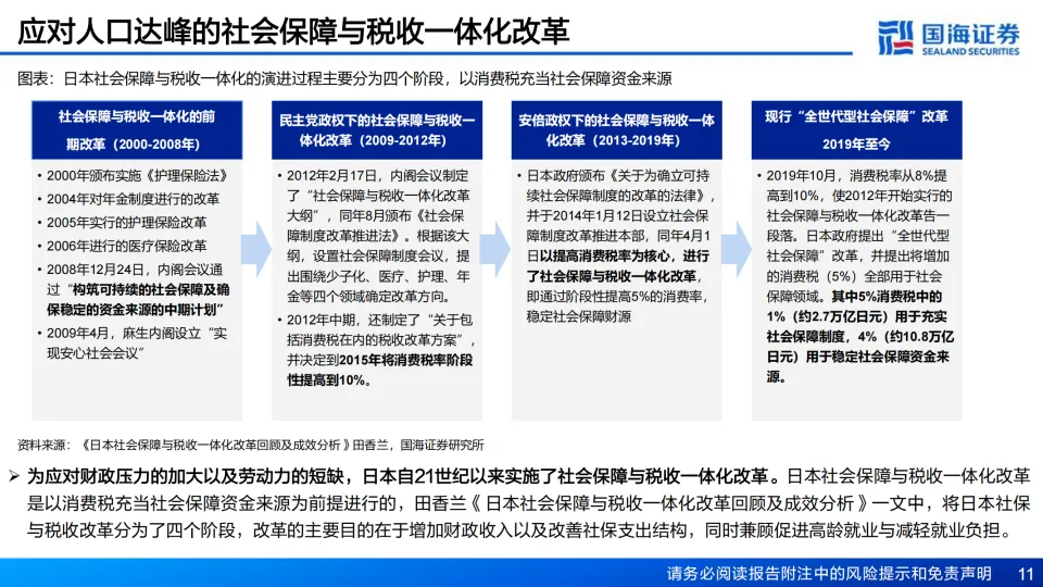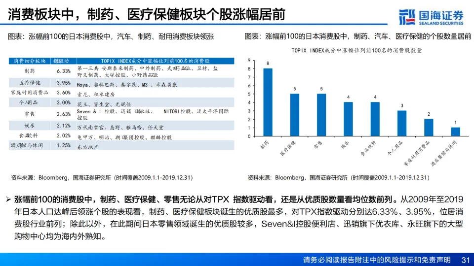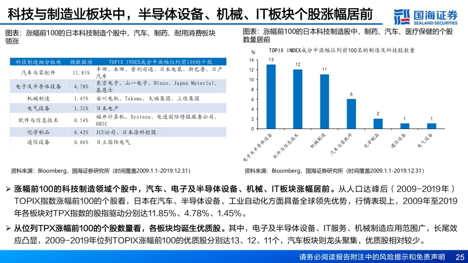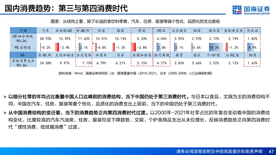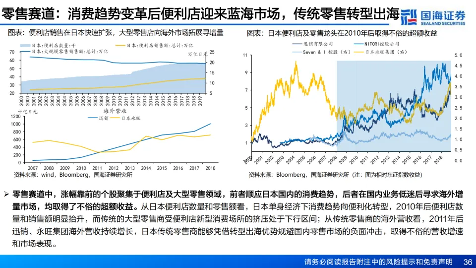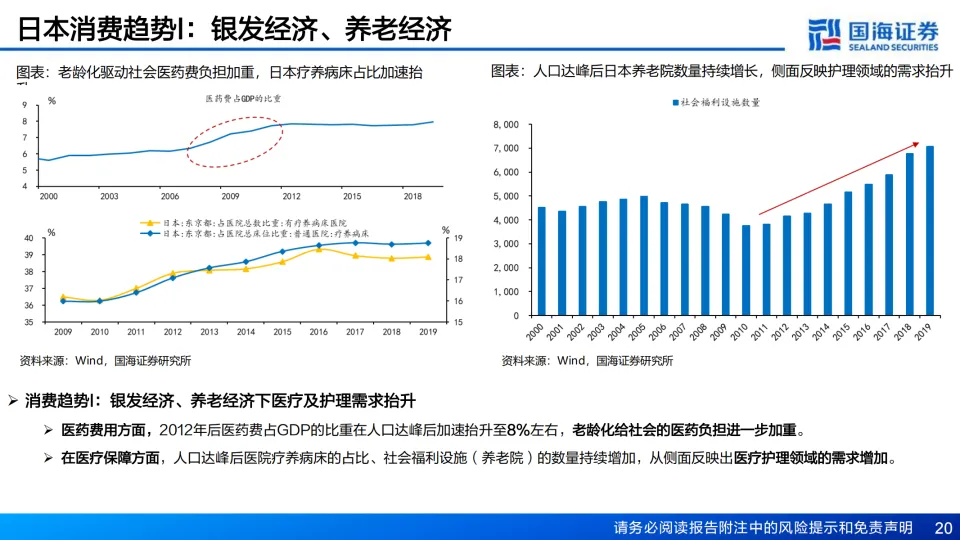 (陈诉出品方/作者:国海证券,胡国鹏,陈婉妤) 核心观点:日本生齿在“超少子化”阶段中履历了劳动力生齿达峰以及生齿总量的达峰,对于宏观经济的影响重要在于公共投资和地产投资的回落,制造业和 斲丧出现出结构性变革。停止2023年,日本总生齿达峰(2009年)已有14年,劳动力生齿占比达峰(1992年)已有31年,在这期间,日本面对 的重要社会题目在于少子老龄化与社保付出的结构,并在这两方向上出台了大量应对政策。日本投资回落的同时,制造业结构上,运输装备、高端 呆板装备和化学成品产出占比扩张。斲丧结构上,服务业与耐用品斲丧的占比加快提升。 日本生齿达峰后的生产端中,高端制造产业保持了扩张趋势,此中工业呆板人与半导体装备环球上风凸显,汽车产业出口渐渐凌驾内销,值得留意的是汽车内销结构上微型车销量提升。斲丧端中银发经济和只身经济的趋势对应了医疗及照顾护士、加工食品、宠物斲丧,便利店等贩卖额的抬升。生齿达峰后日经指数走出了业绩驱动的慢牛,结构性行情明显,行业主线与产业及斲丧趋势高度划一。在制造业高端化转型和服务业鼓起的配景下,日本股票市场中细密仪器、服务业、化工、呆板等行业体现亮眼。个股层面看涨幅较高的个股会合在科技制造和斲丧两大范畴,具体包罗半导体装备、IT、呆板、汽车以及斲丧中的制药和医疗保健。 中国生齿达峰对经济与社会的打击大概率会弱于日本。参考两国生齿达峰时点的各项数据来看,一方面我国政府杠杆率和社保付出的负担明显低于日本,在投资拉动经济增长的动能上限定较轻,另一方面,我国经济增长中枢、住民储备率、老龄化水平以及家庭结构皆优于日本,依然存在较大斲丧潜力。长周期视角来看,中国生齿达峰可以对应三大投资时机,一是生产端降本增效带来的产业趋势,二是斲丧端的“银发经济”与“只身经济”,三是应对生齿达峰的政策红利范畴。产业上,人工智能、工业呆板人等科技以及高端制造的发展将动员中国技能水平和资源投入弹性的提升。斲丧方面,疫情影响下部门都会已出现“类第四斲丧期间特性”,长期而言斲丧趋势将上向文娱、个护斲丧以及医疗保健等新斲丧赛道倾斜。为应对生齿达峰,国内政策将连续在进步生养率、促进高质量就业等方向发力,受益行业如辅助生殖、养老机构等有望迎来投资时机。 日本生齿达峰前后的宏观经济变革与政策应对日本自1995年后不绝处于“超少子化”逆境中 日本生齿演进大抵可以分为四个阶段,在“超少子化”阶段中,日本履历了劳动力生齿达峰以及生齿总量的达峰。根据王伟学者《 日本少子化进程与政策应对评析》,生齿达峰的第一阶段为1947—1955年,期间生养率降落,但在生齿更替水平之上;第二阶段 为1956—1973年,期间生养率低于生齿更替水平,大要稳固在2附近;第三阶段为1974—1994年,日本正式进入少子化期间;第 四阶段为1995年以后,日本陷入超少子化逆境,今后的1996年,劳动年事生齿达峰;2009年总生齿达峰,就现在日本总和生养 率而言,日本是超低生养率、超少子化国家,并深陷“低生养率陷阱”之中。 日本总生齿达峰前后宏观经济有哪些变革? 生齿总量达峰前后增长与通胀中枢并无显着趋势性变革。自1992年劳动年事生齿占比达峰后,日本经济增长中枢始终保持在1%左 右,通胀中枢保持在0.5%,增长与物价围绕中枢出现周期性颠簸。 结构上,公共、地产投资领先总生齿达峰下滑态势显着。劳动年事生齿达峰至总生齿达峰阶段,参考日本GDP分项的稳定价,公 共投资和私家住宅投资总额和增速在1996-2000年期间下行趋势显着,2008年后趋于安稳,而私家和政府斲丧、企业装备投资以 及净出口在1996年后仍以稳固中枢连续提升。 生齿达峰的重要社会影响:少子老龄化与社保付出缺口 随着生齿少子老龄化的不停加剧,在日本劳动力生齿中高龄劳动力生齿所占的比例不停上升。2019年,从65岁以上各年事段劳动 力生齿占比情况来看,65—69岁为48.4%,70—74岁为32.2%,75岁以上为10.3%。同时,高龄劳动者的就业率也在增多。 2019年,60—64岁、65—69岁、70—74岁年事段的就业率比2009年分别增长了13.3pct、12.2pct、10.4pct。 社会保障费是日本财务付出中最大的项目,日渐加剧的少子老龄化导致社会保障付出增长,国民负担加重。据田香兰《日本社会保 障与税收一体化改革回首及成效分析》,预计到2025年,日本年金、医疗、照顾护士等社会保障费将急剧增长,社会保障给付将到达 150万亿日元(占GDP的25%)。 日本应对少子化的政策体系较为完备,且还是当前告急目的 日本应对少子化政策已根本形成了一个较为完备的体系。法律法规位于体系的顶端,内阁决定订定政策大纲,明白政策应对的重点 题目和重要应对步调。由内阁成员构成的“少子化社会对策集会”则订定更为具体的筹划,推动相干政策的实行。 2023年宰衡岸田文雄的施政方针演说中表明应对“少子化”将是政府最告急的使命。相干政策的告急水平乃至高于在先前备受关 注的国防预算之上。 进步生养率的重点围绕五方面举行 根据《日本少子化进程与政策应对评析》王伟总结,进步生养率政策重点会合在5个方面,分别是经济救济、扩充婴幼儿保育服务 、推动工作方式改革、促进工作与生存相调和与为年轻人完婚生子创造条件。当前岸田政府提出的应对少子化三大步调,同