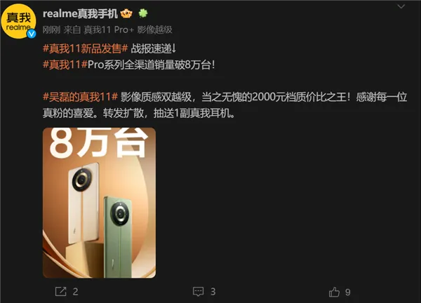 快科技5月15日消息,真我11 Pro系列本日正式开卖,1TB顶配版只要2599元。 刚刚realme真我官方也公布了首销战报,真我11 Pro系列全渠道销量破8万台。 与其他厂商公布的战报相比,真我直接公布了实着实在的销量数据,没有加上一堆定语凑出各种销量大概贩卖额冠军,这点上开阔多了。 5月10日真我正式发布了真我11系列手机,有真我11、真我11 Pro及真我11 Pro+三个型号。 此中真我11 Pro/11 Pro+均搭载联发科天玑7050处置惩罚器,采取6.7英寸天马OLED双曲屏,分辨率为2412*1080,支持120Hz革新率,2160Hz高频PWM调光。 影像方面,真我11 Pro+前置3200万像素居中挖孔镜头,后置2亿像素主摄,支持OIS光学防抖、4倍无损变焦,辅以800万像素超广角和200万像素人像三摄镜头,Pro版后置1亿像素主摄,支持2倍无损变焦。 新机内置5000mAh电池,支持100W快充(11 Pro为67W),配备NFC、杜比双扬声器、屏幕指纹辨认。 售价方面,真我11 Pro起价1699元,真我11 Pro+起价1999元,顶配的12+1TB首发售价2599元。 |