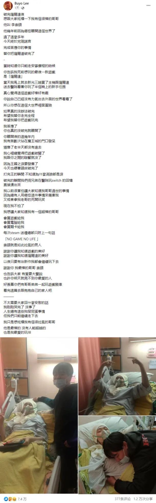 克日,曾替任天国Switch发售保驾护航立下汗马功劳的《塞尔达传说:旷野之息》,其续作《王国之泪》终于解禁啦! 对于这款风靡环球的游戏,信托不消我再多说什么了,不知道各人有没有玩上呢? 而本日我不是来跟各人唠游戏有多好玩的,是要分享一则暖心的故事给你们。 假如你迩来有刷微博的话,就会看到一条“弟弟帮离世哥哥通关塞尔达”如许的消息。 我稍微相识一下变乱背后的颠末,是真的非常感人。 中国台湾玩家Buyo Lee在Meta(也就是脸书)上分享了自己通关了《塞尔达传说:旷野之息》背后的故事,原来,这是他为了吊唁自己已经去世的哥哥。 图片泉源:@Buyo Lee 他在文中表现《塞尔达传说:旷野之息》是毗连他,和因癌症去世的哥哥李崇硕的一个告急的回想。 Buyo Lee说,哥哥住院告急之际,最想玩的游戏就是《旷野之息》,由于他已经没有力气再去表面的天下看看了,盼望能在这个天下里冒险。 于是,Buyo Lee快马加鞭的替哥哥买来了这个游戏,一起走完了新手教程。 图片泉源:@Buyo Lee 在哥哥离开后,Buyo Lee无数次站在盖农城堡门口迟迟没有进去,不是由于打不外,而是在夷由,夷由自己假如通关了,大概和哥哥之间的纽带也就竣事了。 但是现在,《塞尔达传说:王国之泪》发售了,他以为无论怎样都要买通关,不能再耽搁。 打败大魔王盖农之后,他满脸都是泪水,和哥哥相处的点点滴滴回想涌上心头…… 图片泉源:@Buyo Lee 鼓起勇气的他把这件事分享出来,而且想告诉各人,他的哥哥是多么的帅气。在生前,哥哥会买游戏给他、会买电脑给我、会买显卡给我、每次Steam送礼都会附上一句话: NO GAME NO LIFE(不游戏,无生存) 图片泉源:@Buyo Lee Buyo Lee末了也告诉各人,人生总有许多屎尿屁的垃圾变乱,但是肯定不要忘记,偶然间偶然秘密多伴随、拥抱自己的家人朋侪。说真话,看完我真的以为很暖心,网友们也都表现,任天国真的是天国;有如许的弟弟、哥哥真好。 别的,故事另有个更加暖心的了局,中国台湾任天国官方也接洽到了Buyo Lee,在相识完变乱颠末后,赠予了弟弟一份《塞尔达传说:王国之泪》游戏,盼望可以大概一连两兄弟的拘束。 图片泉源:@Buyo LeeBuyo Lee高兴的在网上分享到:我老哥知道肯定会爽死,这个礼物我会好好生存的。 可以大概直接用“爽死”来转达已故哥哥的心情,看得出来,Buyo Lee是打心田开心,应该也走出那段伤心回想了吧。 大概有人看完会以为,这会不会是一次炒作?毕竟在网上久了,也看了太多无聊的营销。 但我以为,无论怎样,这是一份爱的通报和毗连,就像林克的名字Link一样,是能突破齐备的,这个暖心故事的背后,是真实存在的情面味。 就像之前一位患癌玩家,在拿到了科乐美官方赠予的环球仅一张的“巨大的兵士 泰勒”卡牌后,古迹般降服病魔一样。 就算他厥后给拍卖了,卖出了超200万人民币的天价,但这个故事是真的,确确实实发生过的。 好了,末了盼望各位不管玩不玩游戏的朋侪,都能好好享受生存,积极去接待每一天鸭。 |