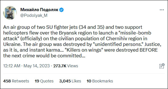 (观察者网讯)俄罗斯《买卖人报》13日独家报道称,当天俄空天军有四架军用机在与乌克兰接壤的俄布良斯克地区坠毁。有分析以为,系被乌克兰方面击落。 克制发稿,俄罗斯官方仅公开确认当地有两架飞机坠毁。乌克兰官方未宣称对事故负责,但乌总统顾问波多利亚克在推特上称此事体现了“公理”。 据《买卖人报》消息,同属俄空天军一个突袭小队的一架苏-35战斗机、一架苏-34战斗机和两架米-8直升机,当天在一次伏击中“险些同时被击落”,机上职员均已殒命。坠毁位置在俄罗斯布良斯克地区,毗连乌克兰东北部。 路透社指出,《买卖人报》没有就此给出证据,但许多俄罗斯亲战军事博主也在其交际媒体上提出了同样的说法。传播在推特和电报上的许多视频似乎捕捉到了一架“苏式”战斗机和一架“米式”直升机燃烧坠落的样子,尚有画面表现当地告急服务部分在有坠落残骸的农田附近灭火。 与此同时,俄罗斯官方仅公开确认有两架飞机在该地区坠毁。据“本日俄罗斯”(RT),俄罗斯塔斯社13日援引布良斯克政府负责人称,当天有一架苏-34战斗机在当地坠毁,但未分析具体缘故原由。 塔斯社早些时间还援引一名告急服务官员说法报道,一架“身份不明的”直升机因引擎起火,在隔断俄乌疆域约40公里的布良斯克州克林齐(Klintsy)市附近坠毁。据悉,一名51岁的女性被直升机碎片击中并烧伤。 乌克兰官方也未对该消息做出回应。路透社称,乌克兰通常拒绝对俄境内遭打击的报道发表品评。据美国“政治消息网”报道,乌空军司令部发言人尤里·伊格纳特拒绝确认或否认有关飞机坠落的信息。 不外,乌总统顾问波多利亚克在推特上称,这四架俄军机意在对乌布衣发动“导弹炸弹打击”,但“被‘身份不明的人’摧毁”。他还称,这起事故体现了“公理”,是“现世报”。 《买卖人报》称,根据“开端数据”,这四架军用机的任务是对乌克兰北部切尔尼戈夫地区举行轰炸,两架战斗机负责举行导弹和炸弹攻击,而直升机应负责支持。报道还引述专家说法称,这四架军用机很大概是被空对空导弹击落。 本文系观察者网独家稿件,未经授权,不得转载。 |