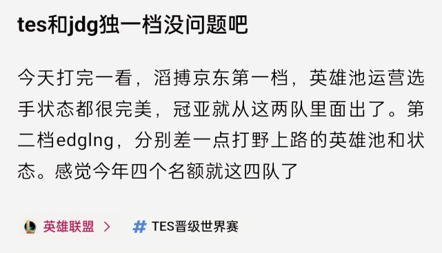 现在LPL夏季赛季后赛也是靠近尾声的状态,那么不少观众朋侪们也都在讨论到底这个赛季哪一支队伍可以大概夺冠,实际上现在团体看下来的话,几支队伍的力气比力地靠近,比如TES和JDG,包罗在这个赛季季后赛当中,我们看到EDG战队再度显现出来了一种慢热的状态,队员的体现跟通例赛简直是大相径庭的两种风格以是说这个赛季夺冠战队实际上照旧有着比力大的大概性。 不外照旧有不少朋侪们发表了,自己对于这个赛季队伍的力气见解,有网友以为在这个赛季力气排在独一档的也就是第一梯队的只有两支队伍,分别是TES和JDG,由于在近期的比赛当中,TES先是3:2击败了EDG战队,而后JDG又直接以一个大比分的战绩直接是横扫了lng战队,以是颠末了这两场比赛之后,根本上奠基了这两支队伍在现在季后赛的统治力。 而在通例赛阶段的时间,这两支队伍原来就是积分排行榜前三的队伍,另有一个就是v5战队,但是v5在通例赛后期的场场比赛当中就可以看到状态已经开始下滑了,包罗职员方面的变更,尤其是会集在打野位置之上,只管在上个赛季同样也是霸占积分排行榜的第一名,但是实际上在季后赛当中的体现就犹如两支队伍,以是依照当前的环境来看的话,V5跟上述两支队伍照旧有着肯定的差距。 而北枫作为一名着名的好汉同盟技能型主播,寻常总是会给他带来各种好汉的极限利用,也黑白常的心旷神怡。那么北枫这段时间在直播的时间也聊起来了自己对于季后赛,对于夏季赛冠军力气的见解,北枫也以为JDG和TES,现在看起来的话,渴望是最大的。 但是北枫以为,EDG战队现在的力气也是不容忽视的,究竟在上一场比赛当中也是跟滔搏战队打满了bo5,如果状态保持的非常不错的话,以致是在后续有着一战之力的。 总体来说,这个赛季最惊艳的实在照旧要数JDG,不少人体现如果369当初没有从滔搏离开,现在的滔搏,再加上一个上单369的话,那恐怕真的是逆天力气了,固然这都是后话,那么小搭档们看好这个赛季谁可以大概夺冠呢? |