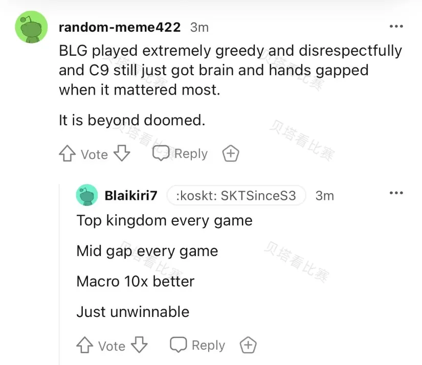 MSI正赛中,BLG乐成以3-0的战绩横扫C9,晋级下一轮。很快这场比赛也引发了不少外洋网友的热议,一起来看看他们的观点是什么吧! -赛区的差距很显着。 -西方战队上一次降服东方战队是什么时间? -每个BO5最显着的就是中路差距,感觉差距有银河那么大,太疯狂了。 -这场就像是chovy vs Caps,巨大的差距,团队其他人真的很难补充。 -BLG打得非常贪心和无礼,而C9在最关键的时间丢掉了他们的大脑和操纵,结果是注定的。 -上路每场都是王级别的发挥,中路每场都有差距,运营好10倍,C9就是赢不了。 -BLG的团战也更强一些。 -0-3的ELK卢锡安仍旧在C9头上拉屎,这个画面会在我的影象中停顿很长时间。 -C9是西方战队唯一有望夺冠的队伍,但是他们被打得屁滚尿流,统统都竣事了。 -我以为G2大概可以对抗BLG。 -我知道一旦NA和EU开始狂吹C9,这场比赛就会是3-0。 -趁便说一句,这着实是现在气力最靠近的BO5。 -但是G2赢了一场。 -我以为MAD打得最好,只是第一局被翻盘后心态崩了。 -确实气力靠近,由于没有在16分钟就输掉比赛。 -BLG现在每场比赛都表现出色,但是他们现在的发挥还不如他们在LPL季后赛的发挥。 -C9有过一些出色的时间,但是他们在第一局和第二局的中期很摆脱。总的来说,BLG的运营更强一些,他们很会使用舆图来做一些生意业务。 -Emenes整个BO5都没用。 -NA对于berserker来说是监狱,他必要离开这个赛季,才气在LCK打比赛。 -Blaber和Berserker积极了,但是C9照旧劣势,特殊是运营和团战,BLG险些围绕整个舆图在打,而且赢下了大部分的团战。 -BLG之前被太过低估了,他们只是输给了GG一个小场,就有很多人开始瞧不起BLG。 -Reddit经常如许小瞧LPL战队。 -跟LPL无关,在EU全败后,这里在狂吹NA。 -但是BLG仍旧是东方最弱的战队。 -NA粉丝看到了好的一面,固然我们以0-3的战绩输了,但是我们没有像G2和MAD那样,不到20分钟就被暴打了。 -Blaber在整个BO5都打得很好,但是上中的对线差距有点大。 -BLG险些犯了400个失误,但是他们仍旧3-0得胜了。 -由于Fudge一个人就犯了500个错误。 -bin太强了。 -下一轮我们将看到LCK和LPL决赛的重赛,C9的运营很糟糕。 -可以确认GG强于C9。 -ON着实没做什么特殊的变乱,但是辅助差距无法逾越,Fudge这场应该很尴尬。 -高出了17分钟,我们没输。 那么,对于这些外洋网友们的观点,你们有什么想说的吗?接待在批评区留言探究。想看更多外洋网友热议的话,关注贝塔吧! |