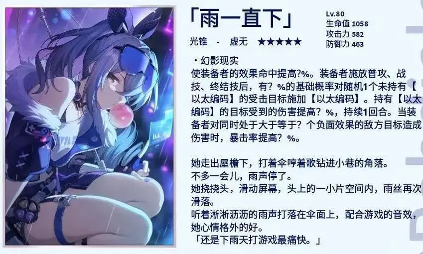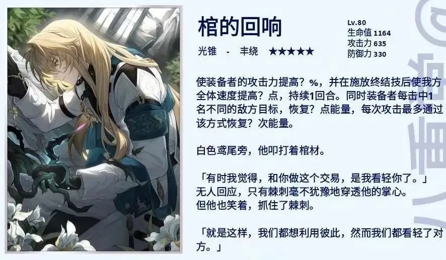 崩坏星穹铁道1.1版本up池有最新消息爆料哦!预计上半卡池为银狼,下半卡池为罗刹,新光锥为雨不绝下、棺的反响,活动光锥为新手任务开始前,还想更加相识新版本up池环境,不妨看看下面的内容。 一、1.1新脚色 上半卡池:银狼 1、脚色先容:银狼为虚无命途的五星量子属性近战脚色,具有单体攻击发作效果,我们可以把银狼作育成辅助伤害定位脚色,其技能不光可以造成单体高额伤害作用,还可增长对手的负面buff作用,从而有效包管队伍的输出效果。 2、升级质料: 下半卡池:罗刹 1、脚色先容:罗刹为丰饶命途的五星虚数属性奶妈脚色,脚色可奶可攻,其技能不光后期战斗起来很好用,也可使得血量低的队友立马血量拉满,而且其技能复兴方面也与攻击力息息干系,更高的攻击力也可使得技能复兴会更高! 2、升级质料: 二、1.1新光锥 新光锥:雨不绝下、棺的反响 1、雨不绝下:五星光锥,银狼的专武,此光锥可以提升掷中效果,同时也可提升攻击目标所受到的伤害。 2、棺的反响:五星光锥,罗刹的专武,此光锥不光可以提升攻击力,还可群奶队友使得队友快速回血。 活动光锥:新手任务开始前 四星光锥,由于此光锥可以通过活动免费获取,因此还是挺值得玩家拿到的。现在看新手任务开始前适配脚色为银狼等。 编辑:川川云手机-xin 时间:2023年5月10日 |