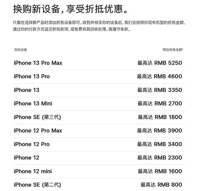 为了鼓励用户升级到最新的iPhone14系列,苹果公司调解了美国市场旧款iPhone的换购代价。根据苹果官网的表现,部分高端iPhone机型的换购代价有所上涨,而低端和mini机型则有所降落。 具体来看,iPhone 13 Pro Max、iPhone 13 Pro、iPhone 12 Pro Max、iPhone 12 Pro 和 iPhone 11Pro等机型的换购代价都有所进步,最高可达630美元。而iPhone 13 mini、iPhone 12 mini、iPhoneSE(第二代)等机型的换购代价则有所低沉,最低仅为90美元。 在苹果中国官网上,可以看到iPhone 13 Pro Max的最高折抵金额高达5250元。不外,此举也遭到不少网友的吐槽,毕竟苹果的以旧换新每每给不到宣称的折抵金额,末了得手的代价要远低于二手市场的代价。 (8173032) |