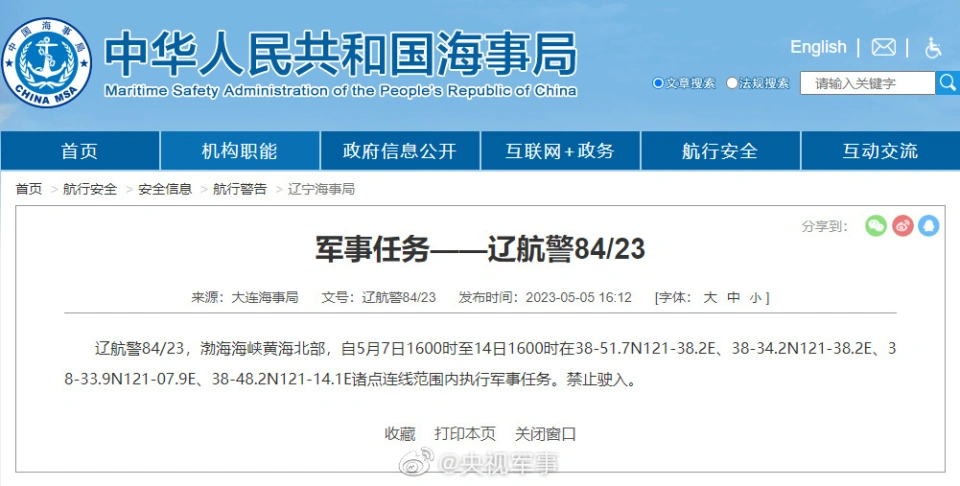 据中国海事局网站消息,大连海事局发布飞行告诫,自5月7日16时至14日16时,渤海海峡黄海北部实行军事使命,克制驶入。 |