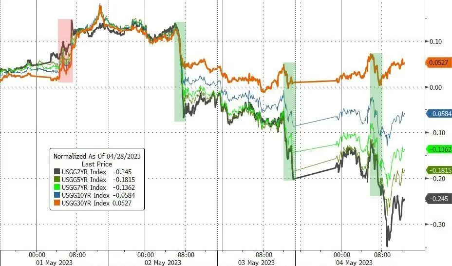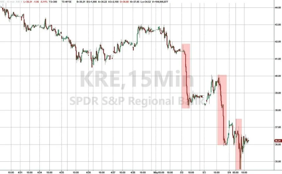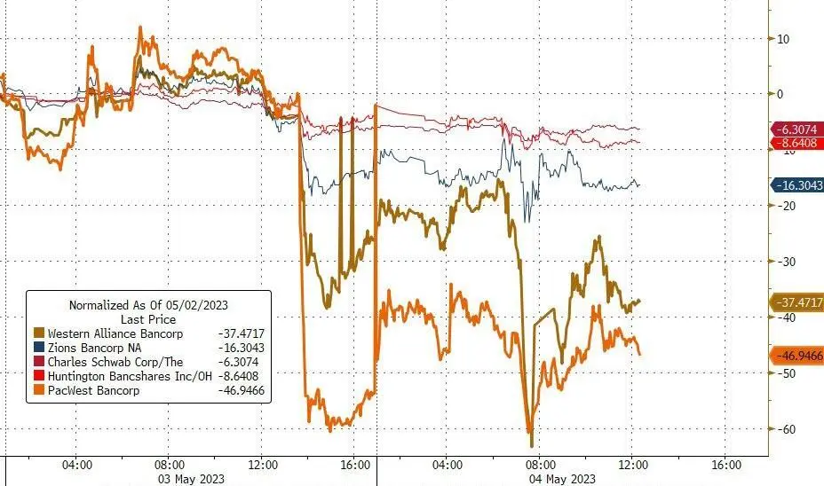 美国地区银行危急升级,成为美股大盘下跌的首恶。 周四加拿大第二大银行多伦多道明银行公布,同第一地平线银行(FHN)的并购协议停止;在西清静洋合众银行(PACW)确认周三传出的思量出售等选择消息后,阿莱恩斯西部银行(WAL)也传出类似出售思量的消息,这些美国地区的银行股价均两位数大跌。 固然阿莱恩斯西部银行今后否认思量出售选择的报道,并将思量统统法律选择反击干系媒体,但跌幅只是有所收窄。高盛的递交羁系方文件披露,美国政府部分在检察该行同硅谷银行的生意业务是否助推3月硅谷银行倒闭,这也打击了风险偏好,高盛成为推动道指下跌的重要成份股之一。 欧央行公布加息后,欧债收益率和欧元汇率团体下行。欧元兑美元汇率回吐周三反弹的涨幅,靠近周二所创的一周多来低位。德国国债收益率革新一个月来低位,对利率预期敏感的两年期德债收益率日内降幅靠近20个基点。欧央行暗示将继续加息,且构筑巨头Skanska一季度红利超预期锐减近八成,欧股齐跌,未能连续周三反弹。 市场对欧央行9月从前利率峰值的预期程度略有降落,从3.75%降至约3.65%,暗示市场定价充实消化了再一次加息的大概性,但对今后的第二次加息还存在分歧。有批评称,欧央行下次6月大概继续加25个基点,至于7月是否还加这个幅度,取决于未来美国银行体系的形势变革。尚有批评以为,欧央行相对而言偏鸽派,语气显得略为更审慎,更关注此前紧缩的影响。 美联储主席鲍威尔周三会后给本年内降息的转向预期泼冷水,称联储官员预计通胀低落必要一些时间,这种情况降落息不适当。但市场人士以为,银行业动荡有助于美联储让经济降温。投资者加码押注联储降息。交换合约表现,周四盘中,投资者预计7月联储就会降息,乃至6月都曾有四分之一的几率降息。对利率敏感的两年期美债收益率盘中降至六周来低谷。 在欧元回落的支持下,美元指数反弹。美国劳工部公布的衡量劳动力资笔聘标——非农企业部分劳动力生产率一季度超预期年化降落2.7%,大概促使美联储将更高的利率保持下去,被视为美元周四反弹的又一动力。 标普道指创五周新低 多只地区银行两位数大跌 AMD盘中拉升 苹果盘后一度涨近3%三大美国股指团体低开。道琼斯工业均匀指数和标普500指数全天保持跌势。早盘革新日低时,标普跌幅略高出1%。道指午盘之初革新日低时跌近477点、跌逾1.4%,标普接克日内低位。纳斯达克综合指数早盘革新日低时跌超0.8%,午盘得益于部分芯片股走高而曾短线转涨。 终极,三大指数一连四日团体收跌。道指收跌286.5点,跌幅0.86%,报33127.74点,创3月30日以来盘中新低。标普收跌0.72%,报4061.22点,迫近4月26日上周三所创的3月30日以来收盘低位。纳指收跌0.49%,报11966.4点,一连两日革新4月26日以来低位。 代价股为主的小盘股指罗素2000收跌1.18%,抹平周三逆市反弹的全部涨幅,跑输大盘,跌至客岁10月以来低位。科技股为重的纳斯达克100指数收跌0.37%,连跌四日,继续革新4月26日以来低位。 标普500各大板块中,周四只有涨逾0.9%的房产和涨逾0.7%的公用奇迹两个收涨。同样跌近1.3%的金融和通讯服务领跌,能源和工业也跌超1%,跌幅垫底的是跌近0.3%的必须斲丧品。 银行股早盘重挫,午盘跌幅有所收窄,仍一连第四日跑输大盘。银行业指标KBW银行指数(BKX)早盘曾跌近6%,收跌3.8%,连跌四日至2020年9月以来低位;地区银行指数KBW Nasdaq Regional Banking Index(KRX)早盘革新日低时跌超7%,收跌3.5%,地区银行股ETF SPDR标普地区银行ETF(KRE) 早盘曾跌超9%,收跌近5.5%,均连跌四日,分别革新2020年11月和2020年10月以来低位。 大银行中,富国银行收跌5%,美国银行跌3.1%,摩根士丹利跌2.5%,高盛收跌2.3%,在道指成份股中跌幅居前,另一道指成份股摩根大通跌1.4%,花旗跌1.7%。资管巨头嘉信理财(SCHW)收跌1.4%。 地区银行中,周三因思量出售消息而盘后腰斩的西清静洋合众银行(PACW)早盘曾跌超60%,收跌50.6%,股价创汗青新低; 周四传出也思量出售的消息后,阿莱恩斯西部银行 (WAL)早盘曾跌超60%,该行否认消息后跌幅曾收窄至40%以内,收跌38.5%,创2013年9月以来新低;同加拿大第二大银行多伦多道明银行停止并购协议后,第一地平线银行(FHN)早盘曾跌超40%,收跌33.2%,创2020年10月以来新低。 Zions Bancorporation (ZION)收跌约12%, Huntington Bancshares Inc(HBAN)和KeyCorp(KEY)跌6.3%, Citizens Financial Group(CFG)跌5.2%。 芯片股势将在总体连涨四日后连跌三日,费城半导体指数和半导体行业ETF SOXX午盘均曾短线转涨,分别收跌约0.5%和0.6%。个股中,在媒体称微软和AMD相助开发AI芯片后,AMD盘中拉升,盘中涨幅曾高出12%,收涨6.1%;一季度EPS红利符合预期、但焦点业务手机芯片贩卖同比降落17%的高通收跌5.5%。 龙头科技股涨跌不一。特斯拉收涨近0.4%,连涨两日,继续脱离上周三所创的1月25日以来低位。FAANMG六大科技股中,Facebook母公司Meta收跌近1.5%,连跌三日之一周低位;周三止步三连跌的谷歌母公司Alphabet收跌近0.7%,开始靠近上周三所创的3月30日以来低位;而奈飞收涨近0.5%,在周二连跌两日至3月22日以来低位后连涨两日;亚马逊收涨逾0.3%,连涨三日,继续脱离在公布一季报后连跌两日所创的4月12日以来低位;停止周三连跌三日至一周低位的微软收涨逾0.3%;苹果收跌约1%,连跌四日,继续革新一周来低位,盘后公布的一季度营收高于预期,盘后灵敏转涨,一度涨近3%。 公布财报的个股中,一季度红利和收入均低
