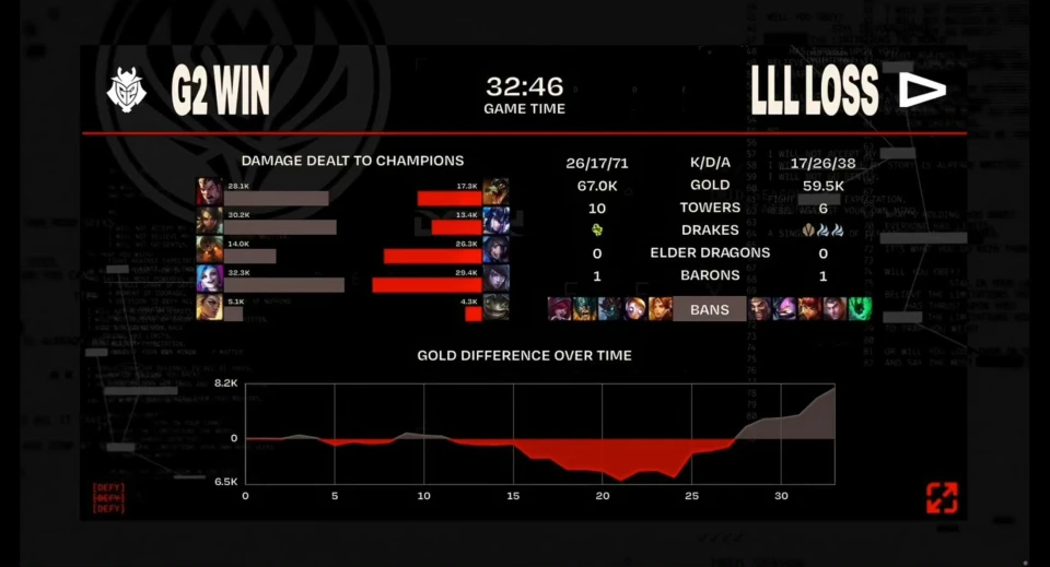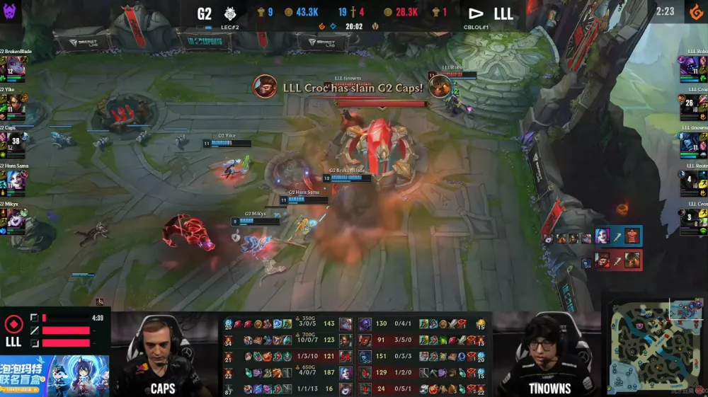 MSI入围赛G2和LLL的BO3,双方大战2局之后,G2乐成以2-0的战绩击败了LLL,拿下了自己MSI的首胜。 第一局G2上单诺手,打野豹女,中单泰坦,下路金克丝加芮尔;LLL上单鳄鱼,打野猪妹,中单狐狸,下路厄斐琉斯加塔姆。4分钟双方中野2V2对拼,caps泰坦被击杀,LLL拿下了一血。13分钟LLL推掉了下路一血塔。前期LLL经济领先2K。中期21分钟LLL光速拿下第一条大龙,之后G2赶来开团击杀LLL两人。24分钟LLL抱团推掉了G2下路高地塔,但是G2果断开团包夹,团灭LLL。27分钟G2在中路击杀LLL上中两人后,拿下第二条大龙,不外LLL则是拿下听牌龙。后期32分钟G2在中路击杀G2下路双人组后,拿下来的第一局的胜利。首局输出最高的是G2的金克丝。 第二局G2上单波比,打野豹女,中单泰坦,下路金克丝加璐璐;LLL上单贾克斯,打野猴子,中单冰女,下路厄斐琉斯加塔姆。2分钟G2野辅入侵野区,击杀了LLL打野猴子,G2拿下了一血。7分钟G2下路对线击杀塔姆。11分钟G2推掉了上路一血塔,随后Brokenblade波比二塔下单杀贾克斯。前期G2经济领先1W。中期19分钟LLL中单冰女闪现开团,但是自己被秒,随后G2越塔击杀LLL三人,终极仅用20分钟,就拿下了第二局的胜利。 那么,对于这场比赛,你们有什么想说的吗?接待在品评区留言探究。 |