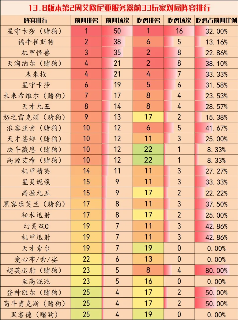 兄弟们好,我是摩昂讲授,每天都会给各人带来云顶与金铲铲的资讯和上分攻略。兄弟们记得点个关注哦! 弈周棋事如约而至,13.8版本第2周云顶阵容强度环境周报来了,下面摩昂就和各人一起来相识下当前版本的对局环境,又有哪些阵容更容易上分。 摩昂重申一下金铲铲的环境与云顶之弈环境差距较大,这是两个游戏,阵容不要对号入座,金铲铲环境可以看摩昂的金铲铲弈周报。 摩昂统计了近来两天艾欧尼亚服务器排名前33名大神们近来的5场排位赛的前4名对局(这次人数多,重要是很多大神玩家在冲云巅),涵盖了44套阵容(比上周多了4套)。在阵容去重后举行整理成一、二、三、四名的情势,各人可在图中看到每套强势阵容的吃分与吃鸡强度。 这周环境与上周相比只能算是小厘革,团体环境上厘革不大,环境依然是赌狗为主,运营阵容相对来说没有赌狗阵容热度高,吃分排行前14名中只有5套阵容是运营体系,其他均是赌狗阵容。 当前环境下星守卡莎依然毒瘤阵容,上周热度较高的福牛崔斯特、高斗贾克斯、将来枪体系与怪兽双C阵容热度均有有所降落,特殊是高斗贾克斯与怪兽双C阵容热度降落非常大。 这周摩昂把星守卡莎分成两套阵容举行统计,一套是追芮尔卡莎三星,一套是不赌卡莎(统计中的星守卡莎),且这套均是9生齿且卡莎2星没有追三星的。 星守卡莎(赌狗)阵容这周吃分场次50场,吃鸡场次16场,吃分与吃鸡排名都是第1名。阵容吃鸡占前四占比例32%。 星守卡莎(不追三星,升9生齿)阵容这周吃分场次19场,吃分排名第6名,吃鸡场次6场,吃鸡场次排名第5名。阵容吃鸡占前四占比例31.58%。 星守卡莎这套阵容这周热度再次攀升,统计中常常出现一局3-4家偕行的时间,玩起来比力卷,但这套阵容7-8名出局比力少,吃分比力稳固,偕行少的时间前二率也比力高,是当前版本的毒瘤阵容。 如今选择不赌卡莎的玩家也比力多,实在后期上限也比力高,各人在偕行多的时间直接攀生齿就好。 福牛崔斯特阵容这周吃分场次38场,吃分排名第二名。吃鸡场次16场,吃鸡排名第6名。阵容吃鸡占前四占比例13.16%。 福牛崔斯特这套阵容这周热度降落较大,虽说吃分场次与上周差不多,但玩家选择率大幅度降落,如今吃分强度不算太高,统计中3-5名的数据比力多,前二名特殊少,想吃鸡是比力难的。当前环境不是特殊保举这套阵容,但很多阵容都克转型这套,在最优阵容不胡的时间就可思量转型这套。 机甲怪兽阵容这周吃分场次35场,吃分排名第3名,吃鸡场次8场,吃鸡排名第2名。阵容吃鸡占前四占比例22.86%。 机甲怪兽这周的热度也略有降落。如今选择毒瘤卡莎玩家特殊多,纯后期阵容算上比力难成型的,但机甲怪兽的强度仍旧不错,只要前排抗的住,索尔能多次开释技能强度依然是版本顶级,大成后吃鸡率较高。但摩昂不发起各人强玩这套阵容,索尔2星慢很容易后4出局。 将来枪这周吃分场次21场,吃鸡场次7场,吃分与吃鸡排名都是第4名。阵容吃鸡占前四占比例33.33%。 将来希维尔这周吃分场次17场,吃分排名第7名。吃鸡场次4场,吃鸡排名第8名。阵容吃鸡占前四占比例23.53%。 将来体系这周仍旧强势,热度上与上周厘革不大,根本一局都是1-2名玩家选择,2套阵容吃分强度均比力高,但将来枪在有将来转职的时间,吃鸡率会大幅度攀升;而将来希维尔阵容在统计中有加班费的对局均吃分且只有4局没有升级9生齿,强度也是比力高。 天淘纳尔这周吃分场次31场,吃分排名第4名。吃鸡场次8场,吃鸡排名第2名。阵容吃鸡占前四占比例38.10%。 天淘九五这周吃分场次14场,吃鸡场次4场,吃分与吃分排名都是第8名。阵容吃鸡占前四占比例28.57%。 天才体系这周热度略有降落,但强度仍旧,吃分与吃鸡均算比力稳固。但天才纳尔阵容略有厘革,这周选择娑娜副C的玩家大幅度增长,阵容吃分会更稳固一些,但选择娑娜主C的吃分比力稳,但吃鸡率不算太高。 这周其他低费赌狗阵容热度,也增幅较大,重要是怒之雷克顿阵容,这周热度大幅度增长。有3场吃分,2场次吃鸡。 浪客亚索阵容这周热度降落较大,统计中根本都是独家,吃分与吃鸡比力稳固,可以说是当前比力冷门的偷分阵容。 同样高源艾希这周热度增幅也比力大,这套阵容吃鸡较难,但吃分比力稳固。 由于时间关系,咱们周报就先讨论到这,各人怎样对待咱们的周报呢?兄弟们有哪些意见可在品评区留言!假如以为文章还不错,别忘了动动小手支持一下摩昂哦,帮摩昂分享一波!~ |