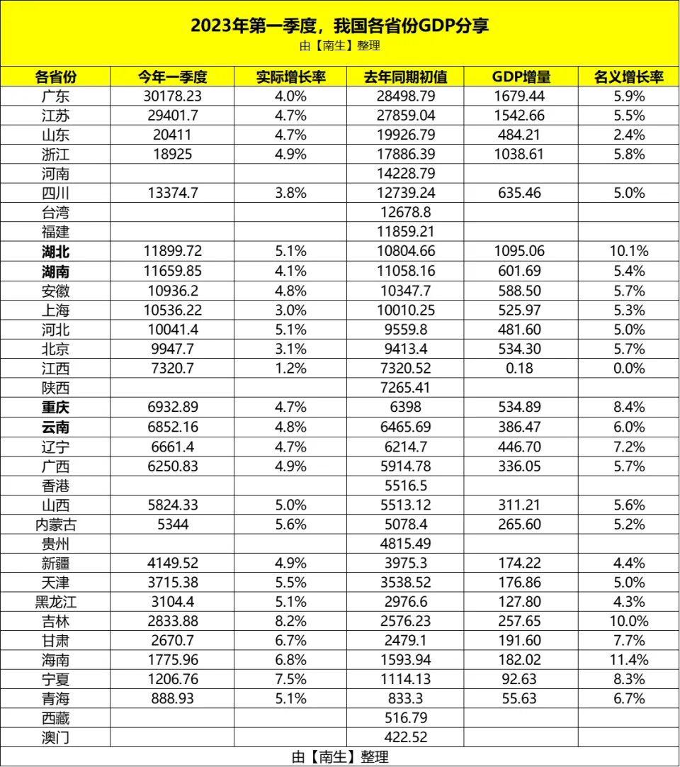 开端统计效果体现:我国江苏省在2023年第一季度完成的地区生产总值(GDP)为29401.7亿元人民币,与上年同期相比,剔除物价变动因素,取得了4.7%的实际增长。 第一季度GDP比力,广东先胜一筹 江苏省一季度经济实际增长率符合预期,但按市场代价盘算的名义GDP并未像部分网友猜测的那样“靠近或到达3万亿元”。GDP新增数目未能像之前几个季度那样,实现对广东省的逾越。 换言之,广东省经济名义增长率,GDP新增数目再度走在了江苏省之前——广东省经济名义增长率为5.9%,比江苏高了0.4个百分点;广东GDP增量靠近1680亿元,比江苏省高了137亿元左右。 分财产来看,广东省第一财产完成的增长值为1039.06亿元,江苏省为634.4亿元;广东省第三财产为17997.83亿元,江苏为16197.1亿元——在农林牧渔和服务业范畴,广东占据上风。 但在以制造业为焦点的第二财产范畴,却是江苏省占据上风——2023年第一季度,江苏省第二财产完成的增长值提拔至12570.3亿元,广东省为11141.35亿元,且增幅也是江苏省更猛。 特殊是在电气呆板和东西制造,汽车制造,专用装备制造,光伏装备及元器件制造,电力、热力、燃气及水生产,采矿业等范畴,江苏省都取得了较好效果。 江苏省制造业好像更偏重于中心产物,在半导体制造、发电装备、机床、互换发电机、钢铁、船舶、机车等范畴具备较强竞争力,而广东省制造业更方向消耗类和电子类产物,中高端石化产物也占据上风。 山东省GDP增量,被浙江省逾越 山东省GDP新增数目在2022年实现了对浙江省的逾越,但在本年第一季度却又酿成了浙江省更高。此中,浙江省经济实际上涨4.9%,完成的地区生产总值为18925亿元,增量凌驾1000亿。 山东省在2023年第一季度完成的GDP约为20411亿元,增幅不到500亿元,同比实际上涨4.7%,名义增长2.4%。名义增幅,低于实际增幅的另有河北、江西、内蒙古、新疆、天津、黑龙江等。 此中,河北省实现的地区生产总值为10041.4亿元,同比实际增长5.1%,名义上涨5%左右;江西省一季度完成的地区生产总值为7320.7亿元,实际增长1.2%,名义增速为零。 一季度,新疆完成的地区生产总值为4149.52亿元,按稳固代价盘算,同比实际增长4.9%,名义上涨4.4%;黑龙江一季度地区生产总值为3104.4亿元,实际上涨5.1%,名义增长4.3%。 南生故乡安徽省,一季度GDP上涨4.8% 安徽省2023年第一季度经济取得了4.8%的实质性增长,完成的地区生产总值扩大至10936.2亿元,与上年同期的初值相比,新增了588.5亿元,名义增长率为5.7%。 无论是看实际增幅,照旧观察名义增幅,安徽省经济发展力度在华东地区均体现优秀。特殊是在优惠政策、资源和科技创新助力下,安徽省高新财产上风渐显,成为长三角一体化的告急一极。 但安徽省经济发展地皮依赖度较高,并在某种程度上较为依赖固定资产投资和中心转移付出。别的,安徽省的服务业,农村地区发展也依然滞后,经济结构相对失衡。本文由南生撰写,无授权请勿转载、抄袭! |