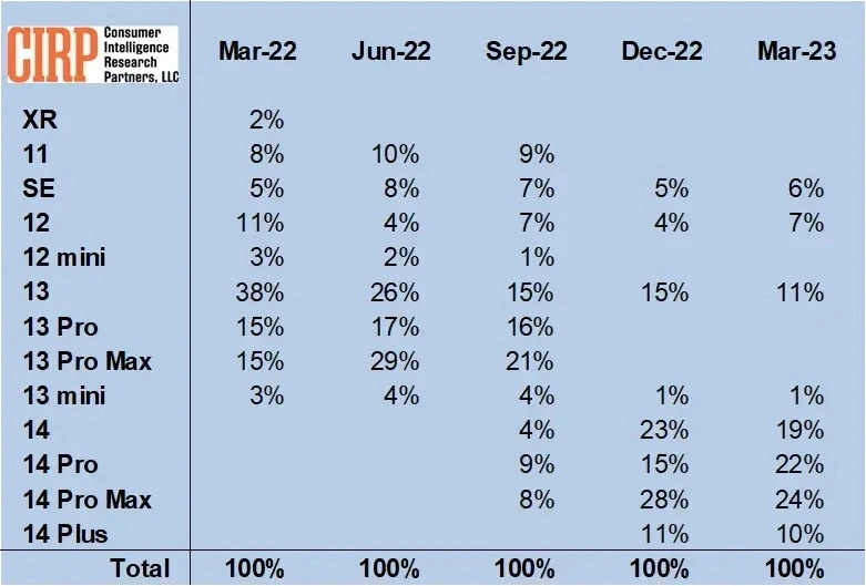 IT之家 4 月 27 日消息,根据市场观察机构 CIRP 公布的最新研究陈诉,2023 年第 1 季度美国市场 iPhone 14 四款机型在全部 iPhone 中的占比到达了 75%。 值得留意的是,1 月至 3 月是苹果 iPhone 14 系列上市的第二个完备季度。CIRP 表现:“这些数字对于相识 Apple 的业绩非常告急,我们每个季度都会重新审视这些数字”。 IT之家附陈诉重要内容如下: iPhone 14 Pro 和 Pro Max 最脱销,分别占据了 22% 和 24% 的份额。iPhone 14 位居第三,占总数的 19%。 iPhone 14 Pro 机型从 2022 年第 4 季度的 15% 跃升至第 1 季度的 22%,比更实惠的 iPhone 14 更受欢迎。 只管 iPhone 14 Pro Max 仍然是全部机型中销量最高的,但份额相比力 2022 年第 4 季度(28%)降落了 4 个百分点。 CIRP 夸大,iPhone 14 系列的四分之三份额比一年前 iPhone 13 系列的 71% 有所增长。 |
