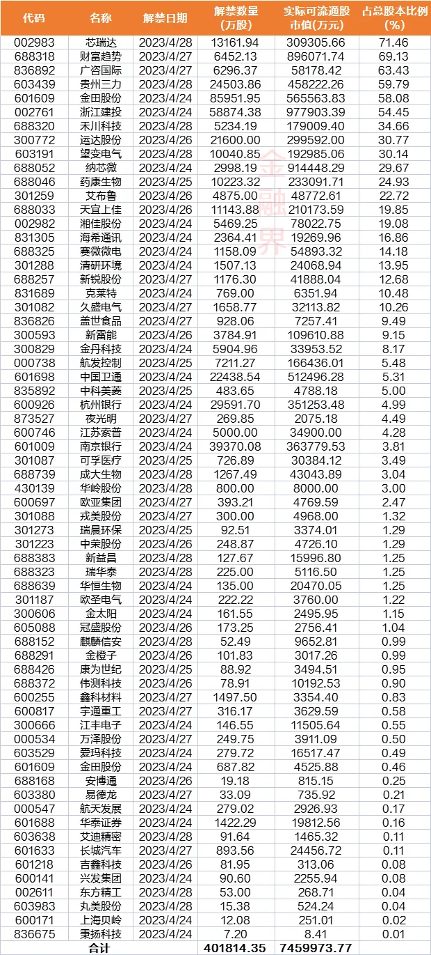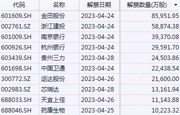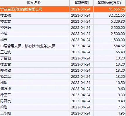 【生意业务必知-财经日历】 新股申购 下周(4月24日-4月28日)有5只新股发行,此中沪指主板1只,创业板1只,科创板2只,北交所1只。 详细安排如下,周二1只:巨能股份(北交所);周三2只:中芯集成(科创板)、万丰股份;周四2只:车友科技(科创板)、曼恩斯特(创业板)。 根据制止现在的安排,下周暂有4只上市新股。周一上市的美利信(301307)、晶升股份(688478)、中裕科技(871694),周二迎来民士达(833394)上市生意业务。 晶升股份是一家碳化硅长晶装备厂商,美利信重要从事通讯范畴和汽车范畴铝合金精密压铸件的研发、生产和贩卖。 限售解禁 下周(4月24日-4月28日),沪深京三市有65家公司涉及限售股解禁;合计解禁量约40.18亿股,按最新收盘价盘算,对应解禁市值约为746亿元;前一周分别为73.76亿股、1816.4亿元。 将来附近解禁环境 下周解禁数量最多的是金田股份(601609),公司本次上市流通的限售股为公司初次公开发行限售股,共涉及7名股东,上述股东持有的限售股共计8.60亿股,占公司总股本的58.08%。本次解禁股东包罗楼国强、楼国君、楼晶晶等人,明细如下: 别的,浙江建投5.89亿股限售股将于4月24日起上市流通,占总股本的54.45%,按最新收盘价盘算,解禁市值为97.79亿元,此次解禁股份范例为定向增发机构配售股份,本次解禁股东包罗: 其他解禁数量较大的公斯室庀京银行(3.94亿股)、杭州银行(2.96亿股)、贵州三力(2.45亿股)、中国卫通(2.24亿股)、运达股份(2.16亿股)等。 从实际解禁市值规模来看,浙江建投居首,纳芯微、产业趋势紧随厥后分别位列第二、第三。 纳芯微将于2023年4月24日解禁2998.19万股,对应市值约91.44亿元,占总股本比例29.67%,解禁股范例是首发原股东限售股份,首发战略配售股份,本次解禁股东包罗: 产业趋势6452.13万股限售股将于4月27日起上市流通,占总股本的69.13%,解禁市值为89.6亿元,此次解禁股份范例为首发原股东限售股份,本次解禁股东包罗: 别的,金田股份、中国卫通、贵州三力、南京银行、杭州银行、芯瑞达、药康生物等解禁市值靠前。 解禁量占总股本比例方面,23股解禁比例超10%。安宁股份、向阳科技比例凌驾75%;华盛昌、越剑智能比例也凌驾70%,锦和商管、七丰精工比例凌驾60%,中航电子比例靠近58%,锐新科技、英集芯、沪硅产业、杰创智能等比例超40%。 |