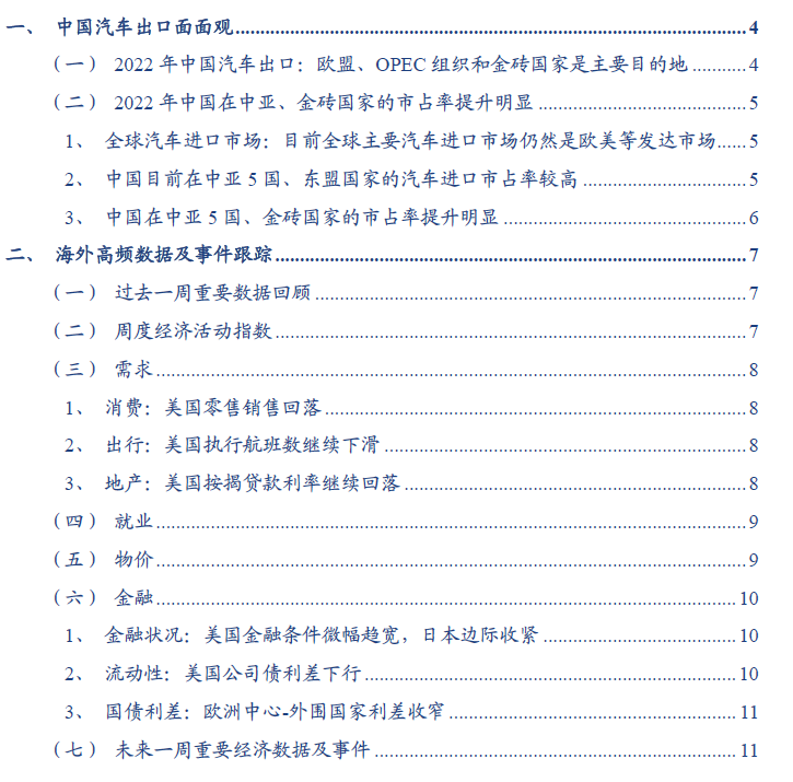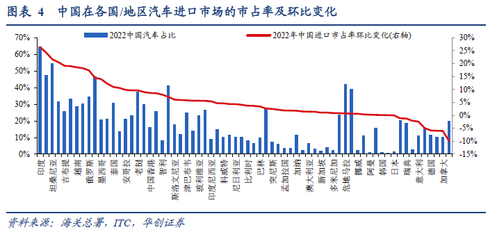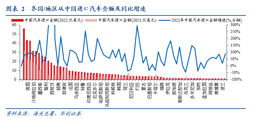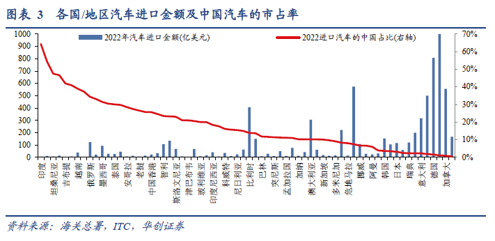 焦点观点 欧盟、OPEC构造和金砖国家是2022年中国汽车出口的告急目的地。欧盟不但是中国最告急的汽车出口目的地,也是2022年中国汽车出口增长最为迅猛的地域之一。 如今举世告急汽车入口市场仍旧是西欧等发达市场,新兴市场中智利、印度尼西亚兼具市场规模与发展潜力。中国如今在中亚、东友邦家的汽车入口市占率较高,且中国在中亚、金砖国家的市占率提拔显着。 陈诉择要 2022年中国汽车出口:欧盟、OPEC构造和金砖国家是告急目的地。 按照海关总署公布的数据,2022年中国汽车出口金额为624.6亿美元,同比增长70.6%。 从地域或构造分布看,美国、G7国家、欧盟、日本、东盟、RCEP国家以及金砖国家的中国汽车入口金额分别为26、107、133、4、58、104和64亿美元,2022年分别增长45%、62%、100%、63%、48%、62%和86%。 欧盟不但是中国最告急的汽车出口目的地,也是2022年中国汽车出口增长最为迅猛的地域之一。 按照绝对金额统计,比利时、英国、俄罗斯等国家从中国入口汽车金额最多。 2022年从中国入口汽车金额最高的10个国家依次是比利时、英国、俄罗斯、沙特、澳大利亚、墨西哥、美国、智利、阿联酋和西班牙,汽车入口金额分别为55.9、43.2、42.4、31.5、31.1、29.1、25.9、24.8、20.6和18.5亿美元。 按照同比增速统计,西班牙、阿联酋、约旦等国家从中国入口汽车金额增速最高。 2022年从中国入口汽车绝对金额凌驾1亿美元的69个国家或地域中,从中国入口汽车金额同比增速最高的前10名依次是西班牙、阿联酋、约旦、泰国、以色列、意大利、斯洛文尼亚、墨西哥、安哥拉和多米尼加,汽车入口金额同比增速分别为3358%、339%、294%、255%、214%、202%、201%、188%、185%和149%。 2022年中国在中亚、金砖国家的市占率提拔显着。 如今举世告急汽车入口市场仍旧是西欧等发达市场。汽车入口金额增速高企的告急是新兴市场。除斯洛文尼亚、英国之外,汽车入口金额增速高企的告急是新兴市场和发展中经济体。团结汽车入口金额增长数值以及增速,可以发现新兴市场中智利、印度尼西亚兼具市场规模与发展潜力。 中国如今在中亚、东友邦家的汽车入口市占率较高。分地区或构造看,2022年从中国入口的汽车在全部汽车入口中的金额占比由高到低依次是中亚五国、东盟、金砖国家、OPEC成员国、RCEP国家、欧盟和G7国家,比例分别为37%、26%、24%、16%、12%、4%和2%。 2022年中国在举世多数国家或地域的入口汽车市场占据率提拔。从入口市占率环比厘革看,68个从中国入口的汽车金额凌驾1亿美元的国家或地域中,2022年有58个国家或地域的中国市占率上升,仅有10个国家或地域的中国市占率降落。别的,中国在中亚、金砖国家的市占率提拔显着。 2022年中国在入口汽车市场占据率环比上升由高到低依次是中亚5国、金砖国家、OPEC成员国、东盟、RCEP国家、欧盟和G7团体,比例环比分别上升17、9、8、5、2和1个百分点。 风险提示:汽车出口统计存在遗漏、部门外洋汽车入口数据发布相对滞后。 陈诉目次 陈诉正文 一、中国汽车出口面面观 随着中国一季度汽车出口破百万辆,逾越日本成为举世第一,拆解汽车出口的地域分布以及市占率厘革有助于我们更深入相识中国外贸出口的远景以及必要关注的匿伏市场。 (一)2022年中国汽车出口:欧盟、OPEC构造和金砖国家是告急目的地 根据《海关统计月报告急商品目次》,汽车(包罗底盘)告急包罗87012、8701919、8701929、8701939、8701949、8701959、8702、87032-87039、8704-8706编码的商品。此中,电动载人汽车告急包罗HS87022-87024、HS87034-87038编码的商品。[1]为了简化统计,我们接纳8701-8706编码的商品作为统计汽车收支口金额的口径。 按照海关总署公布的数据,2022年中国汽车出口金额为624.6亿美元,同比增长70.6%。从地域或构造分布看,美国、G7国家、欧盟、日本、东盟、RCEP国家以及金砖国家的中国汽车入口金额分别为26、107、133、4、58、104和64亿美元,2022年分别增长45%、62%、100%、63%、48%、62%和86%。[2]欧盟不但是中国最告急的汽车出口目的地,也是2022年中国汽车出口增长最为迅猛的地域之一。 按照绝对金额统计,比利时、英国、俄罗斯等国家从中国入口汽车金额最多。2022年从中国入口汽车绝对金额凌驾1亿美元的有69个国家或地域,低于1亿美元的有102个国家或地域。2022年从中国入口汽车金额最高的10个国家依次是比利时、英国、俄罗斯、沙特、澳大利亚、墨西哥、美国、智利、阿联酋和西班牙,汽车入口金额分别为55.9、43.2、42.4、31.5、31.1、29.1、25.9、24.8、20.6和18.5亿美元。 按照同比增速统计,西班牙、阿联酋、约旦等国家从中国入口汽车金额增速最高。2022年从中国入口汽车金额增长的有127个国家或地域,从中国入口汽车金额镌汰的有43个国家或地域。2022年从中国入口汽车绝对金额凌驾1亿美元的69个国家或地域中,从中国入口汽车金额同比增速最高的前10名依次是西班牙、阿联酋、约旦、泰国、以色列、意大利、斯洛文尼亚、墨西哥、安哥拉和多米尼加,汽车入口金额同比增速分别为3358%、339%、294%、255%、214%、202%、201%、188%、185%和149%。 (二)2022年中国在中亚、金砖国家的市占率提拔显着 为了对比中国汽车出口的市占率以及匿伏空间,我们进一步统计了举世各国的汽车入口金额。根据ITC(International Trade Centre)的数据,2022年除中国外举世各国共入口汽车金额