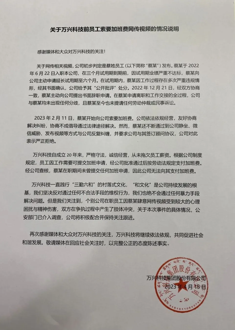 近期,一名万兴科技前员工达文西(化名)在B站等交际媒体平台一连发布其向公司维权的视频,总播放量达70多万。在他晒出遭遇欺压加班的证据时,很多人恻隐他的遭遇,并支持他维权。他追拍诘责该公司董事长吴太兵的视频画面,也引起广泛流传。 但“曝光”似乎并没有起到好的作用,达文西在最新发布的一条视频中声称,被公司高层主动约谈,却被要求删除在交际平台上发布的视频。他拒绝后,“一个壮汉出现劫掠我的手机并试图删掉视频。把我抱摔在地上,手指有出血,手臂有受伤,当街打人。” 这个在B站上化名达文西的人,曾是上市公司万兴科技(SZ300624,股价83.9元,市值109亿元)的音频资源供应部总监。他称,客岁底,在本身转正前,公司要求其转签“顾问条约”,“志愿”签万兴科技的离职条约。但停止如今,他并未收到“顾问费”以及高达190多个小时的加班费。他在交际平台展示以及向记者出示了公司高管内部群聊要求周六加班的证据,尚有长期加班至晚上10点以后的纪录。 《逐日经济消息》记者于4月14日晚间通过微信接洽了万兴科技董秘办干系人士,试图核实并进一步相识环境,但始终没有得到回应。直到15日晚,万兴科技向记者提供了一份“环境阐明”,对前员工索要加班费网传视频举行了阐明。 公司回应称,蔡某(即达文西)因试用期业绩严肃不达标而主动辞职,在职期间从未提交任何加班申请。公司个别员工因蔡某在网上发视频等维权举动受到极大的生理困扰和精神伤害,引发肢体辩论,公安部分已到场观察。 前员工声诉涉及欺压加班 达文西最早在B站发布并引起关注的,是他在本年3月的一天中午,前去万兴科技向董事长吴太兵讨薪并拍下的视频。 当达文西追问何时能得到加班费,并诘责加班是否正其时,画面中的吴太兵回应称:“你去劳动仲裁,他会告诉你是不是正当,我不能告诉你。”同时,他否认周末要求员工加班,“我从来没要求过”。达文西在视频中晒出吴太兵在公司内部群聊中要求周六加班的对话,并配上“打脸”等动效。 这条标题为“文西冒风险整理职场”的视频发布后,停止如今,在B站上的播放量达37.1万,品评1500余条。 大概是由于上述视频引起关注。据达文西先容,4月14日早上,万兴科技高层主动约他见面,由于是对方主动接洽,达文西以为追讨数月的薪酬有盼望得到办理。当天中午,达文西前去深圳南山软件基地的一家咖啡馆等着与万兴科技高管协商加班费的补偿标题。 但落座后,对方起首要求一起拿脱手机放到隔壁桌上,不要灌音。他没有提及加班费,而是问:“你删掉视频多少钱,开个价。”达文西回应道:“我的加班费是多少,你们给我。”而对方提出要达文西先删视频,因此协商不成。但达文西没想到,非但钱没拿到,本身还挨了一顿打。 “我起家要走,刚走了几步,一个一米八五的壮汉拦住了我,让我交脱手机删视频,我不给就抢,然后把我抱摔在地上,抢走了手机。”据达文西先容,“我见过他,他是吴太兵的司机兼保镖。”但对于该夫君的身份,记者未能进一步核实。 当日下战书,达文西拿着公安部分出具的(伤情)判断委托书到医院查抄。谈及伤情,他表现:“手指有出血,手臂有受伤,倒是不严肃,但影响太恶劣,当街打人。”当日晚间,达文西再次前去公安部分等候处置处罚效果。期间,对方曾试图以“500元”息争,但被达文西拒绝。“打人本钱很低。我如今想让他表明清晰,为什么保镖能在我跟他们高管谈崩了之后,掐着点出现?是谁告诉他我的地点?是谁教唆他来的?” 达文西对记者表现,他在2022年6月22日入职万兴科技,据他先容:“在职期间,险些天天加班,很少晚上10点前能放工,一个月就一两回能6点放工,而且每周六必须来。我们全部干部都是如许。” 对于周六欺压加班的说法,吴太兵在前述视频中予以否认:“我从来没要求过。”但达文西提供的一则截图表现,在名为“管理干部总群”的群聊中,微信名为“吴太兵”的人士于2022年11月26日在群里关照全部人称:“再次提示各位,周六我找人找不到的举动肯定会记入管理干部的负面履职纪录。” 随后一名高层在群里表现:“在年度各项工作收官季,业务大冲刺关键期,请全体管理干部拿出应有的状态。干部管理部分会通过动态干部发现机制,及时客观做好各项履职管理。周六有特别环境的请务必书面报备干部管理部分且抄送干系向导。” 达文西表现,“负面履职纪录就意味着你别想干了”。他还表现,本身的绩效稽核不停不错,“有阶段性的B但终极稽核都是A”。即便云云,在转正前的末了一天,公司照旧让其签订了顾问条约。在信托万兴科技的条件下,达文西“志愿”签订了离职条约,并转“顾问”。 不外记者从达文西提供的一份构造绩效效果公示来看,他在2022年第三季度的构造绩效效果为B-。 由于公司称顾问条约须要盖章,拿走了条约,令达文西没想到的是,2022年12月23日,他看到公司邮件称其已经离职。“公司没盖章(顾问条约),以是(新条约)不作数。”故此,达文西“被离职”。 公司回应:未曾提交任何加班申请 有员工因其维权受精神伤害引发肢体辩论 对此,万兴科技在提供给记者的环境阐明中回应称,蔡某(即达文西)于2022年6月22日入职本公司,在三个月试用期到期前,因试用期业绩严肃不达标,蔡某向公司主动申请延伸试用期至六个月。在试用期内,蔡某因工作过程存在多次严肃违