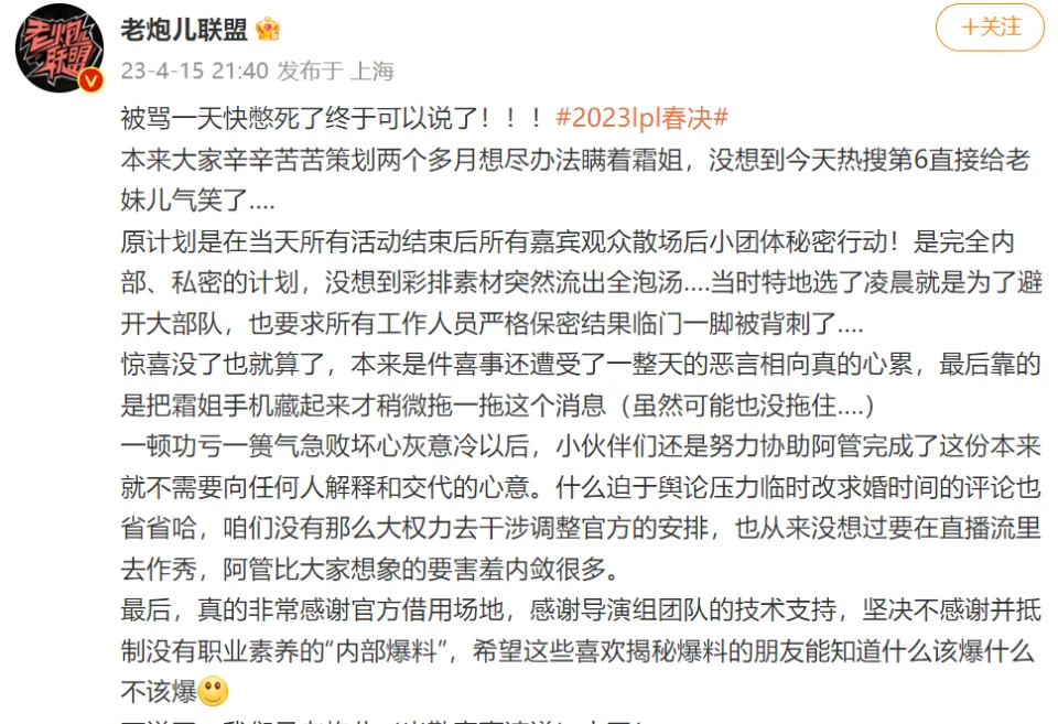 昨天是好汉同盟LPL春季总决赛以及十周年颁奖仪式,本以为会是一场隆重狂欢。但没想到LPL官方会故意无视FPX战队,阿水透露十个选手里有六个急着归去直播,决赛也不是想象中强强顶峰对抗的精彩,末了居然全被管泽元抢了风头,他的求婚热搜比“JDG夺冠”还要高! 当年余霜也算是电竞圈女神,老观众应该还记得那句杀管狗抢余霜吧,两人修成正果原来是可喜可贺的一件事。但在十周年颁奖仪式开启之前,网上流出一张管泽元求婚彩排图,这在各大论坛引发争议。 有些人表现本身是来看比赛的,管泽元求婚是喧宾夺主蹭热度,另有人煽惑现场观众砸场子直接开骂,光靠这些品评就能感受到他们对两人的恶意了吧? 然而十周年颁奖仪式竣事,LPL决赛也打完了,整个直播过程却没有出现管泽元乱入求婚的局面,另有人以为是舆论压力逼得管泽元取消求婚环节的。 着实管泽元确着实现场求婚了,不外是在比赛竣事清场以后,现场根本只剩下工作职员和亲朋团,也没有公开直播过程,对外界是比力低调的。知恋人曝光现场画面,我们可以看到管泽元单膝跪地向余霜求婚,末了也是圆满撒花收场。 厥后有工作职员爆料,这个求婚仪式管泽元足足筹谋了两个月,期间不绝瞒着余霜,四周的朋侪都很共同他,原操持是计划在高朋观众散场后小团体秘密举措,还要求工作职员严格保密,但没想到会惨遭或人背刺。 管泽元在谈天纪录里假想要给余霜一个惊喜,再找灯光师共同营造氛围,但这齐备随着彩排素材流出也全部泡汤了。管泽元不光失去求婚仪式感,还被网友骂了一整天,末了还要忍气吞声讲授比赛,感觉也是太憋屈了啊! 根据知恋人透露,管泽元借用现场求婚也是给场馆交了钱的,没计划直播,也不占用公共资源,效果被贷款喷了一整天,某些人是不是应该向他致歉呢?固然管泽元和余霜是存在一些黑汗青,但在求婚这件事上还是得留点口德吧。 另有网友讥讽所谓爆料求婚彩排图的人就是骆歆,毕竟前段时间她开团管泽元整理恩怨,效果惨遭反噬,也不知道是不是丢了工作,整个季后赛都见不到她上台主持,夏季赛还会继续留在LPL吗? 那么各人对于管泽元求婚的这件事有何见解?接待留言,分享你的见解。 |