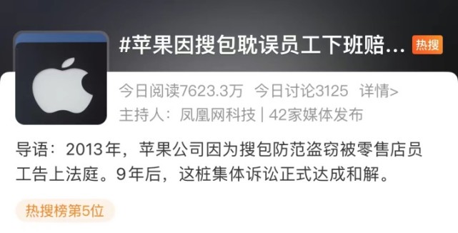 本日,苹果又上热搜了,#苹果因搜包延伸员工放工补偿2亿#冲上热搜第五。 2013年,苹果公司由于搜包防范偷窃被零售店员工告上法庭。9年后,这桩团体诉讼正式告竣息争。 根据协议,苹果将不得不向加州数千名小时工付出3050万美元(约合2亿元人民币)补偿金。原告称,苹果没有补偿门店员工在放工时被查抄手提包和iPhone而付出的时间。对于一些员工来说,在打卡放工后通常要等上几分钟,乃至更长时间,相当于每年约莫1500美元。 这桩团体诉讼涵盖了14,683名加州员工,匀称每位员工得到1328美元补偿金。在被提告状讼后,苹果不再对员工放工前举行搜包查抄。 对此,网友体现愤怒:人与人之间的信托呢? 一隻蒙:违反他们的劳动法之外,更告急的岂非不是侵占了隐私权吗 玉龙飞起:苹果公司搜包?人与人之间的信托呢? 煙雨秦淮夢:用人不疑,疑人不消。 消息多看点: 本日,苹果还更新了iOS16 Beta6,此中iPhone低电量时可关闭电池百分比。 据报道,使用电池低功耗模式时,如今可以关闭状态栏中表现的百分比指示器,这在之前的Beta测试版中无法做到。 橙柿互动记者 高欣奕 综合报道 |