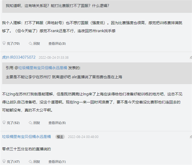 前导:EDG和TES打得有来有回,半斤八两,本以为LNG和JDG也会云云,谁知他们被三比零碾压,输得丢脸。幸好阿乐心态未受影响,角逐竣事直接开播。他特意玩梗369自嘲一把,将直播标题改成“一个赛季练个纳尔那么难吗?” 直播期间阿乐有“嘴硬”的时间,好比说:“没办法对线没打好,要是我们对线稳住恣意赢的”、“下一次我们会赢JDG,对线打得太急了,很多波不应上的,特殊是我”、“要先过EDG这关,我感觉EDG比JDG还猛”。阿乐还吐槽369的“战术”:他赛前搞我心态,说本身研究了一晚上船长打剑姬,怎么也打不赢。求我动手轻一点,万万不要选剑姬,结果他角逐把把ban。 LNG输角逐的来由来了:暂时住处7天无法rank 固然,阿乐也有“服软”的时间,他认可本身打得不好:对线有点上头尤其是我,有很多波不应“死”的,我打得跟训练赛一样。没睡好,早上七点睡下战书一点起,每次赛前都睡不好。打shy哥前一晚还做梦了,本身被压到履历都拿不了。阿乐认可JDG预备更富足:输给他们可以继承,对面拿出来的东西比我们多太多了。 阿乐还夸奖了EDG上单圣枪哥:说真话,主播的纳尔最垃圾,让芙兰朵玩就不是如许,认可369的气力:怎么被369打成如许?人家但是一阵。我渴望计划师能再把纳尔削频频,让他出不了场像格温一样。 阿乐开顽笑流露本身的操持:假如这场赢了采访的是我,我连说什么都想好了。接下来我们会一场不输进入天下赛。惋惜LNG输了来由让人无奈,主播诉苦了同盟的安排,原来他们在暂时住处7天,一次rank也没打过。 阿乐诉苦同盟安排:为迎战EDG不得不连夜赶回基地 选手说:我们回苏州了,这一周一把排位都没打,打完训练赛十一点多回旅店。这次角逐打完,发现排位真的很紧张。LNG的主场在苏州,但季后赛不在这里举行。同盟要求LNG战队来现场参赛,但他们的住处装备不佳,打不了rank。 这段时间LNG只打训练赛,没打排位。对上JDG他们用尽满身解数,照旧打不外预备充实的对手。他们以为排位很紧张,输了角逐连夜回苏州主场rank。接下来要打EDG,LNG必须要做好预备了。 总结 LNG没法打排位缘故原由很简单:起首,同盟没给他们安排住处,LNG找的落脚点装备不可,没法打韩服。打国服固然可以,但LNG角逐时间告急,打国服反而会影响选手的状态。 其次,同盟的时间安排太告急了,LNG是从下往上一起赢过来的,这段时间他们隔一天打一场角逐,天天都是十一点归去苏息,中央的一天要研究对手,打训练赛,根本没时间打排位。 |
