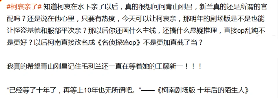 哈喽,各人好,我是木子。 《名侦察柯南》剧场版《黑铁的鱼影 》现在已经上映了,然而在这次《名侦察柯南》剧场版上映之后却遭到了不少网友的吐槽,至于这是为什么呢?紧张就是由于在这部剧场版内里官方居然在磕柯南和灰原哀,而且还出现了柯南和灰原哀接吻的剧情,这导致不少网友绷不住了,那么接下来就跟着木子一起来看看吧。 柯哀亲了再上热搜,人工呼吸变成了接吻在前段时间“柯哀亲了”就上了一次热搜,而且直接是登上了热搜榜首,成为了当下炙手可热的话题之一,现在“柯哀亲了”再次登上了热搜,而且同样是登上了热搜榜首。这次“柯哀亲了”上热搜是由于《名侦察柯南》剧场版《黑铁的鱼影 》的上映,而且在这部剧场版内里还出现了柯南和灰原哀接吻的剧情。 根据上映的《名侦察柯南》剧场版《黑铁的鱼影 》内容来看,柯南和灰原哀在这部剧场版内里亲了,而且不是人工呼吸,是接吻。之前“柯哀亲了”上热搜是由于灰原哀为了救溺水的柯南举行了人工呼吸,但是现在却是将这个人工呼吸改成了光明正大的接吻,这个活动也是再次引起了不少网友剧烈的讨论。 不外灰原哀把吻还给小兰的这段剧情并没有改动,在《名侦察柯南》剧场版《黑铁的鱼影 》内里灰原哀末了将这个吻还给了小兰,这也宣告了灰原哀的离场。固然说如许的了局看起来还算不错,但是由于柯哀亲了这件事故还是引起了不少网友的讨论,而且对于新兰党来说这次的剧场版更是难以继承。 却遭到网友群嘲在这次《名侦察柯南》剧场版《黑铁的鱼影 》播出之后,这部剧场版遭到了网友的吐槽,紧张就是由于柯哀亲了这段剧情的题目。在不少网友看来这段剧情的存在并不公道,尤其是对于一些新兰党来说更是生气不已,明显本身磕了十多年的新兰CP,结果到头来在这个剧场版内里却是柯哀党的胜利。 以致另有一些网友吐槽官方干脆将名字改成《柯南与灰原哀》,毕竟灰原哀在这部剧场版内里的戏份和紧张性以致已经盖过了本该是女主的小兰。而且如果之前是由于人工呼吸接吻还可以说得已往,但是现在却是改成了直接接吻的设定,这让其他人以后怎么对待柯南和小兰,柯南的人设也是彻底崩了。 在这段剧情出现之后,不少网友纷纷吐槽《名侦察柯南》作者青山刚昌,以致另有不少网友公布退坑,毕竟本身磕了十多年的CP,到头来却成了这个样子。而且这次柯哀亲了不光严峻伤害了新兰党,更是导致柯南和灰原哀的人设也发生了崩塌,在党争这么剧烈的情况之下,如许的剧情确实有些不理智了。 各位小搭档们你们怎么对待柯哀亲了的事故呢?你们以为这段剧情真的好吗?欢迎各人一起来讨论。 我是木子,一个喜欢动漫的二次元宅,关注木子相识更多动漫资讯。【文/木子】 |