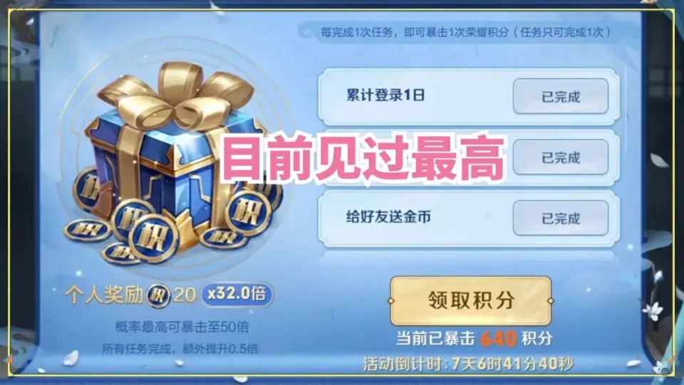 各人好,这里是阿呆的峡谷日志,将会给你带来王者光彩最新的爆料内容。 王者光彩新赛季延期已经成为究竟,如今官方并没有具体透露到底是由于什么缘故起因而延期,只知道是更新的过程中遇到了什么拦阻,以是本次新赛季才会得到延期。 这次延期官方给各人补发了4种嘉奖,这一次终于没有钻石和铭文了,不外补发嘉奖也延期了一段时间才给到各人,如今登岸游戏已经可以领取了。 除此之外,官方还静静上架了一个专属活动,也就是积分暴暴暴活动,信赖许多玩家对这个活动都另有印象。 我记得这个活动确实好长时间没有上线了,理论上来说最高可以得到1000点光彩积分,就是不知道各人有没有这个运气了。 好了,废话不多说,一起来聊一聊王者光彩的热门内容。 一、补偿嘉奖已经发放 由于新赛季延期更新,以是官方给我们补发了嘉奖,如今登录游戏根本上就可以领取了。 这次的嘉奖没有钻石,也没有铭文碎片,和从前确实差别,在之前的补偿中根本上就是钻石和铭文碎片,另有一些没什么用的道具。 不外这次的嘉奖比力丰富一点,分别给了三个好汉碎片和三个皮肤碎片,同时另有一张排位掩护卡和排位加星卡。 相比之下这些嘉奖确实比之前好一点,对于那些须要上分的玩家来说,排位掩护卡也是比力有用的,加星卡也能额外得到一颗星星,反正我以为比50个钻石要好许多。 这次新赛季延期更新,实在是属于比力严峻的标题,以是官方才会给出一些比力好的嘉奖。 同时对于那些须要冲分的玩家来说,这也是一个非常不错的机会,根据官方的意思来看,大概会延期一周左右,以是我们又有更多时间打上自己想要的段位。 二、全新活动上线 官方近来偷偷的上架了一个新活动,也就是有一段时间没有出现的积分暴暴暴活动,这个活动确实有一段时间没有上架了,不外这个活动有一个细节大概很容易被各人忽略,导致各人错过了更多嘉奖。 积分暴暴暴活动,重要就是讲求开启活动之后,然后把全部任务完成开启暴击,但许多玩家并没有过细观察,然后一次性完成了许多任务,就直接领取嘉奖了。 实在有两个任务,我们是没有那么快可以完成的,也就是累计登录游戏三天和累计登录游戏五天,这两个任务须要登录三天和五天之后才气开启。 但许多玩家在活动上线当天就把其他任务完成了,唯独留下这两个任务就直接领取嘉奖了,领取嘉奖之后就意味着剩下两个任务是不能开启暴击了,就相称于浪费了两次暴击的机会。 大概许多玩家比力好奇,这个活动他真的可以领取几百积分吗?根据如今的情况来看,图片中这个倍率是我如今见过最高的了。 活动规则最高可以得到50倍,也就是可以领取1000点光彩积分,而这位玩家得到了32倍,有640点光彩积分,是我如今见过最高倍率的一位玩家。 这个活动还黑白常看运气的,固然600多光彩,积分并不算多,但是一块钱可以大概得到这么多嘉奖,也黑白常不错的了。 总结一下重点 如今新赛季延期补偿的嘉奖已经发放,各人可以上线领取,然后趁着剩下的时间可以继续冲分。别的积分暴暴暴活动已经开启,各人要注意,另有三天和五天的任务,不要这么发急领取嘉奖。 以上就是本期文章的全部内容,不知道各人另有没有其他见解呢?欢迎在批评区留言,一起互换。 |