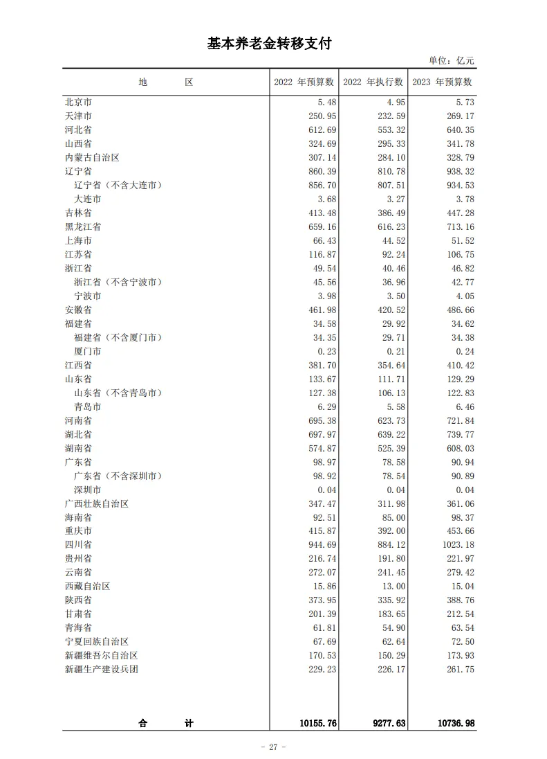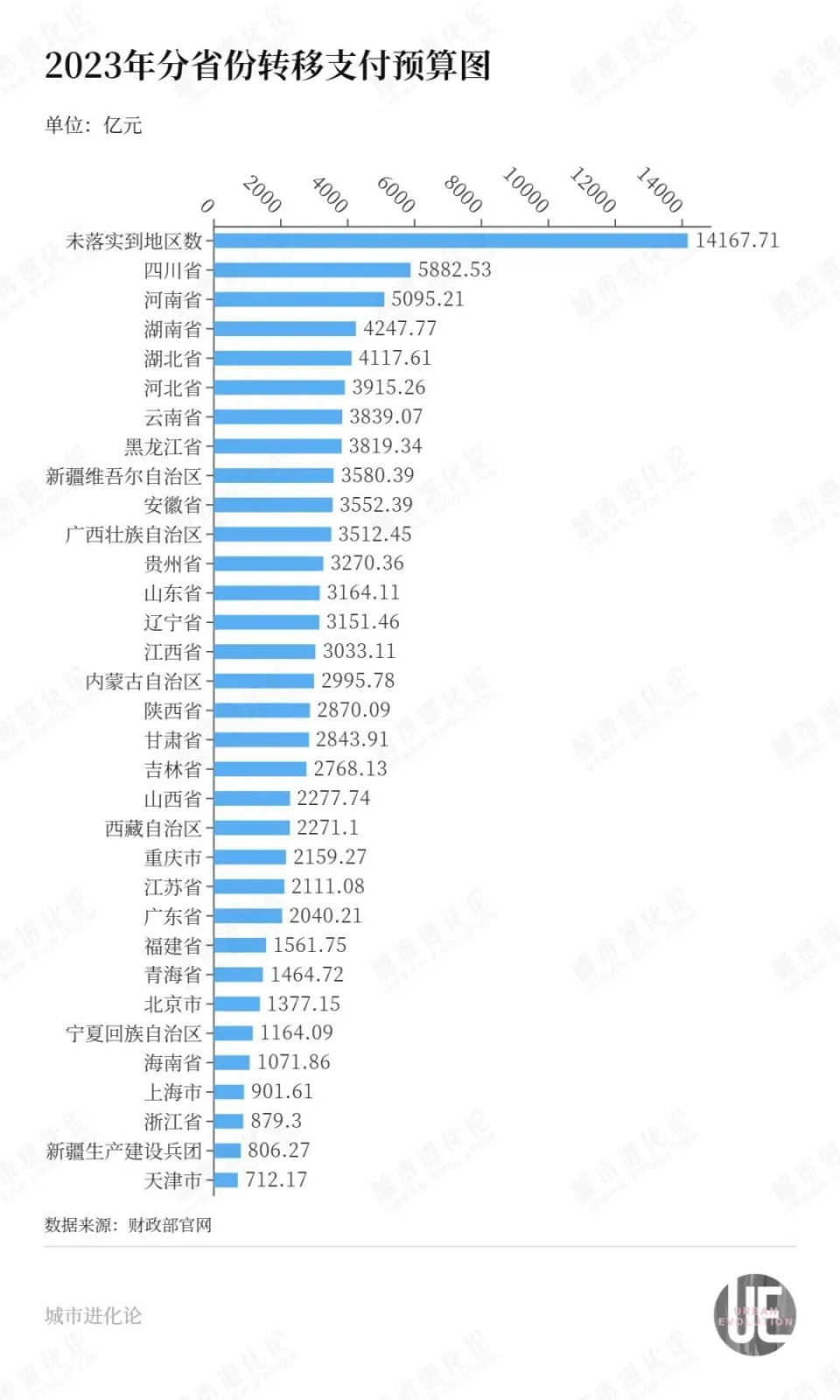 每经记者:吴林静每经编辑:杨欢 2023年中心财务预算于近期公开,这当中,中心对地方的财务支持数据受到关注。 财务部部长刘昆提到,本年要实验“积极的财务政策”,“积极”的体现之一是“在推动财力下沉上加力,进一步加强中心对地方的转移付出,并向困难地区和欠发达地区倾斜”。 根据本年中心财务预算,2023年中心对地方转移付出的预算总数为100625亿元,在客岁的根本上又增长了3.6%,还初次突破了10万亿元的关口。 究竟上,为缓解地方财务收支抵牾、支持地方减税降费和兜底下层“三保”付出等,中心对地方的转移付出不停在增长。2020年以来,在中心一样平常公共预算付出中,对地方转移付出的占比不停保持在70%以上。 本年,10万亿元的资金“再分配”,会撒向哪些范畴、哪些地区,城叔翻开了中心的“账本”。 再创新高中心一样平常公共预算付出,共分三大部分,一个是中心本级付出,一个是中心预备费,另有一个就是中心对地方转移付出。 由于各省份直接的财务收入本领存在差异,中心为实现各个地方的公共服务程度划一,便增补创建了财务转移付出制度。分税制改革后,这一部分不停占据着中心财务付出的“大头”。 和GDP、财务收入飞速增长对应的是,转移付出的力度在不停加强。已往十年,转移付出所占比重在70%上下浮动,付出的总量则从五万亿元增长到了2023年的十万亿元。 不停攀升的转移付出,“一方面,与我国的财务管理体制有关。我国实验的是财务会合管理体制,在这种体制下,大额的会合性的税种会合在中心政府,中心政府通过大量的转移付出办理地方政府的收支不均衡标题。” 政府预算专家、上海财经大学传授邓淑莲告诉城叔,“另一方面,比年我国经济增长放缓,特别是疫情三年,地方政府收入大幅度淘汰,而付出不减反增,收支抵牾突出。转移付出是缓解地方政府收支压力的一个有效本领。” 10万亿元的一样平常公共预算转移付出,又进一步分为一样平常性转移付出和专项转移付出。 一样平常性转移付出是指中心政府对有财力缺口的地方政府举行补贴,以均衡地区间根本财力设置为目的,2023年这笔资金总额为8.71万亿元,也是创下新高。 专项转移付出则据实安排,资金定向精准使用,2023年这笔资金总额约8500亿元,在往年根本上提拔了千亿元左右。 同时,连续客岁政策,本年继续设有“支持下层落实减税降费和重点民生等专项转移付出”,从客岁的8000亿元调减至5000亿元。 以上三方面的转移付出加起来,就构成了本年巨大的一样平常公共预算转移付出规模,流向各个省份以及操持单列市。 省级分配具体看分地区的资金分配情况。 自2015年财务部公布中心对地方转移付出分地区的情况以来,四川、河南得到的资金量不停排在数一数二的位置。 从往年来看,四川、河南两省合计得到的一样平常公共预算转移付出数,通常占当年中心对地方一样平常公共预算转移付出总额的10%以上。2023年,中心给四川的预算为5882.5亿元,给河南的预算为5095亿元。 排在第三名的“常客”是湖南省,只有2019年和2020年破例,被云南、湖北凌驾。2023年,湖南继续位列第三,得到一样平常性转移付出的预算为4248亿元。本年转移付出预算凌驾4000亿元的省份,另有湖北。 得到中心转移付出预算凌驾3000亿元的,有10个省份;凌驾2000亿元的,有9个省份;在1000亿元以上的,有5个省份。上海、浙江、天津和新疆生产创建兵团得到的转移付出预算,则不敷千亿元。 10万亿元的转移付出预算中,现在有1.4万亿元没有落实到具体地区,会根据当年情况举行分配调解。比如,客岁底中心对四川现实实验的转移付出资金凌驾了6000亿元,比年初的预算数多了1000亿元有余,为地方的预算付出提供支持。 众所周知,转移付出是二次分配,初志是推动地区均衡发展和根本公服均等化。创收本领强的经济发达地区,从中心拿到的转移付出少,几个不敷千亿元的省份,约莫只有“头部省份”的1/6到1/7。得到转移付出额度靠前的,重要是中部和西部地区,老小边穷片区较多,也是生齿大省,以是川豫湘排在前三,也不不测。 凌驾3000亿元的省份,出现了东部地区的河北(3915亿元)、山东(3164亿元)、江西(3033亿元)。在邓淑莲看来,这几个省份得到转移付出额度比力靠前,生齿总量大、地区发展洼地都是影响因素,另有比力关键的是“这些省份比年的经济发展不敷以提供富足的财务收入,满意日益增长的财务付出,收支抵牾较为突出”。 从本年1-2月各省份财务收入情况来看,大部分已实现了正增长,财务收入前10位的省份中,山东是唯一财务收入继续出现负增长的地区。 公共服务公共财务的告急功能是实现人均公共服务的均等化,转移付出制度的操持,则是让欠发达地区也能提供公共服务与公共产物。 中心对地方转移付出,靠的是各个项目来支持,确保资金流向该发力的范畴。 从2023年中心预算表来看,中心对地方转移付出的款式共分了三个大类、32个中类,此中“共同财务事权转移付出”再细分了54个小项。2023年的“账本”,共计公开了此中46项转移付出项目的分地区情况。 转移付出怎样给地方的根本医疗、教导、养老提供财力支持,城叔从细分项目中看到了部分相干资金在各地区的分布情况。 先看教导。转移付出项目中与教导相干的资金,涉及了学前、任务教导、高中、高校、西席培训、弟子资助、特别教导等环节,总