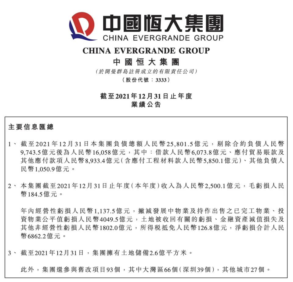 恒大的财报,姗姗来迟。 7月17日晚,中国恒大团体发布了2021年、2022年业绩公告以及2022年中期业绩公告。 恒大这份财报,有两组数据直接震惊市场。 第一,中国恒大2021年、2022年度合计净亏损金额到达8120亿元; 第二,停止2022年底,负债总额2.44万亿元。剔除合约负债7210.2亿元后为1.72万亿元,较2021年剔除合约负债后的负债规模1.61万亿元,同比增长1105.9亿元。 别的值得注意的是,现在中国恒大的净资产为负。 恒大2021年以及2022年财报发布之后,#恒大总负债2.4万亿#词条敏捷冲上了热搜,这一天文数字的背后,是恒大系财务“洞穴”最直观的表现。 从财报详细来看,2022年中国恒大收入为2300.7亿元,毛利249.9亿元,谋划性亏损433.9亿元。而恒大地盘被收回有关的亏损、金融资产减值丧失及其他非谋划性亏损693.7亿元。 其累计净亏损合计到达了1258.1亿元。 根据财务核算,恒大团体2021年总资产为21071亿元,而总负债为25802亿元,净资产约为负4731亿元;2022年度,中国恒大总资产约为18383亿元,总负债约为24374亿元,净资产约为负5991亿元。 也就是说中国恒大现在处于严峻的资不抵债的状态。 固然,对于恒大所面对的题目,最“慌”还属债权人。现在恒大的境外债务重组仍旧在迟钝的推进,根据恒大团体预计,2023年7月应该会有渴望。 时间推进到三年多从前,其时恒大的题目还未显现。 以是许家印大手笔投资了汽车产业,固然在地产不景气的大配景下,投资新能源汽车这个向阳行业本没有错,但是错就错在了时间点不对。 由于汽车行业是一个重资产行业,其对于资金的需求量之大,一样平常企业自己就难以招架,根据业内人士预计,现在新能源汽车行业的准入门槛约莫为400亿。 在没有任何技能配景的加持下,许家印其时选择了并购+拼集的模式,范例的就是投资FF败北之后,许家印百亿收购汽车产业链企业。固然如许做的并非许家印一人,尚有宝能系的姚振华。不外从当下的来看,效果似乎都不算很好。 本来想通过造车做大企业估值的方式,来补充恒大系的洞穴,但是许家印没有推测的是,新能源汽车的风口云云短暂。这就导致了本来被给予厚望的新能源汽车不光没能帮到团体,反倒成为了一个“拖油瓶”。 从效果来看,恒大系的恒大粮油、恒大足球、恒大康健、恒大汽车、恒大冰泉这些与地产无关的多元化业务终极都不怎么赢利。 也正是由于这些业务加速了恒大系的坠落。 2021年之后,假如恒大不在其他板块冒进,而是选择猛踩“刹车”,尽力保交楼以及出售手中的一些优质资产,大概恒大就不会走到本日这一步。 显然,留给许家印的时间,只有两个月时间。由于根据港交所相干规定,对于一连停牌凌驾18个月的公司,港交所可以对其举行摘牌。而恒大间隔18个月末了的限期,就仅仅只剩下了两个月,现在恒大仍旧处于停牌状态。 但恒大在关键的时间节点举行财报披露,自己已经有了“自救”的意思,但是恒大的题目仍旧困难重重,债务题目仍旧难懂。 综合而言,侃见财经以为,恒大系到现在必要归还的债务不停的再增长,且随着债务规模越来越大,其要归还的利钱也会越来越多,这就像一个无底的深渊,多少现金流都能被“吞噬”,对于这些负债该怎么还,似乎已成为了一个“无解”的题目。许家印曾多次夸大,不能平沽资产。只是不知道,现在许家印手里尚有什么牌。 |
