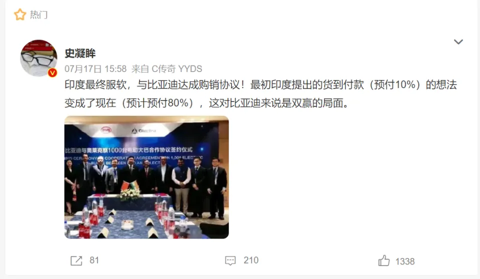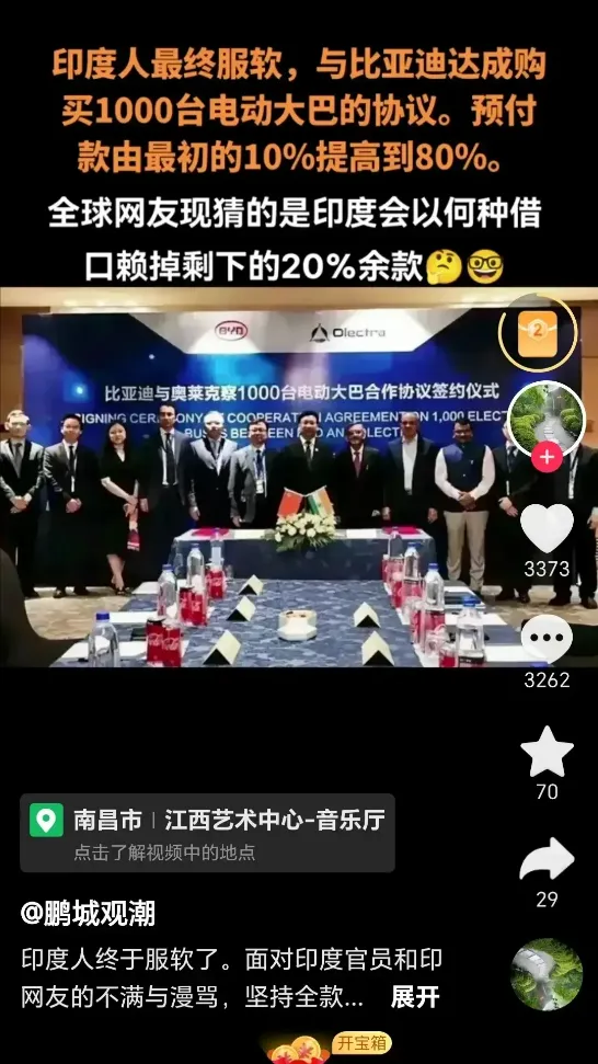 文/王新喜 前段时间,印度政府向比亚迪下了一张代价20亿元的大单,要求比亚迪提供1000辆电动巴士。在最初的会商中,印度提出了货到付款的条件,只愿付出预付款的10%。 在印度看来,预付10%,能以最小的投入得到最优质的产物与服务,同时却避开全部大概的贫苦,包罗延期付出、质量标题乃至退货等。但比亚迪要责备额付款后才会买卖业务。 此举招致印方猛烈不满,印度商业和工业部长皮尤什·戈亚尔以及财政部长尼尔马拉·西塔拉曼纷纷出来求全非难比亚迪,以为比亚迪“冲破了规则”,侵害了印度的商业信誉,从而导致印度在环球范围内遭受了无形的丧失。 只管印度猛烈不满,比亚迪并没有改变要求。 现在根据最新的消息,印度方面妥协了。比亚迪与印度告竣1000辆电动大巴互助协议,印度方面的预付款由10%提至80%。现在这个消息是由鹏城观潮发布,厥后包罗着名军事博主史凝眸、广州恒大球迷论坛网等均转发了这个消息,引发了许多讨论。 从这个效果来看,意味着不愿妥协的比亚迪,换回了印度的妥协。预付80%,对于比亚迪来说,已经是一个最好的效果,但比亚迪仍旧不可大意。 印度为何想通了? 付80%的预付款引进比亚迪电动车,印度算开了先例,毕竟印度一样寻常买东西都是10%的定金就把对方的货搞过来了,笔者看来,这背后有几个缘故原由。 一方面是看到了比亚迪倔强的态度,不得已改变规则顺应比亚迪的规则,毕竟,从现在来看,似乎印度人更须要比亚迪这笔订单,也渴望与比亚迪的互助有一个好的开端。而在电动大巴方面,能满足印度对产物格量与代价要求的,比亚迪或也是不二之选。 毕竟,比亚迪纯电动大巴的足迹已遍布环球70多个国家和地域,在日本欧洲等市场,比亚迪的电动大巴都非常有竞争力。2018年,比亚迪就在印度推出了K9,这也是印度首款纯电巴士,现在已经在11个都会贩卖800多辆。从产物与技能层面来看,比亚迪有它不可更换性的一面。 其次,现在富士康退出印度芯片之后,据路透社的消息,比亚迪已向印度政府提交了一份10亿美元的投资提案,拟申请与总部位于海德拉巴的印度私营企业基建巨头Megha组建电动汽车合资企业。 比亚迪投入10亿美金印度建厂,外界争议很大,许多人都不看好。毕竟,在中国厂商之外,包罗福特、沃达丰、沃尔玛、诺基亚、凯恩能源、美花旗银行、三星、IBM、亚马逊、微软等大量跨国巨头都遭遇过印度的巨额罚款。印度已往坑外资的种种举动,正在让各国网友对印度存在鉴戒生理。 那么印度要制止富士康中途退出的事变重演,须要展示诚意,因此,80%的预付款相当于也给比亚迪在印度建厂吃了一颗放心丸。 从这个角度来看,印度实在也看到了近期从小米到富士康的一系列变乱,导致现在其国际商誉正在受损。而比亚迪提出的全款付出的要求,摆明白对印度政府不信托,毕竟上,这个事变引发了国际上的关注,不少外国网友力挺比亚迪。 有日本网友指出,日本企业有一个共识就是,私人企业与印度企业或政府签订订单时必须要收到全额货款后才华运往印度,否则有大概收不到余款,而且你的商品无法退货。 尤其是近期富士康的退出,美媒以为,这是对印度政府科技制造强国筹划的打击,印度意识到须要修补它的国际形象。 从这个角度来看,印度乐意出80%的预付款,或是试图向国际市场表明,印度依然是讲信誉与原则的,与印度做买卖,并非外界所说的那么坑,这是一种招商引资的姿态,重新挽回印度的信誉之举。 20%的款是否能收到?比亚迪仍不可大意 对于这个消息出来之后,不少网友挖苦,印度人筹划以什么捏词赖掉剩下的20%呢? 假如比亚迪担当80%预付款,那么剩下的20%,我想比亚迪大概也做好了最坏的筹划。 总的来说,这笔订单能让印度预付80%,也算是印度冲破了规则,比亚迪在印度得到的1000台电动巴士的订单,也是比亚迪得到过的最大纯电动车外洋订单,对于比亚迪开发印度市场,开了一个好头。 毕竟上,现在比亚迪已经全面布局印度市场,在印度多个告急都会比如说孟买、班加罗尔等输出纯电动巴士。据干系数据统计,比亚迪纯电动大巴占印度纯电动大巴80%的市场份额。 总的来说,比亚迪依然要步步为营,印度显现了它的诚意,比亚迪又不可全信。 比亚迪的举动阐明,与印度做买卖,要有本身的底线与原则,懂得订定本身的规则,让对方跟着你的规则走,而不是完全被动被印度的规则牵着走。 不可低估印度引入技能厂商,成为下一个天下工厂的执念 印度看上比亚迪,实在也是看上了新能源汽车的将来,比亚迪是中国新能源汽车的龙头车企,而电动车和传统油车差别,其产业链和核心技能上风现在更多在中国厂商这边,从印度引入外资的计谋中,实在他们更倾向于引入真正有技能力气的厂商。 比如说为了苹果供应链完备落地印度,印度对苹果优劣常客气的,毕竟,苹果是技能型领头羊厂商,有环球化的供应链体系,印度有长期主义筹划,寄渴望苹果能动员印度的高端制造发展。 现在印度也在与马斯克会商,已经在筹划引入特斯拉。而富士康要求印度补贴的诉求之以是没有告竣,由于在芯片范畴,富士康本身是没有芯片制造技能的,印度是渴望通过富士康去与意法半导领会商,把真正的技能厂商——意法半导体引入印度,而意法半导体拒绝了富士康的要求,这意味着富士康在芯片项目上无法带来真正的技能。这也是印度不给补贴的告急缘故原由