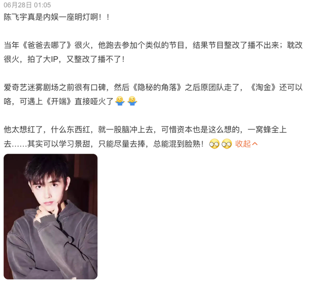 《星汉辉煌光耀》VS《苍兰诀》,谁赢了? 不管结果怎样,输家都是剧王扑了的酷,赢家都是猴系脸。 这个暑假,谁没为一些猴发过疯! 追《星汉辉煌光耀》,着迷于猴王1.0吴磊扮演的081——疯批男主天花板。 对吴磊,这次要刮目相看。 刚追剧那会,比力敬佩的是一些男友力和cp感。 但看到大婚前的复仇戏,非常难过地get到了吴磊的演出。 从前总以为吴磊在用嘴巴演戏,但这场戏吴磊有给到惊喜。 杀人时,他狠辣疯狂,带着满腔恨意,081,果然是疯子。 屠了凌家满门后,他边哭边笑,这个笑让人脊背发凉。 既有孤城一案的血海深仇终于得报的快感,又惆怅本身今后再无退路,也放弃了最爱的程少商。 本届很忙的网友,这厢为081狠狠哭泣,那厢又灵敏爱上了猴王2.0王鹤棣。 《苍兰诀》热度破万,河堤更成为年度第一爆。 从前出门无人问,现在出行都是这个架势。 粉丝还大喊着“尊上威武”。 河堤的出圈,冲破了废柴公司的寂静。 人在前面红,流程在背面追:人是上午红的,杂志是中午卖完的,工作室下战书建立的,员工是晚上招的。 得了诀症的朋侪们管煤气叫业火,“棣爸油炸”成了网红打卡地。 每年暑期档,都会杀出一批黑马,都会有一个天降紫微男星,像朱一龙、白宇、龚俊、李现、王一博等,长相从兔系脸、马系脸到犬系脸、鼠系脸,各有千秋。 现在,随着吴磊、王鹤棣的爆红,猴系不但成了一个热词,猴系脸艺人也进入大众视野。 这两人不但长得像猴,还都演过猴。 他,王鹤棣,更是孙悟空的老实爱好者,《桃花坞》给他打的title是【猴系交际达人】。 王传君:我以为他就是只猴子。 再一看95代男星,原来内娱早已成了花果山。 不但有两大猴王坐镇,丁禹兮、曾舜晞、宋威龙、陈飞宇、敖瑞鹏等不少男星都是猴系脸。 各人各有各的猴法,猴的水平也不—— 吴磊、王鹤棣、敖瑞鹏是大众印象中的猴,三人还能来个消消乐。 丁禹兮不但撞脸小夫,更是大嘴猴的代表。 继续了老爸陈凯歌基因的陈飞宇,同样继续了他的猿猴特性。 为什么95生有那么多猴系脸? 实在,猴系艺人的占比本就不低,究竟各人从前都是灵长类动物,长得像也无可厚非。 只是由于从前犬系男星风靡一时,一众猴脸男星倒显得不那么突出了。 什么是猴系脸? 缺点很明显:面颊略凹,人中长,轻微凸嘴,上唇薄,侧脸虐。 但上风在于:骨相立体,眉骨高,眉眼深邃,英气硬朗,比力有辨识度。 而在具备浓颜和立体五官的上风下,产出帅哥的几率也就高了许多。 年轻时的陈冠希,被网友评为猴系长相的天花板。 正在到场披哥的周柏豪,同样是个猴脸帅哥。 20多岁的陈浩民,演起真猴那就是美猴王。 金城武是有争议的猴脸。 没那么猴,但又多多少少带了些猴的味道。 这种浓颜长相下,就算长得不敷帅,只要突出眉眼的上风,就能让人忽略骨相上的短板,成为氛围帅哥。 45度脸,很告急。 固然,就算五官出了点不对,也丑不到哪去。 在自身硬件根本过关的环境下,猴系男艺人的乐成,还要借助一些外力。 有人资源傍身,拼尽尽力蹭每一个热度,到末了,他燃烧了本身,成了娱乐圈明灯。 但也有人,选对了女主,走上人生顶峰—— 说的就是王鹤棣、吴磊、宋威龙和丁禹兮。 四大猴王的火,除了要有60分的脚本,更离不开cp的助力,且互助的都是猪系脸甜妹。 没有骂人的意思,猪系脸在这是褒义哈:长了一张圆脸,五官偏圆润,脸部胶原卵白富足,面部骨骼感不强。 这类女星本就是百搭体质,轻易和男演员有cp感,有观众缘。 配上猴系脸,更优劣常互补的搭配。 一个是棱角分明浓眉大眼的酷仔,一个面部柔和的可爱甜妹,这不就是最好嗑的cp么? 内娱四大猴王,更是逐一证实白—— 男猴女猪,爆款准则! 2020年,先有宋威龙、丁禹兮打头阵。 宋威龙,固然是个木头帅哥,贡献的是AI演技,但“霄尖脑袋”照旧甜进了许多观众内心。 丁禹兮和赵露思搭档《陈芊芊》热度直飙。 固然厥后由于没能端平一碗水,惨遭cpf痛骂,但也乐成在内娱有了姓名。 客岁他和虞书欣互助的《月光变奏曲》也很好嗑,小小爆。 这个暑假,吴磊、王鹤棣又一次印证这个定律。 而他,丁禹兮,也在一个暑假丢了两个妻子,从五月男友变身成了八月前夫。 她,曾是他的甜蜜小编辑,现在却成了东方青苍的小兰花。 迩来,热搜根本都在为“棣欣引力”发了疯,网友从剧里嗑到了剧外,哪怕河堤另有个谈了六年的绯闻女友。 一个拽少,一个甜妹,不管是长相照旧性格都写着般配,剧组花絮甜甜甜。 再加上,各种合体采访、合体直播、合体杂志应有尽有,物料多都嗑不完。 哪怕两人在直播中吵了架,制片人也能立马了局表明: 诶呀!xql吵架而已!已经哄好啦! 迩来两人合体直播还在xxj发誓:我们本日肯定不会打斗! 假如说“棣欣引力”的出圈有营销的加成,那么“吴露可逃”更多的是靠一些网友的脑补,也更印证了男猴女猪设置的强大。 早在吴磊赵露思互助《长歌行》时,固然各有官配,但一张吴磊挟持赵露思的动图,已让网友嗑生嗑死。 二搭之后,“吴露可逃”乐成登顶cp超话榜首。 热知识:剧播之后,两边并没有任何合体业务,没私下合照,没私下会餐,只是共同剧方做了两场直播,唯一合体是开播之前的发布会和今晚的宝格丽晚会,但晚会的甜蜜合照照旧p的。 两边微博仅有的互动,是七夕业务请各人喝了杯喜酒。 但这并不妨碍观众嗑真人哈。 嗑完花絮,还能自产自嗑,当代网友的p图技能真的让我
