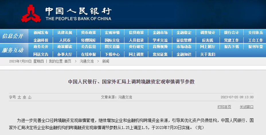 在岸人民币兑美元汇率开盘7.2258,今后一起升破7.22、7.21、7.20、7.19、7.18,制止发稿报7.1778,日内涨超400个基点。同时,离岸人民币兑美元汇率也收复7.20、7.19两大关口,制止发稿报7.1820,一度升破7.18,日内涨超500个基点。 20日早间,人民银行发布公告称,为进一步美满全口径跨境融资宏观审慎管理,继续增长企业和金融机构跨境资金泉源,引导其优化资产负债布局,中国人民银行、国家外汇局决定将企业和金融机构的跨境融资宏观审慎调治参数从1.25上调至1.5,于7月20日实行。 图:央行网站截图 东方金诚首席宏观分析师王青及高级分析师冯琳表现,跨境融资宏观审慎调治参数越高,意味着企业和金融机构可跨境融资的上限越高。这既有利于中小企业、民营企业更好地利用国际国内多种渠道筹集资金,也会直接增长境内美元运动性,缓解人民币贬值压力。 光大银行金融市场部宏观研究员周茂华表现,企业跨境融资宏观审慎调治参数上调,意味着境内企业跨境融资敞口空间有所扩大,增长外资流入,相应地我国团体外债规模有所增长,反之亦然。 中国民生银行首席经济学家温彬表现,上调该参数可有利于跨境资金流入,优化资产负债布局。同时,随着境表里汇资金增长后,相应结汇需求增长,也能起到稳汇率的结果。 外汇市场既没有“大妈”,也没有“大鳄” 央行副行长刘国强7月14日在2023年上半年金融统计数据情况消息发布会上表现,从当前看,人民币汇率固然有所贬值,但是没有偏离根本面,中国人民银行也已经综合采取步伐管理预期,外汇市场运行安稳,金融机构、企业、住民的结售汇举动理性有序,市场预期根本稳固。 “用一句俗话说,如今外汇市场既没有‘大妈’,也没有‘大鳄’。”刘国强表现,总体看,有“三个大盘”作支持,在市场化的汇率形成机制下,人民币汇率不会出现“单边市”,仍然会保持双向颠簸、动态均衡。 刘国强表现,下一步,人民银行将以保持人民币汇率在公道均衡水平上根本稳固为目的,以预期管理为焦点,综合施策、稳固预期,须要的时间对市场顺周期、单边举动举行纠偏,果断防范汇率大起大落。 从宏观经济大盘看,我国经济恒久向好的根本面没有变。随着经济循环流畅,高质量发展取得新突破,我国经济运行将连续团体好转。 从国际收支大盘看,我国经常项目顺差保持在2%左右的适度水平,跨境资源运动根本均衡。近期,境外资金投资境内债券继续保持净流入态势。 从储备大盘看,我国外汇储备富足,余额仍然稳居天下第一。而且这个余额是比力高的,凌驾了3万亿美元。 稳汇率有哪些工具? 招商宏观研报指出,回首2015年以来人民银利用用的汇率预期管理工具,大抵可以分为以下三类:汇率沟通、代价形成机制调解以及广义的外汇管理政策。 1、汇率沟通 汇率沟通是指钱币政府通过各种渠道与市场主体举行互换,转达稳汇率的信号,以到达引导市场预期,实现币值稳固的政策目的。 汇率沟通通常包罗口头沟通和书面沟通两种情势。前者重要是相干的紧张领导人在有关聚会会议或公共场所就汇率变更发表的意见,以政策解读、信息公开或消息发布等方式构成引导机制;后者则是通过《钱币政策实验陈诉》、《钱币政策委员会例会纪要》等书面载体,开释稳固预期的信号。 2、代价形成机制调解 人民币汇率代价形成机制的调解目的重要有两个:一是人民币汇率双向浮动区间;二是人民币汇率中央价形成机制。 关于人民币汇率双向浮动区间,自2005年汇改之后,央行择机扩大汇率浮动区间,不绝增强汇率弹性,外汇市场美元兑人民币交易业务价日浮动幅度从2007年的千分之三徐徐扩大至如今的百分之二。 关于人民币汇率中央价形成机制,2017年5月央行在中央价报价模子中引入了逆周期因子,将中央价订价机制扩展为“收盘汇率+一篮子钱币汇率变革+逆周期因子”。 从现实利用角度来看,逆周期因子是人民币贬值期间的紧张调治工具。比方: 2018年,中美商业摩擦触发人民币贬值压力,人民币汇率显着偏离经济根本面,从靠近6.20的高位快速走贬,且与美元指数出现显着的分化:无论美元指数维持稳固还是走弱,人民币始终表现出显着的快速贬值趋势,尤其是6月至8月的短短32个交易业务日,贬值幅度到达6%。 同年8月,中国外汇交易业务中央发布消息称,受美元指数走强和商业摩擦等因素影响,外汇市场出现了一些顺周期举动,人民币对美元中央价报价行重启“逆周期因子”。“逆周期因子”重启,有效稳固了市场预期,消息发布后,离岸人民币涨幅凌驾600点,在岸人民币的涨幅也超300点。 3、外汇管理政策 外汇管理政策指钱币政府以调解钱币政策间接干预或直接加入外汇市场交易外汇等方式影响汇率。 1)间接受理 间接受理重要通过利率、准备金率及商业信贷等本领加入外汇控制,具体又根据其重要的作用范围分为境内工具(包罗外汇存款准备金和外汇风险准备金率)与跨境工具(包罗全口径跨境融资宏观审慎管理和离岸人民币池的缩放)。 2)直接受理 相比于间接受理,直接受理的本领更显“简单粗暴”,结果也更立竿见影,人民银行一方面可以直接加入市场交易业务,另一方面可以通过资源管制限定资源跨境运动。 2015年“8·11”汇改后,外汇市场出现剧烈颠簸,短短两个交易业务日内,人民币对美元贬值累计凌驾3.5%,同时引发了较大规模的资源外逃和人民币贬值的恶性循