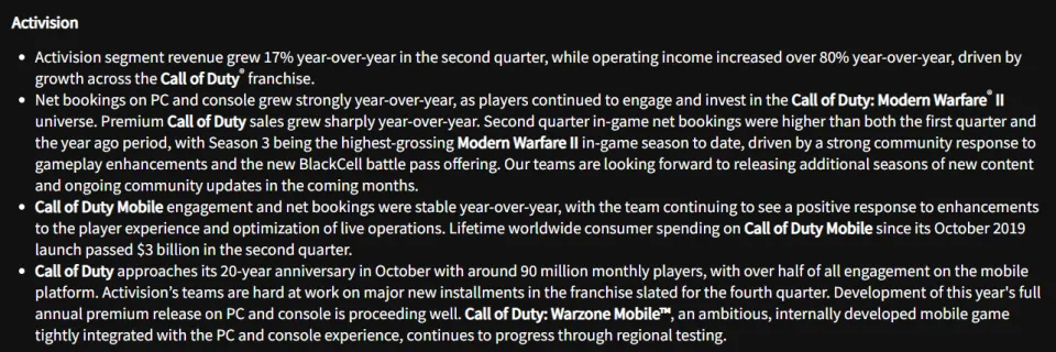 IT之家 7 月 20 日消息,动视暴雪在财报中确认,《任务召唤 2023》开辟希望顺遂,预计将于本年第四序度(10-12 月)推出。 动视暴雪体现:“动视的团队正在尽力打造系列游戏的全新篇章,操持在第四序度发布,该游戏在 PC 和主机平台上的开辟希望顺遂。” 动视暴雪还透露,《任务召唤:战区手游》与 PC 和主机版体验精密团结,现在仍在举行地域测试。 据报道,本年的《任务召唤》是客岁《当代战役 2》的续作,由 Sledgehammer Games 工作室主导开辟。动视暴雪本周早些时间好像证实了这一消息,该公司体现《当代战役 2》的脚色、武器和捆绑包将连续到本年的系列作品中。据称,《当代战役 2》的舆图和模式也将移植到新作中。 动视暴雪周二体现,关于本年游戏的初次公布活动的第一批细节将在《当代战役 2》和《战区 2》第五季的公告中发布,预计将于 8 月初上线。 该公司在周三的财报中体现:“《任务召唤》10 月份即将迎来 20 周年怀念日,现在每月有约 9000 万玩家,此中高出一半的玩家在移动平台上加入。”动视暴雪还声称,《任务召唤:手游》自 2019 年 10 月推出以来,环球消耗者付出已高出 30 亿美元(IT之家备注:当前约 216.9 亿元人民币)。 微软与动视暴雪已签署协议,将完成收购买卖业务的停止日期延伸至 10 月 18 日。两家公司仍在寻求英国竞争和市场管理局(CMA)对买卖业务的羁系允许,这是拦阻该买卖业务完成的末了一个庞大停滞。 |