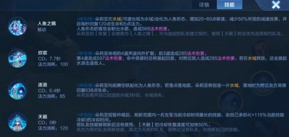 王者光彩自公测到如今已经七年多,如今也上线了一百多个好汉,五百多个皮肤了。我们都知道,每个赛季,一样平常都会有一两个新好汉上线,而新好汉在上线正式服之前,都会在体验服先测试。如今体验服已经没有新好汉了,克日,官方也终于官宣,新好汉朵莉亚将上线体验服了。 从官方曝光的资料中我们可以看到,新好汉朵莉亚是一名辅助好汉,形状非常的甜蜜可爱,而且照旧峡谷里的第一个尤物鱼,因此有网友也讥讽,同为辅助好汉的瑶瑶公主职位岌岌可危了。 体验服在21号也举行了更新,此次更新,新好汉朵莉亚也正式上线了,而在上线之后,朵莉亚的技能也全部曝光了,遇水后更是能直接变身成尤物鱼,非常的故意思,下面我们一起去相识一下新好汉朵莉亚的技能吧。 起首是被动,朵莉亚在水域中会变身成尤物鱼,从而得到移速加成,而且还会镌汰所受到的减速效果,而且还会每秒回血回蓝,而且人鱼形态的朵莉亚,普攻还会射出水箭,并对目的造成法术伤害。同时有一点要特殊注意,朵莉亚的【规复】会酿成【人鱼之赐】,朵莉亚可以和一名队友创建左券关系。 朵莉亚的一技能·欢歌。朵莉亚会以自身为中心,向附近发出四道声波,第四道声波的伤害会更高,而且在掷中仇人之后,还会有覆信,同时还会对附近的仇人造成伤害,而如果在水域中,第四道声波还会对仇人造成击退效果。 朵莉亚的二技能·逐浪。朵莉亚会化身成尤物鱼,如果落点是地面,朵莉亚则会创造出一片水域,同时还会对附近的友方好汉提供回血效果,如果朵莉亚脱离自己创造的水域凌驾3秒,水域就会自己消散。 朵莉亚的三技能·天籁。朵莉亚在开释三技能的时间,会革新范围内一名友军当前冷却时间最长的技能,但与此同时,朵莉亚三技能的冷却时间则会酿成4(+115%当前技能冷却)的冷却时间,如果队友没有技能可以革新,朵莉亚的冷却规复速率就会加速50%。值得注意的是,朵莉亚的三技能会优先为创建左券的队友革新技能,其次是无左券的队友,如果附近没有队友,则会革新自己的技能。 朵莉亚从技能上看,照旧比力简朴的,不外由于大招的关系,可玩性也非常高,好比搭配鲁班七号、马可波罗、戈娅、蒙伢等,开释大招之后,他们可以革新两个大招出来,伤害就非常离谱了,而如果搭配吕布、廉颇、苏列这种开团的打团战,团战更是美如画了。 话说,小同伴们,你们以为朵莉亚搭配什么好汉最好呢?欢迎留言讨论! |