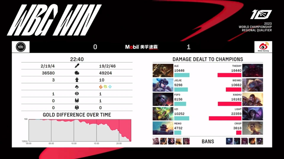 LPL夏日赛冒泡赛WBG和EDG的角逐,两边大战4局之后,WBG乐成以3-1的战绩击败EDG,确定以4号种子的身份晋级天下赛,EDG则是夏日赛到此为止! 第一局EDG上单鳄鱼,打野猪妹,中单小炮,下路泽丽加布隆;WBG上单奥恩,打野波比,中单杰斯,下路卡莎加芮尔。3分钟EDG下路2V2对线失误,weiwei波比赶来击杀Uzi泽丽,WBG拿下了一血。8分钟下路2V2失误,Uzi再次被击杀。13分钟WBG推掉了下路一血塔。前期EDG经济领先3K。中期19分钟WBG拿下听牌龙。20分钟EDG想要抓小虎杰斯,但是WBG其他人都增援过来,团战WBG大胜打出0换5团灭EDG,随后拿下第一条大龙。21分钟WBG推掉EDG中路高地后推下路,随后两边混战,theshy奥恩R到双C,WBG击杀EDG三人后,拿下第一局的胜利。首局两边输出如下,Light卡莎打出了全场最高伤害。 第二局EDG上单奥恩,打野芮尔,中单杰斯,下路霞加牛头;WBG上单鳄鱼,打野猪妹,中单沙皇,下路卡莎加女坦。3分钟下路2V2对拼,打出1换1,Light卡莎拿到了一血。5分钟EDG三人先在野区抓死weiwei猪妹,随后又去抓theshy鳄鱼,theshy鳄鱼1V3换掉FoFo杰斯,打出1换1。13分钟WBG推掉了EDG中路一血塔。前期WBG经济领先4K。中期21分钟WBG选择打大龙,EDG赶来两边4V4,WBG开Meiko牛头,EDG击杀WBG四人后,拿下第一条大龙,theshy鳄鱼则是推掉了EDG下路高地。23分钟EDG携带大龙buff推进时,直接越塔开团,WBG固然借助防御塔反打,但EDG伤害更高,团灭WBG后,一波拿下第二局的胜利。MVP给到了jiejie芮尔。 第三局WBG上单奥恩,打野芮尔,中单沙皇,下路厄斐琉斯加米利欧;EDG上单鳄鱼,打野猪妹,中单杰斯,下路门路加洛。4分钟theshy奥恩在上路单杀Ale鳄鱼,WBG拿下了一血。6分钟Ale鳄鱼在上路又单杀theshy奥恩。前期EDG推掉了下路一血塔。前期两边经济根本持平。中期20分钟WBG在中路先手开团,theshy奥恩R两人,Uzi卢锡安被秒,WBG击杀EDG两人后,拿下第一条大龙。23分钟WBG携带大龙buff从下路推进,击杀EDG四人后,拿下了第三局的胜利。 第四局EDG上单剑姬,打野猪妹,中单妖姬,下路韦鲁斯加泰坦;WBG上单奎桑提,打野波比,中单杰斯,下路卡莎加洛。开局1分钟EDG下路2V2对拼,Light卡莎被击杀,Uzi韦鲁斯拿下了一血。14分钟Ale剑姬推掉了上路一血塔。前期EDG经济领先5K。中期22分钟EDG拿下听牌龙。25分钟weiwei波比捶走Jiejie猪妹,WBG拿下第一条大龙。后期32分钟WBG在下路抓死Ale剑姬 后,拿下第二条大龙。33分钟WBG拿下听牌龙。36分钟EDG在野区找到时机击杀weiwei波比,随后两边混战,但是light卡莎伤害太高,打出1换3后,推掉了EDG中路高地,之后又击杀FoFo妖姬,一波竣事了角逐。 那么,对于这场角逐,你们有什么想说的吗?接待在批评区留言探究。 |